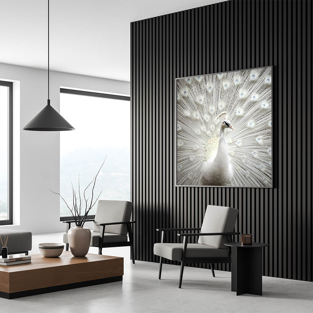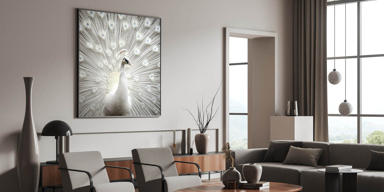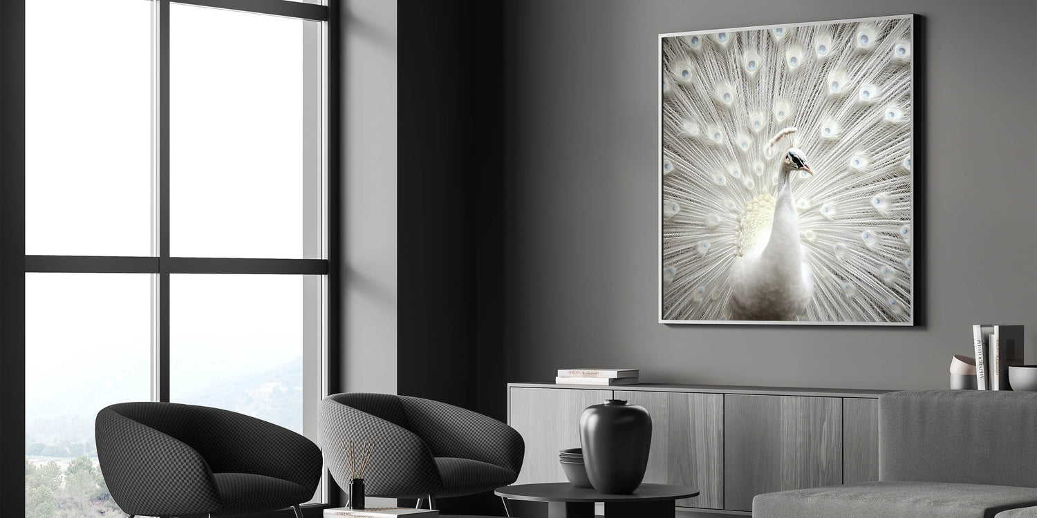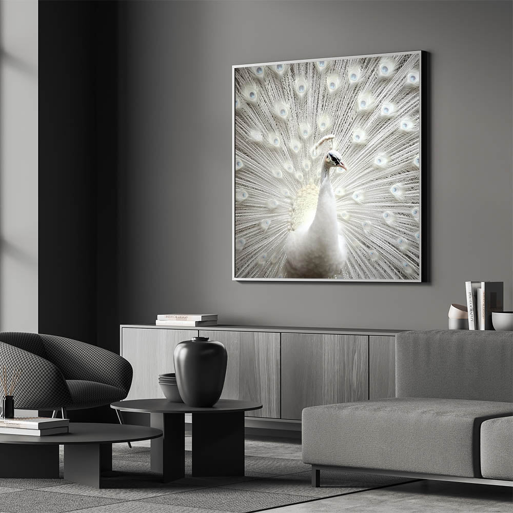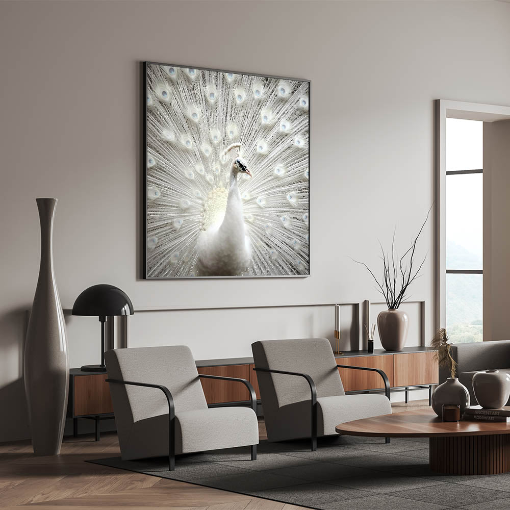 Add a touch of elegance and grace to your decor with this breathtaking close-up of a white peacock in full display. Part of the Nature Close Up Art collection, this Wildlife Photography Print captures the stunning symmetry and delicate beauty of the peacock’s feathers. A true celebration of nature’s artistry, this piece is perfect for those seeking timeless and refined wall art.