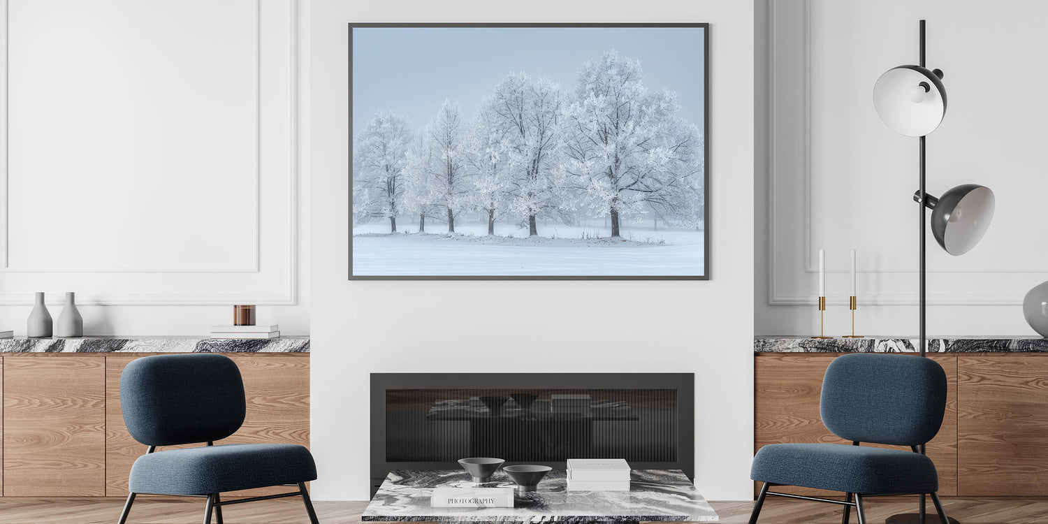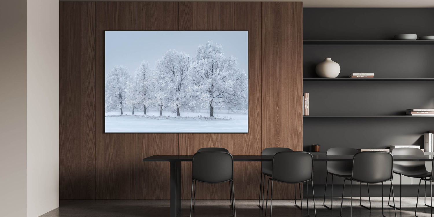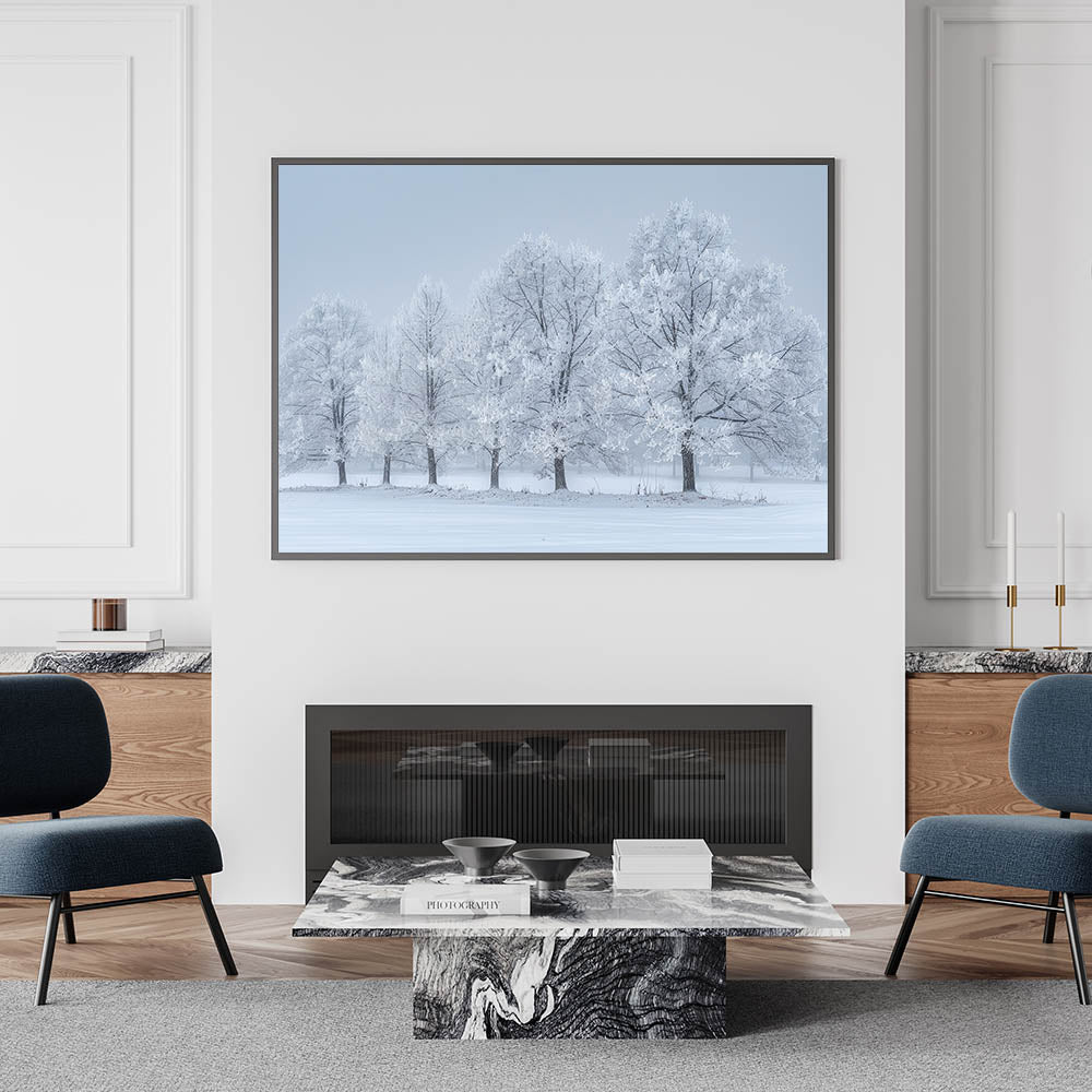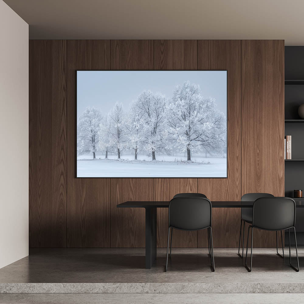 Bring a sense of peace and elegance to your workspace with this Office Wall Art, featuring a breathtaking row of frost-covered trees standing in a serene winter landscape. The crisp white tones, soft grays, and icy blues create a tranquil yet sophisticated ambiance, making this an ideal choice for Modern Office Art. This piece enhances Corporate Wall Decor, adding a refined and calming touch to professional settings such as executive offices, conference rooms, or reception areas.