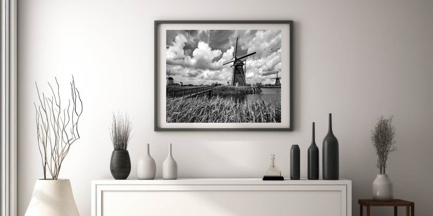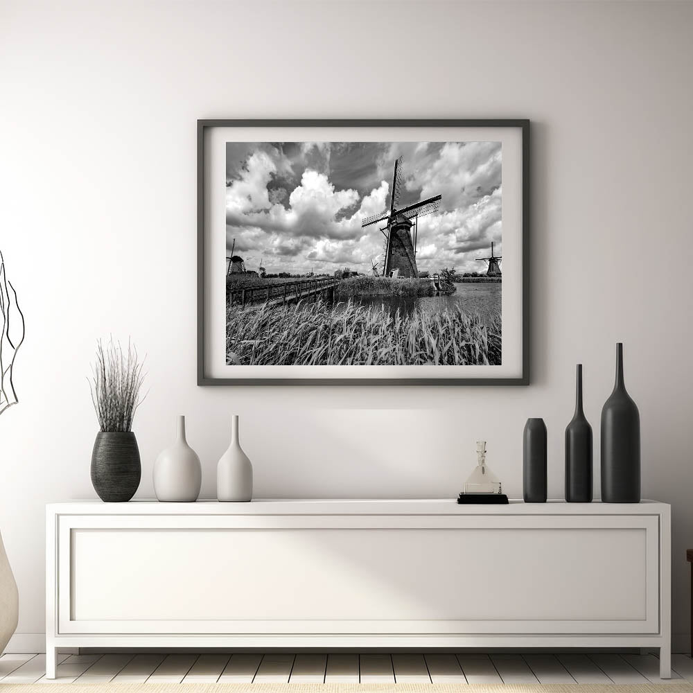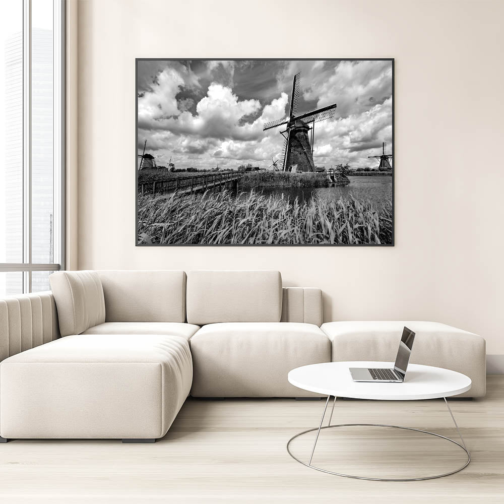 Step back in time with this stunning black and white windmill wall art, capturing the timeless beauty of classic windmills set against a dramatic sky. The monochrome palette adds depth and contrast, emphasizing the intricate details of the windmills and the surrounding landscape. This artwork is perfect for adding a touch of elegance and history to any room, whether it's your living room, bedroom, or office.