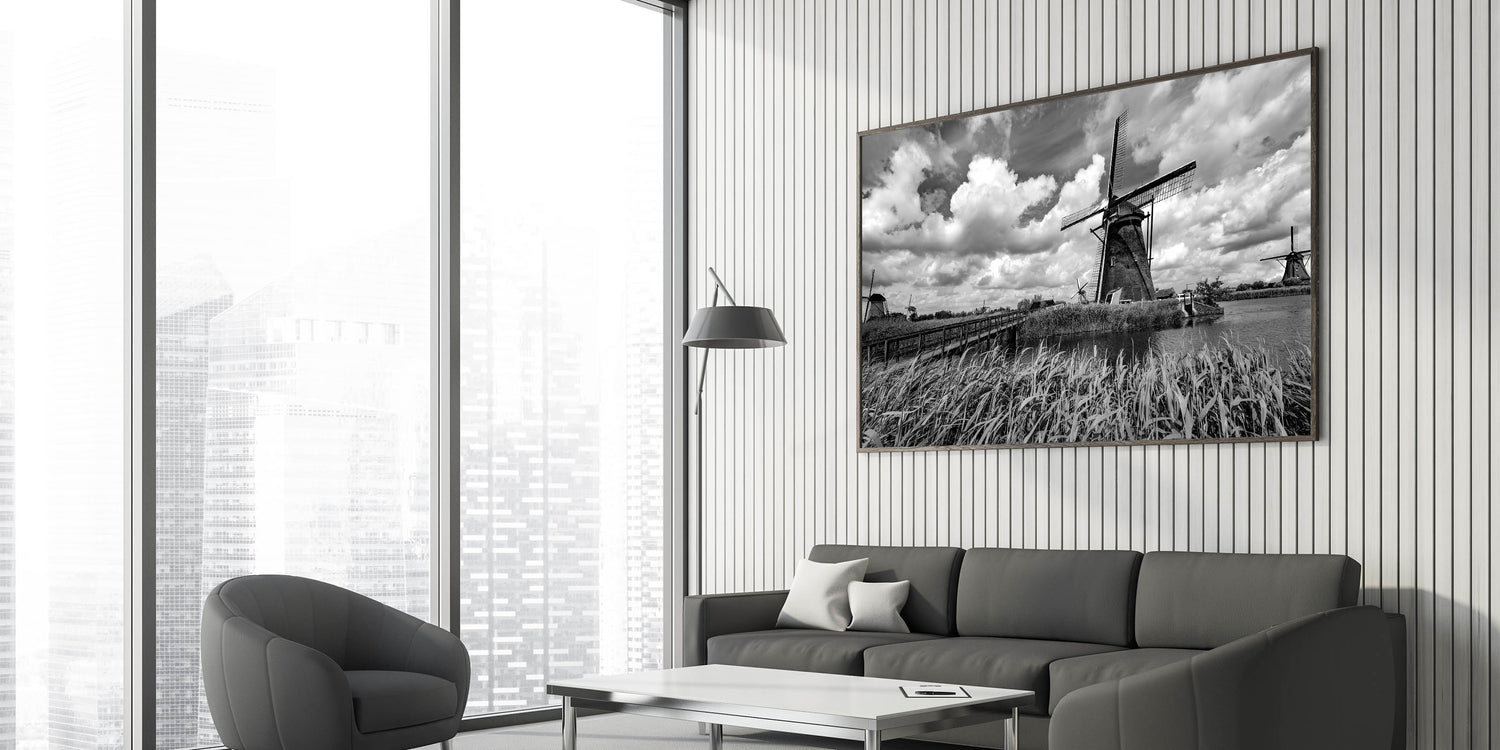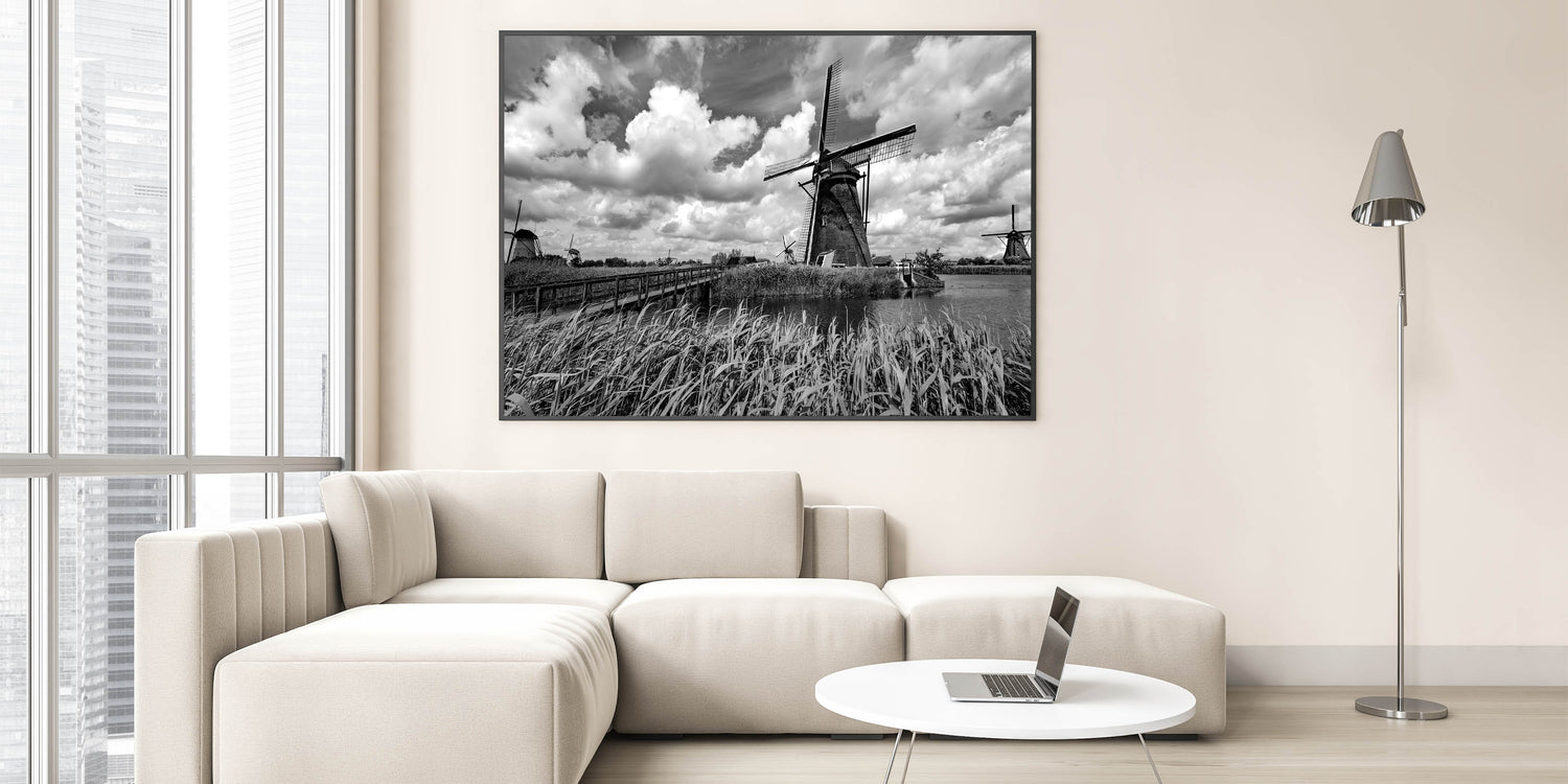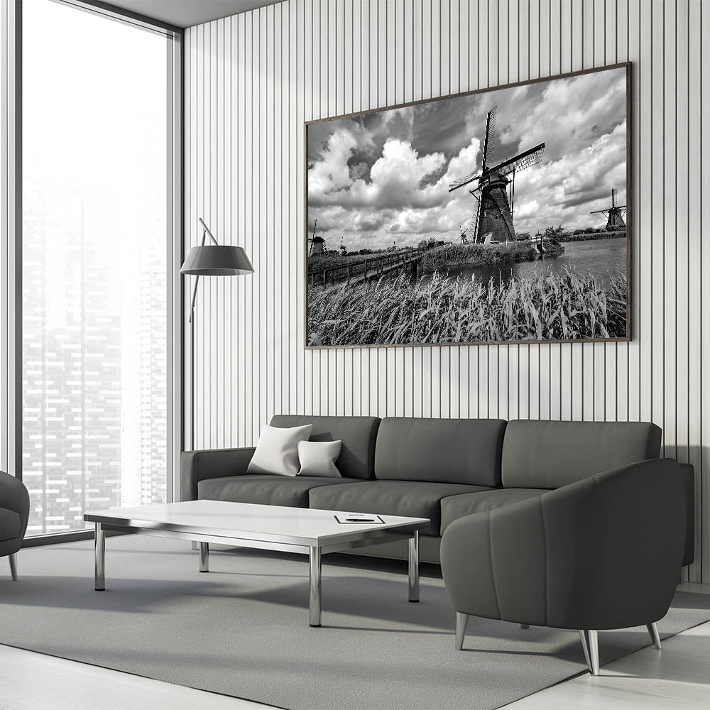 Step back in time with this stunning black and white windmill wall art, capturing the timeless beauty of classic windmills set against a dramatic sky. The monochrome palette adds depth and contrast, emphasizing the intricate details of the windmills and the surrounding landscape. This artwork is perfect for adding a touch of elegance and history to any room, whether it's your living room, bedroom, or office.