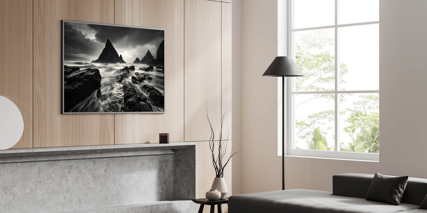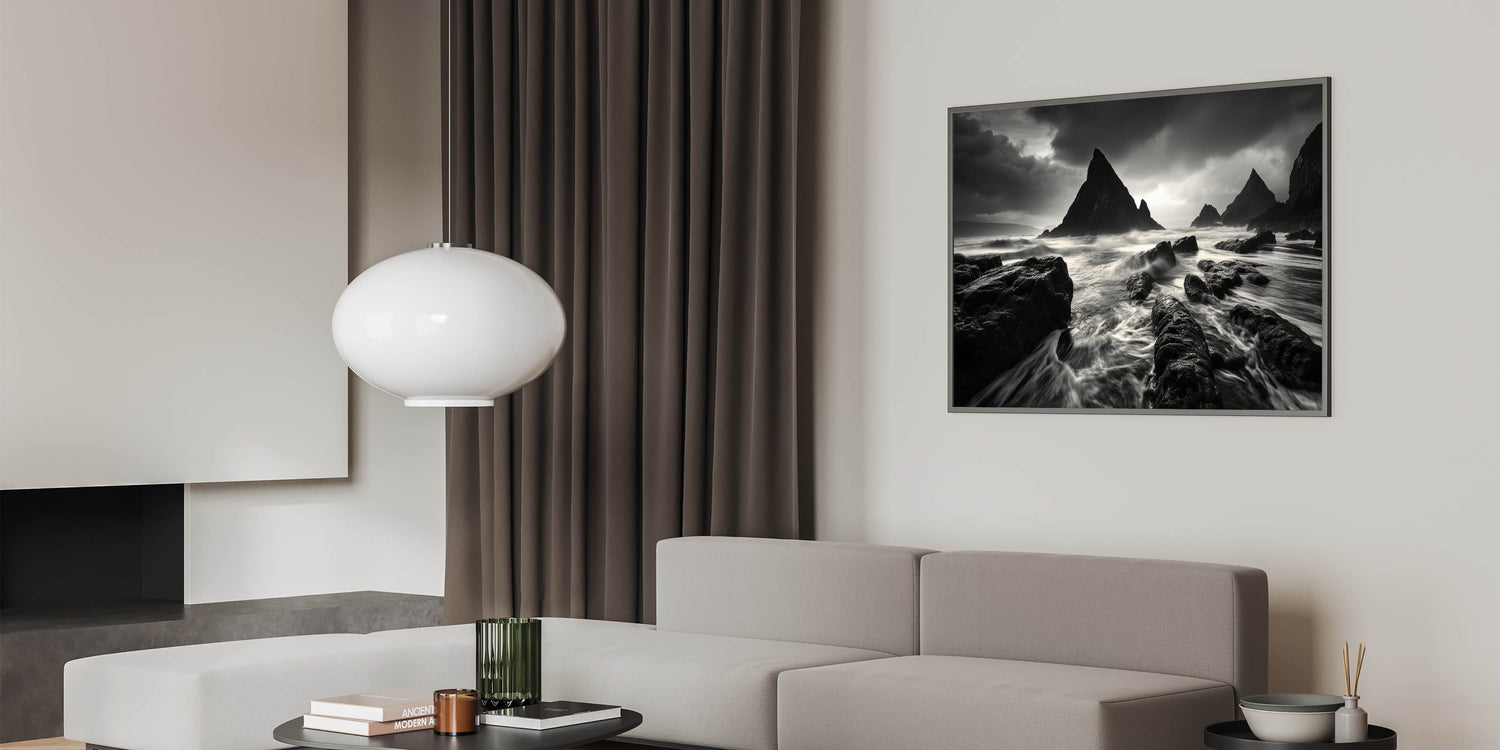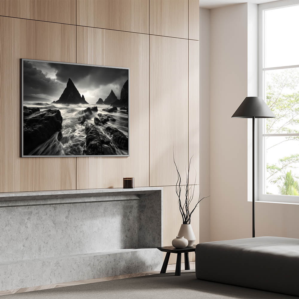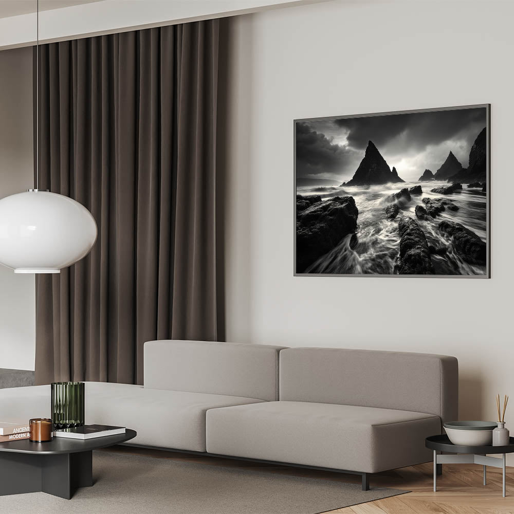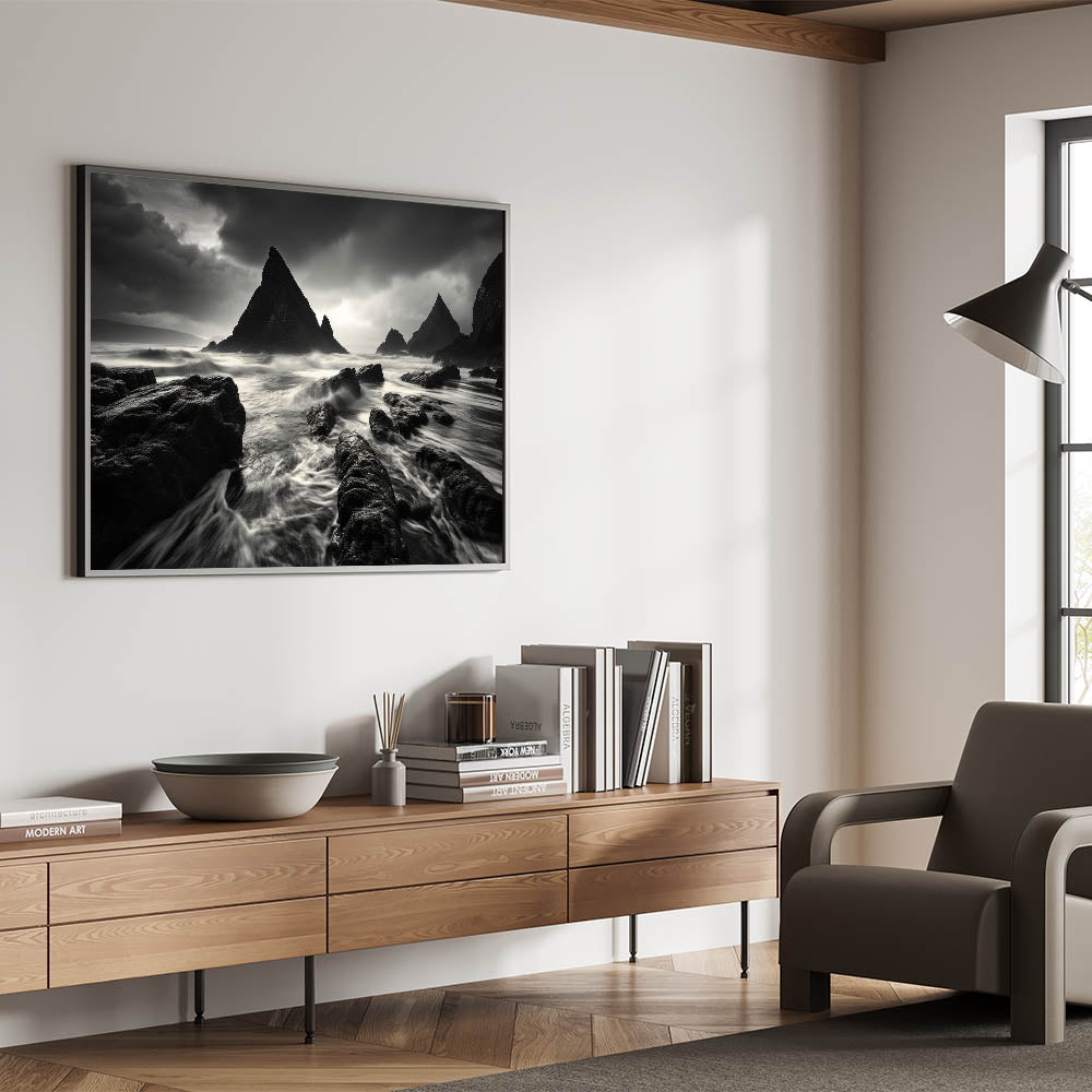 Immerse yourself in the powerful and dramatic beauty of this black and white coastal landscape. The rugged rock formations rising from the turbulent sea, framed by ominous clouds, create a scene filled with intensity and depth. This artwork captures the raw power of nature, making it a perfect statement piece for modern and contemporary spaces that seek to evoke a sense of boldness and drama.
