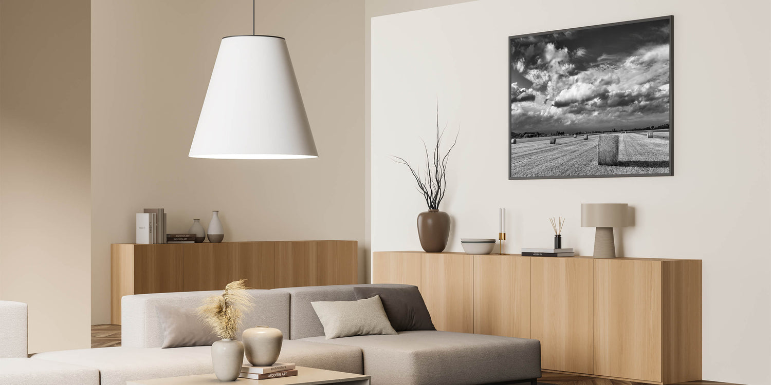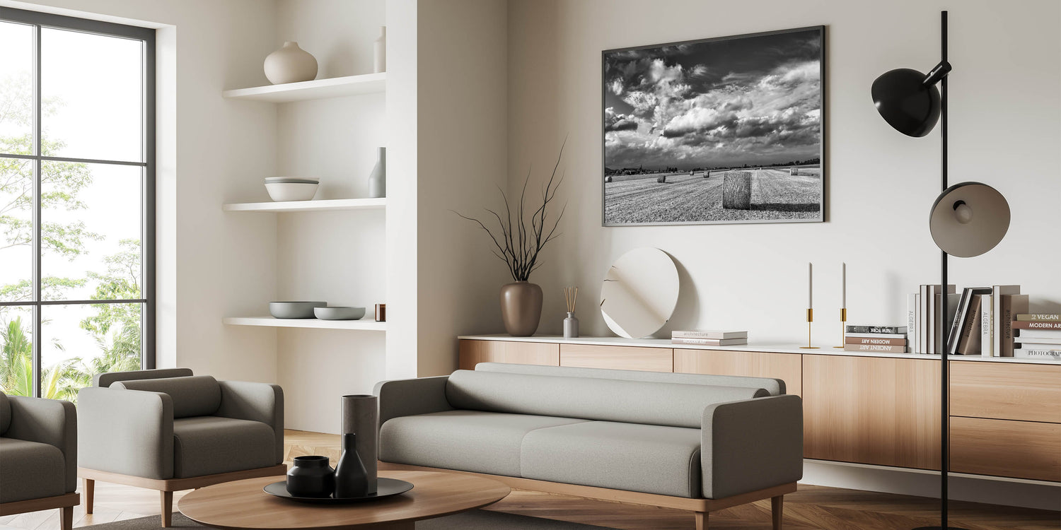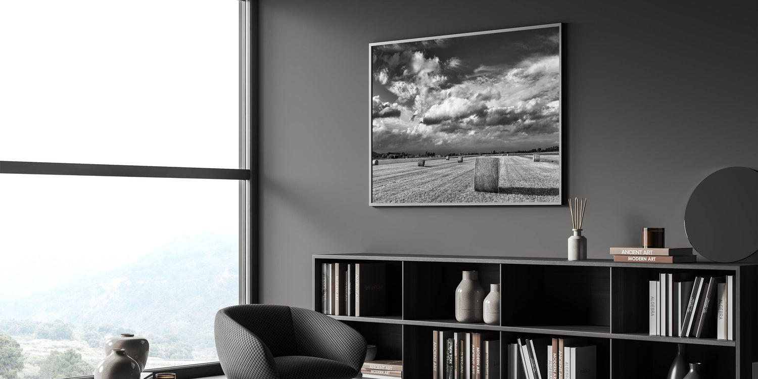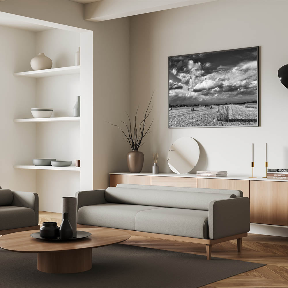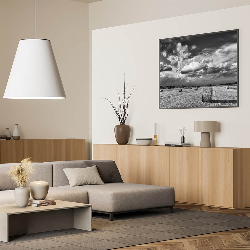 This striking black and white wall art captures the raw beauty of the countryside, featuring a field dotted with hay bales under a dramatic, cloud-filled sky. The stark contrast between the rolling clouds and the structured landscape below creates a powerful visual statement, making this artwork an ideal centerpiece for any room that seeks to embody the timeless elegance of rural life.