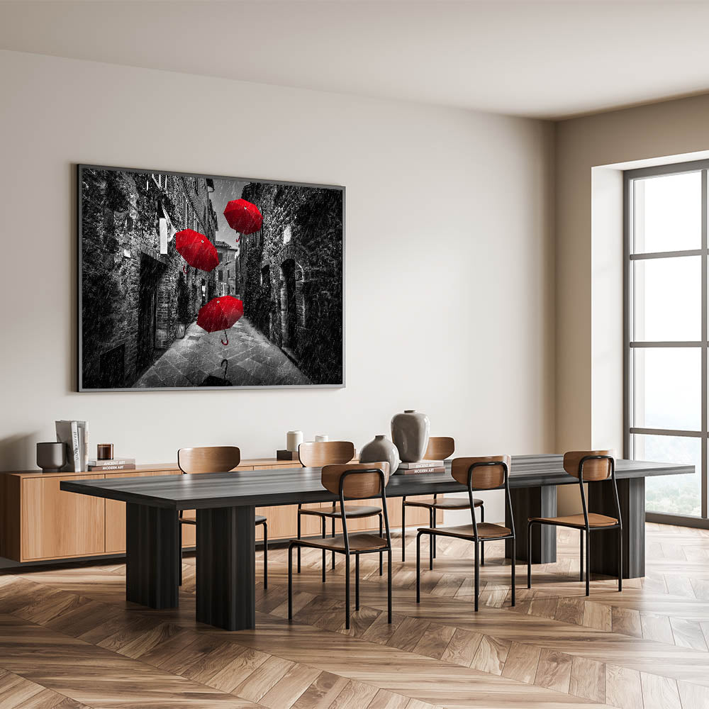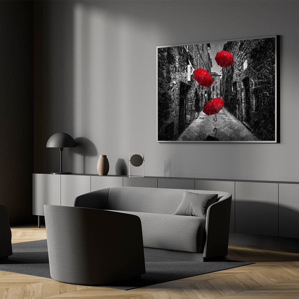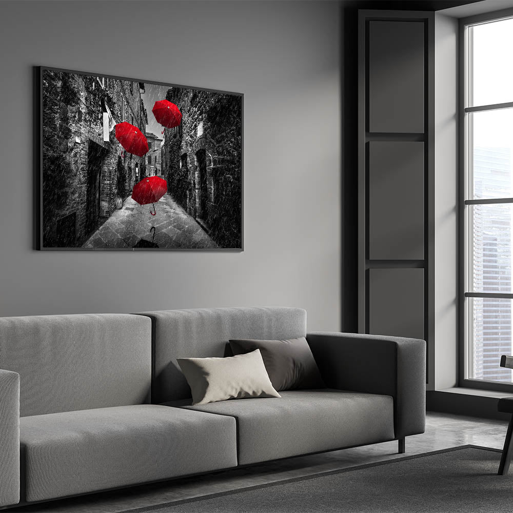 Make a bold statement in your space with this dramatic art print featuring vibrant red umbrellas against a black and white street backdrop. The contrast between the vivid red and the grayscale surroundings creates a powerful visual impact, making this piece a striking addition to any modern or contemporary decor. The image captures a moment of motion and intrigue, with the umbrellas seemingly floating through the rain-soaked street, adding a touch of surrealism and mystery.