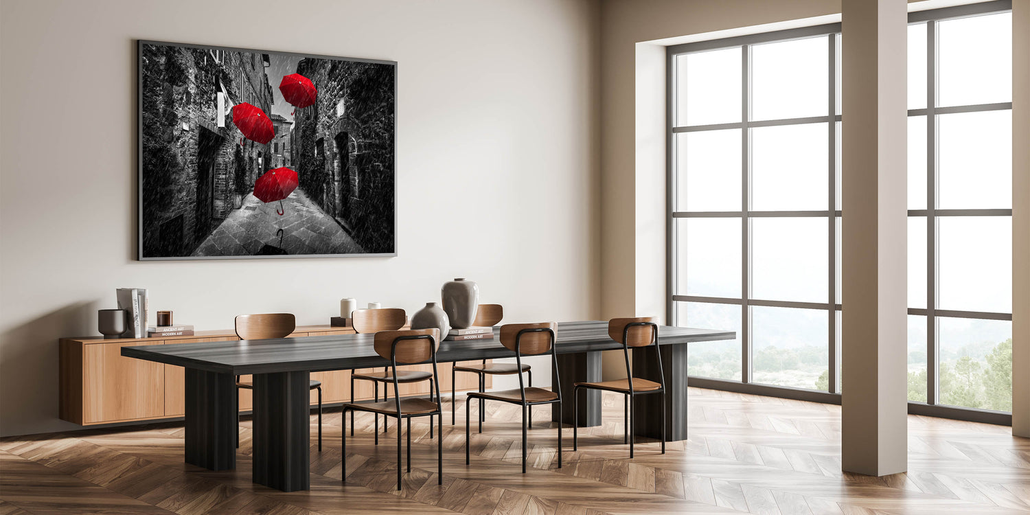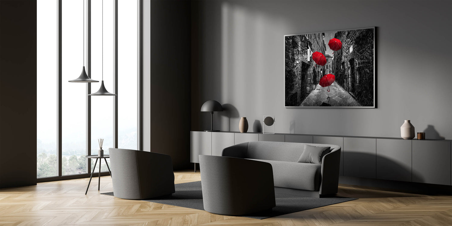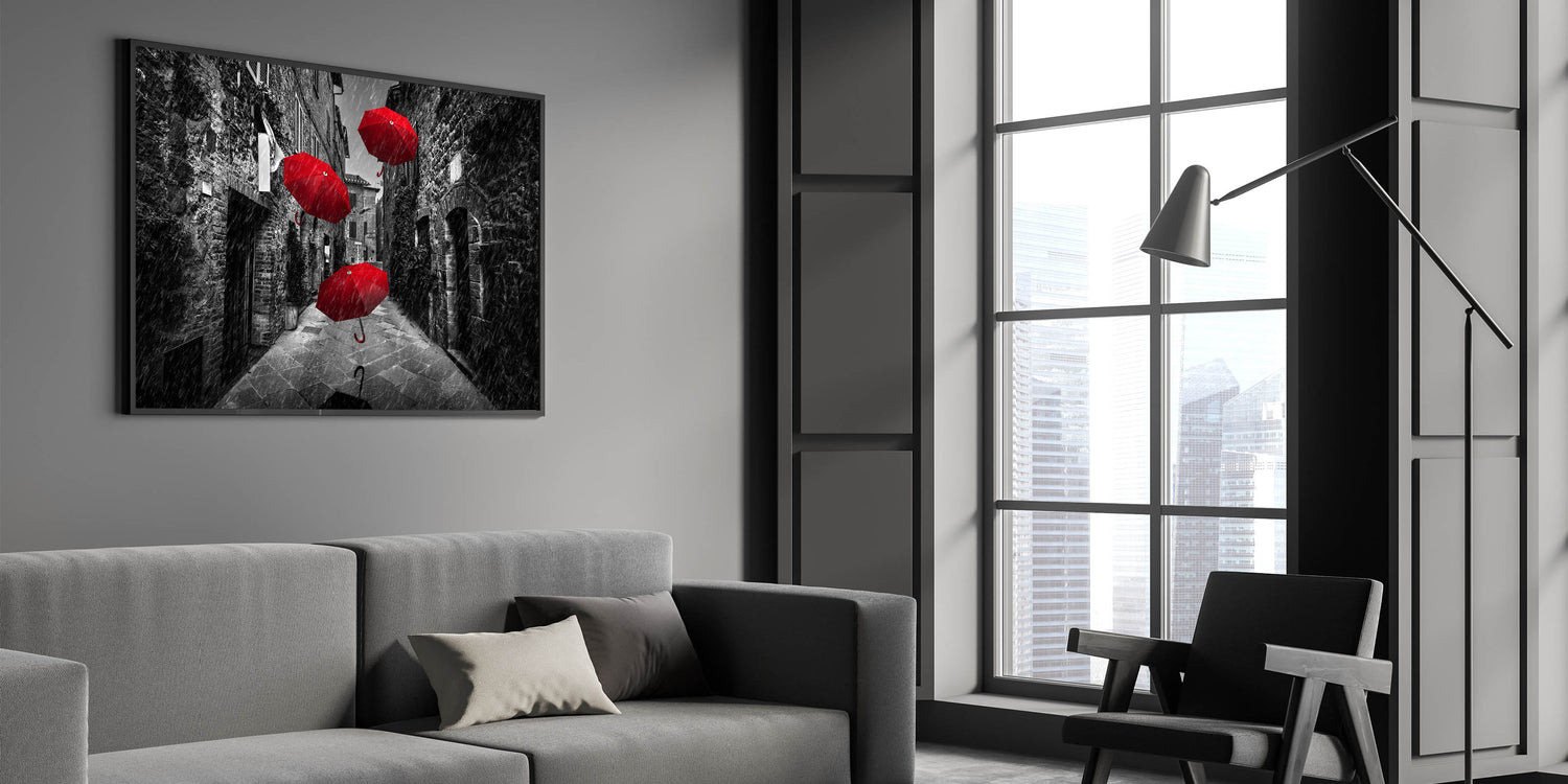 Make a bold statement in your space with this dramatic art print featuring vibrant red umbrellas against a black and white street backdrop. The contrast between the vivid red and the grayscale surroundings creates a powerful visual impact, making this piece a striking addition to any modern or contemporary decor. The image captures a moment of motion and intrigue, with the umbrellas seemingly floating through the rain-soaked street, adding a touch of surrealism and mystery.