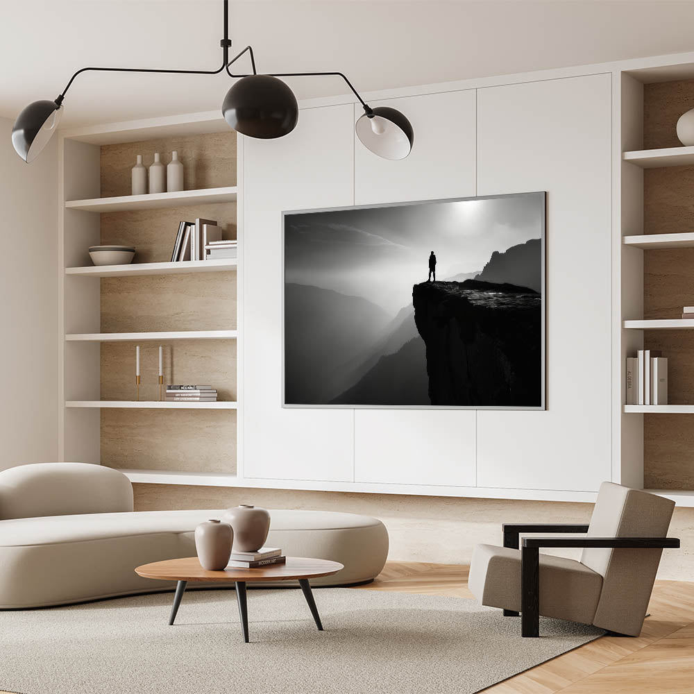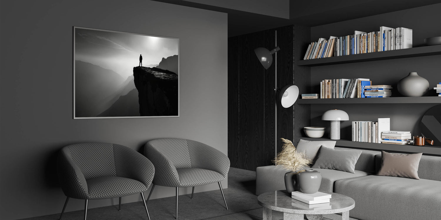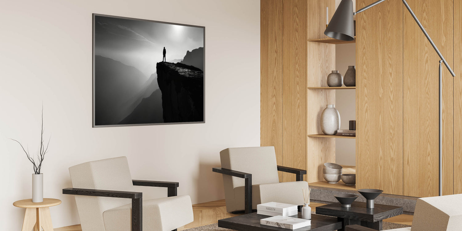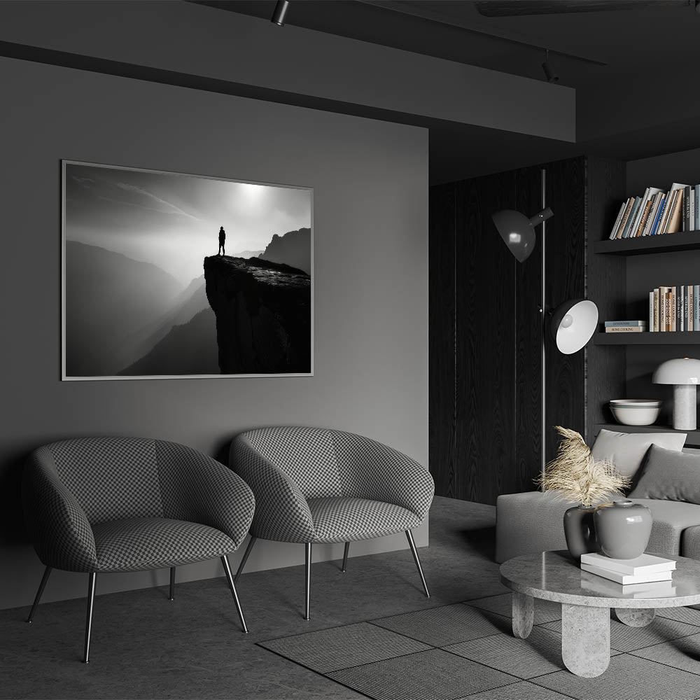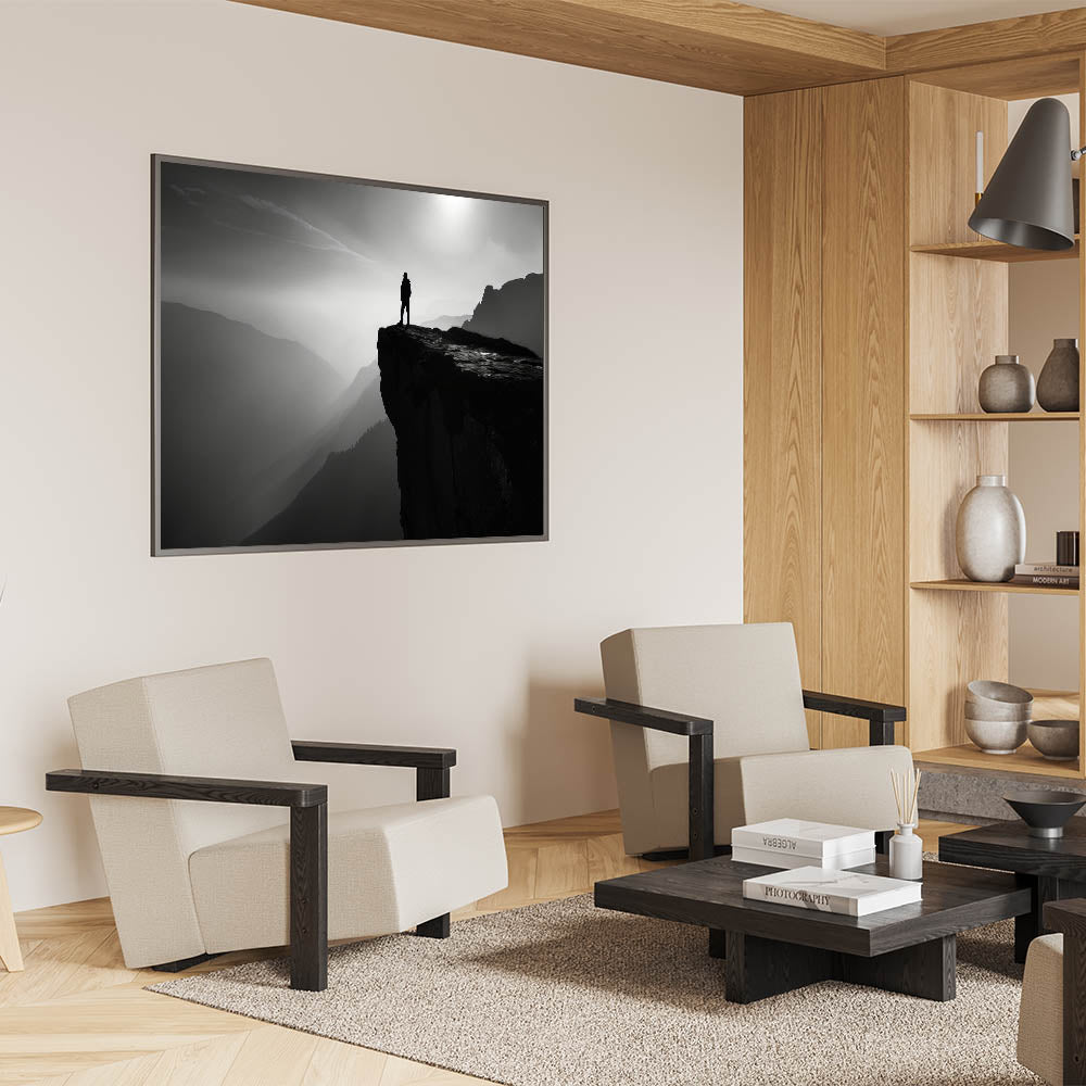 Elevate your interior design with this striking Majestic Cliffs Wall Art. This black and white piece captures the awe-inspiring solitude of a lone figure standing on a cliff's edge, enveloped by misty mountains and an expansive sky. Perfect for modern spaces, this artwork adds a touch of sophistication and drama to any room.