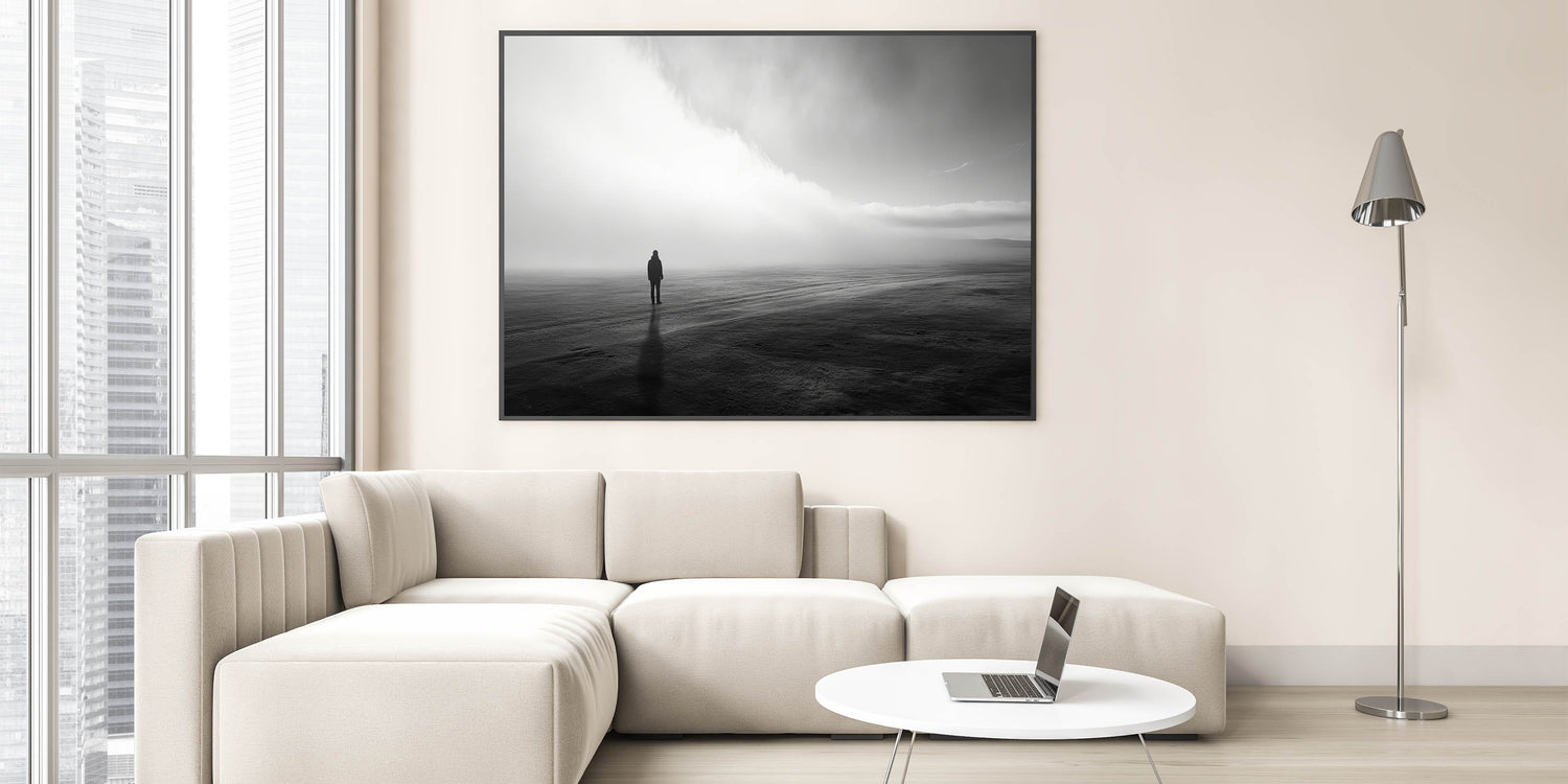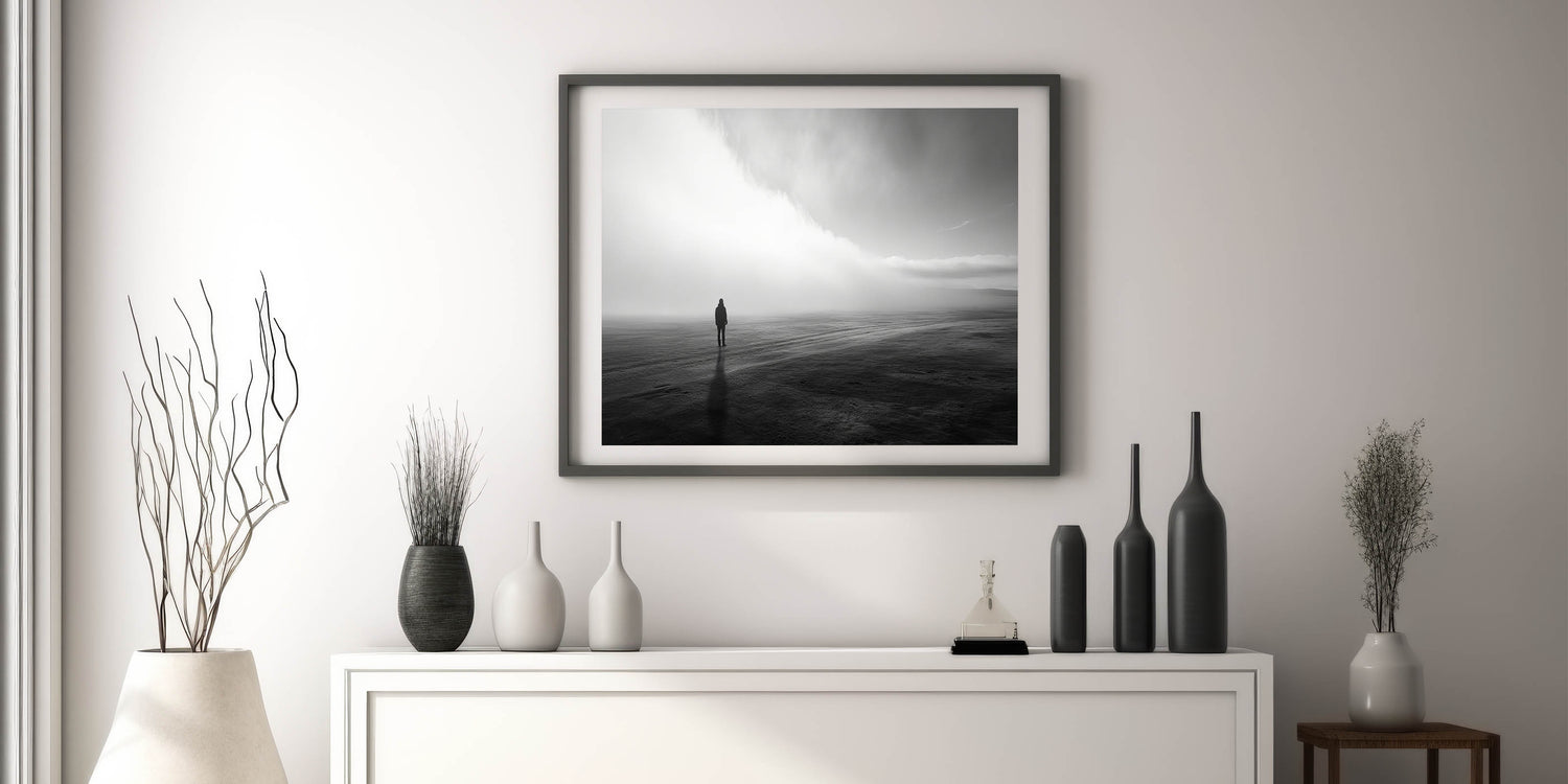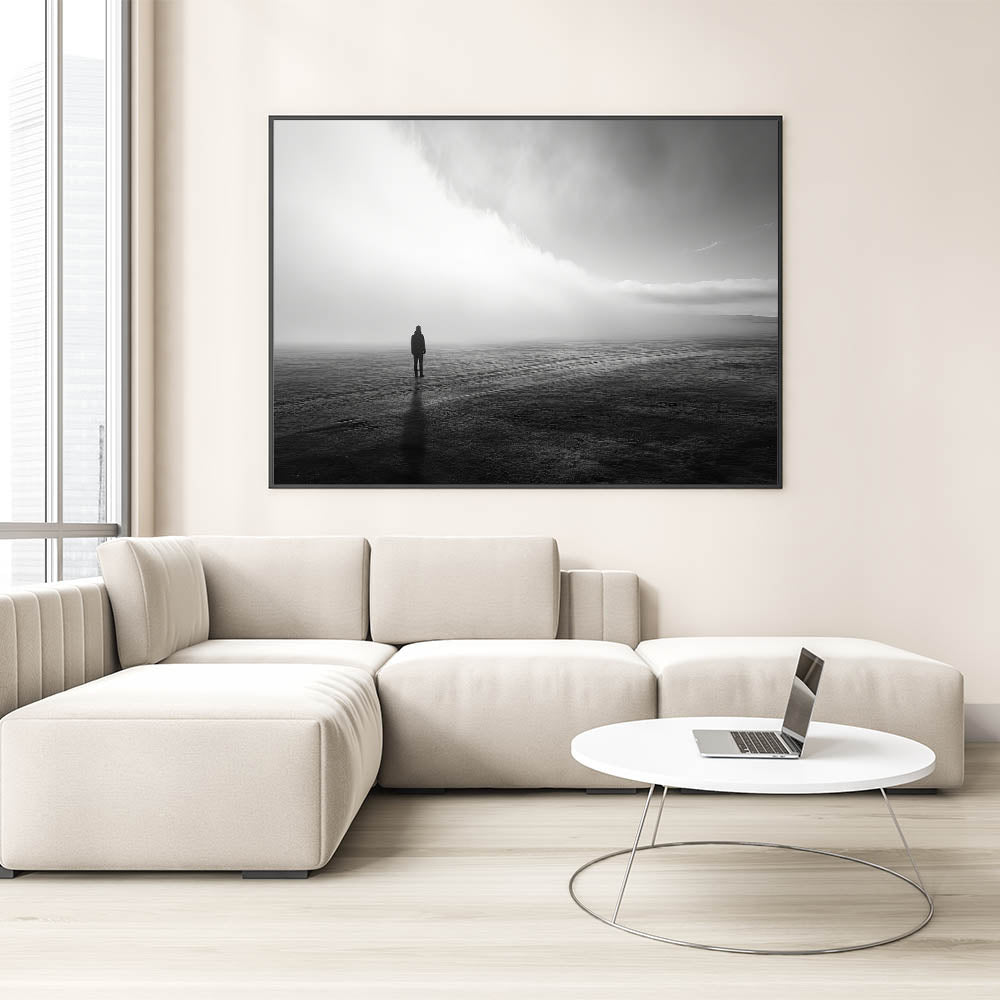 Embrace the power of simplicity with this striking black and white beach landscape art. The minimalist composition, featuring a solitary figure standing on an expansive shoreline, evokes a sense of calm and introspection. The subtle contrast between the dark sands and the light sky creates a visually compelling piece that is perfect for modern and contemporary spaces.