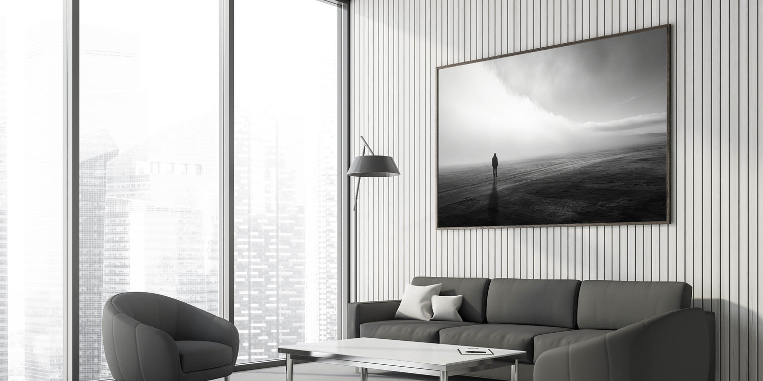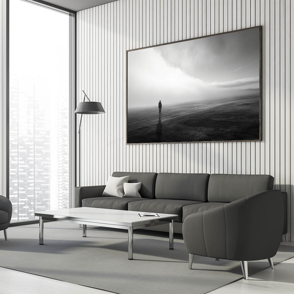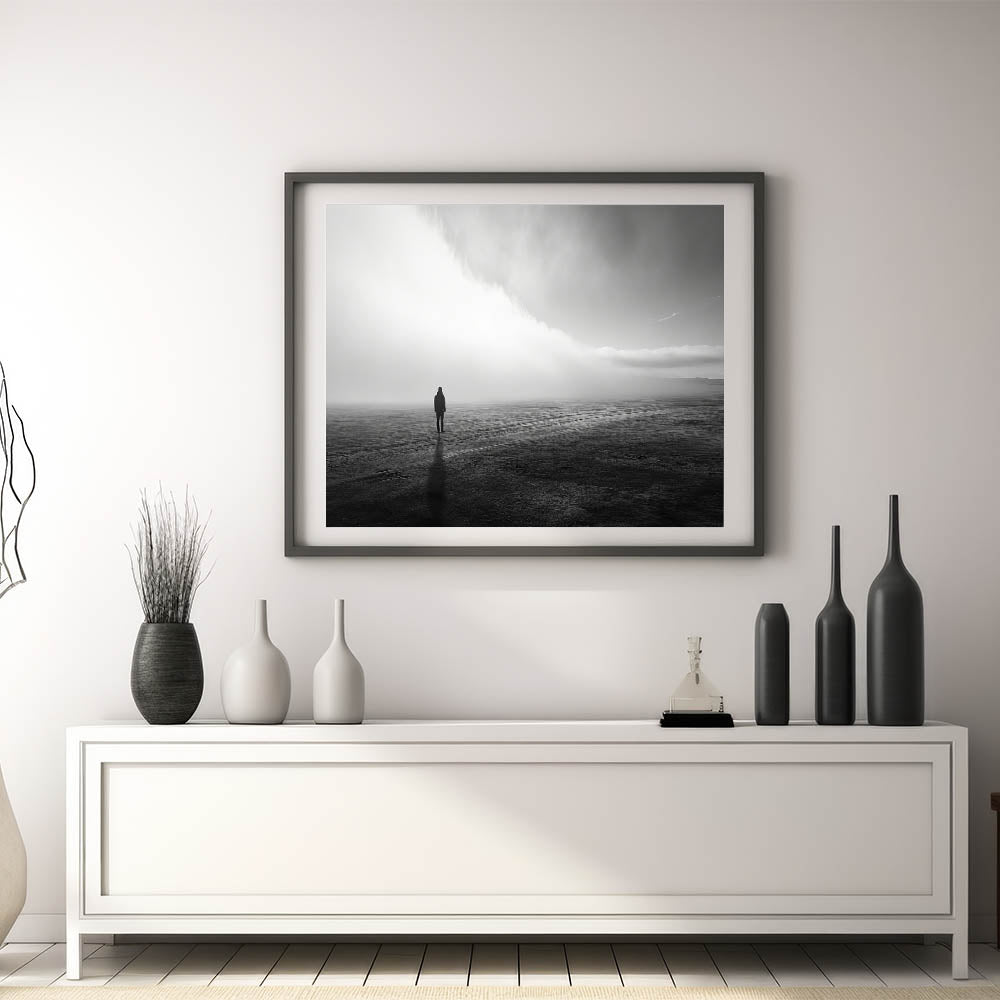 Embrace the power of simplicity with this striking black and white beach landscape art. The minimalist composition, featuring a solitary figure standing on an expansive shoreline, evokes a sense of calm and introspection. The subtle contrast between the dark sands and the light sky creates a visually compelling piece that is perfect for modern and contemporary spaces.