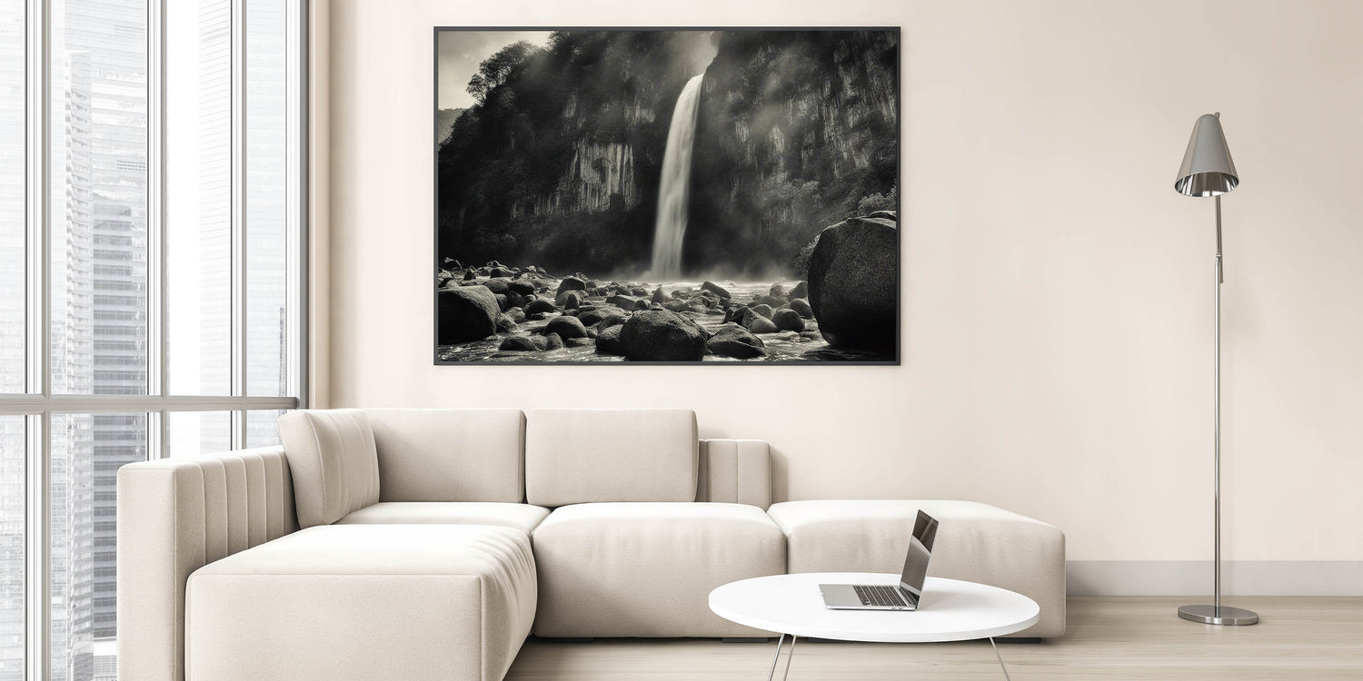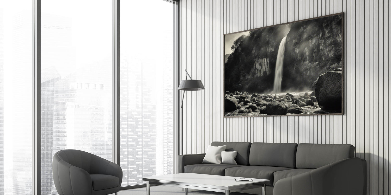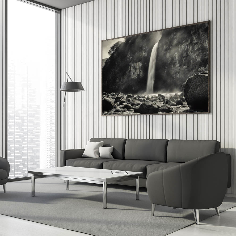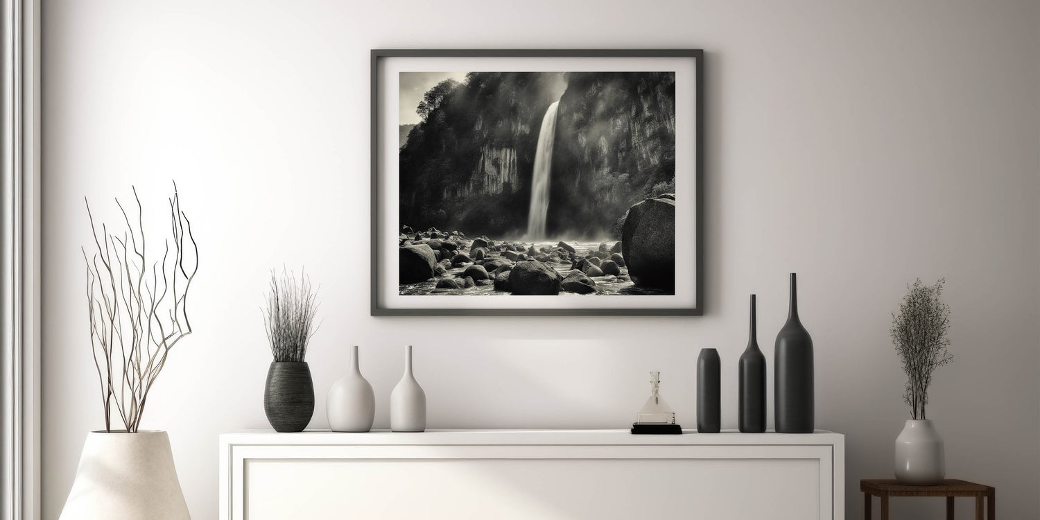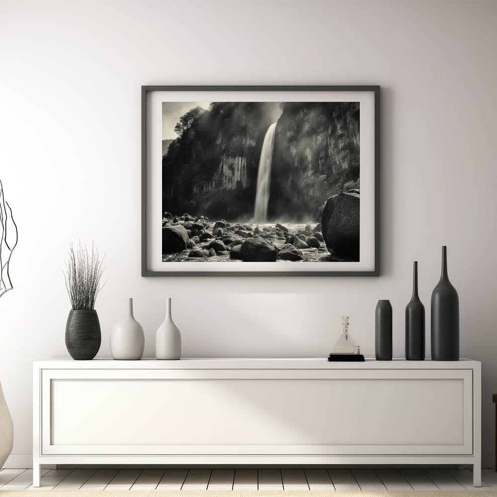 Introduction: Add a touch of dramatic elegance to your space with this captivating black-and-white wall art, featuring a misty waterfall cascading over rugged rocks. This piece from our Rocks in Landscapes collection perfectly encapsulates the raw power and serene beauty of nature, making it a striking addition to any room.