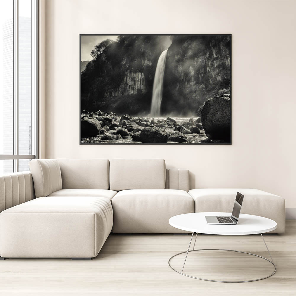 Misty Waterfall with Rocks – Dramatic Black and White Rock Wall Art