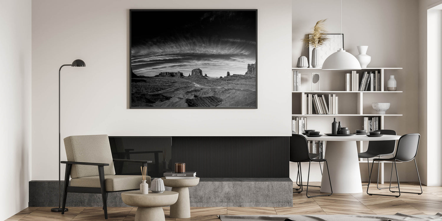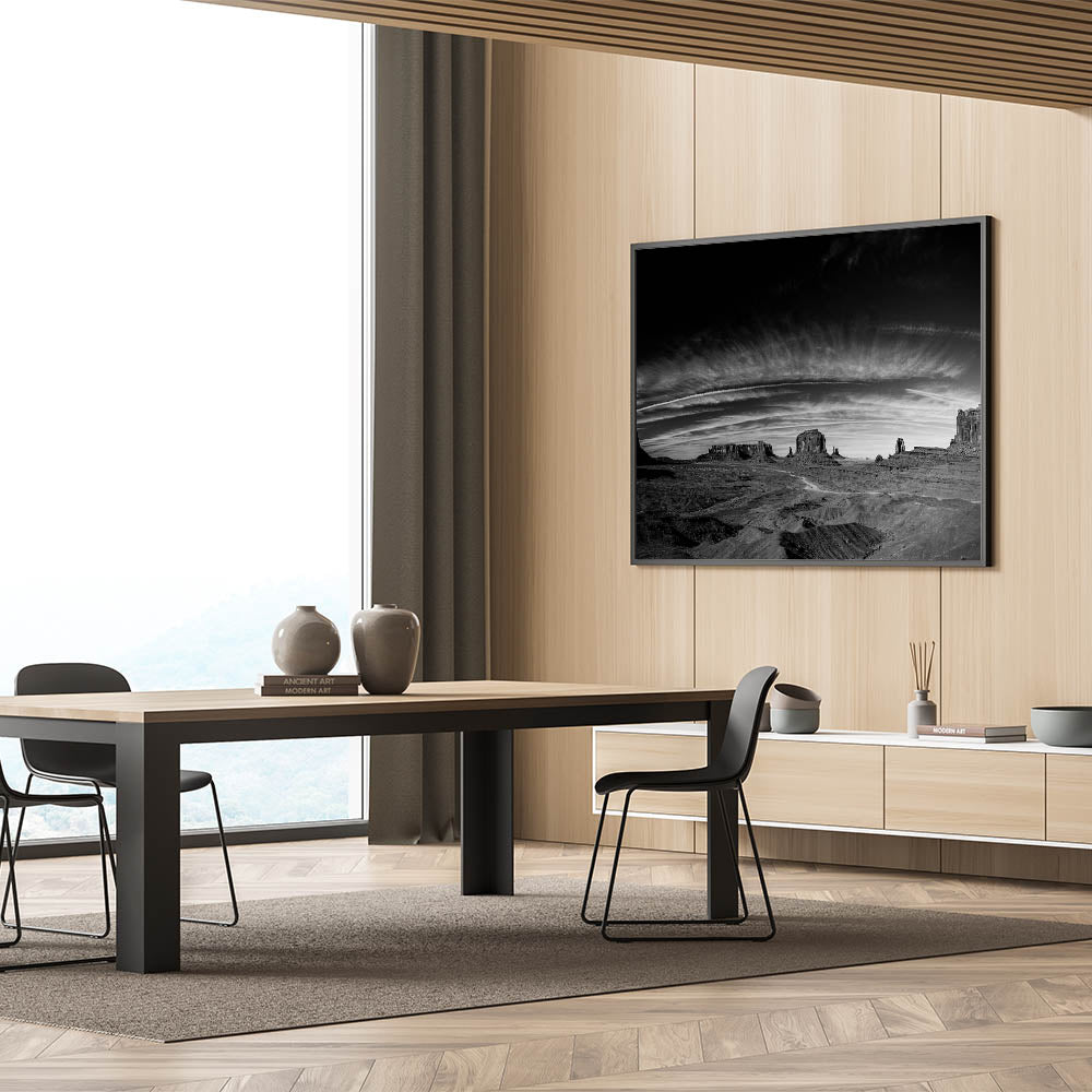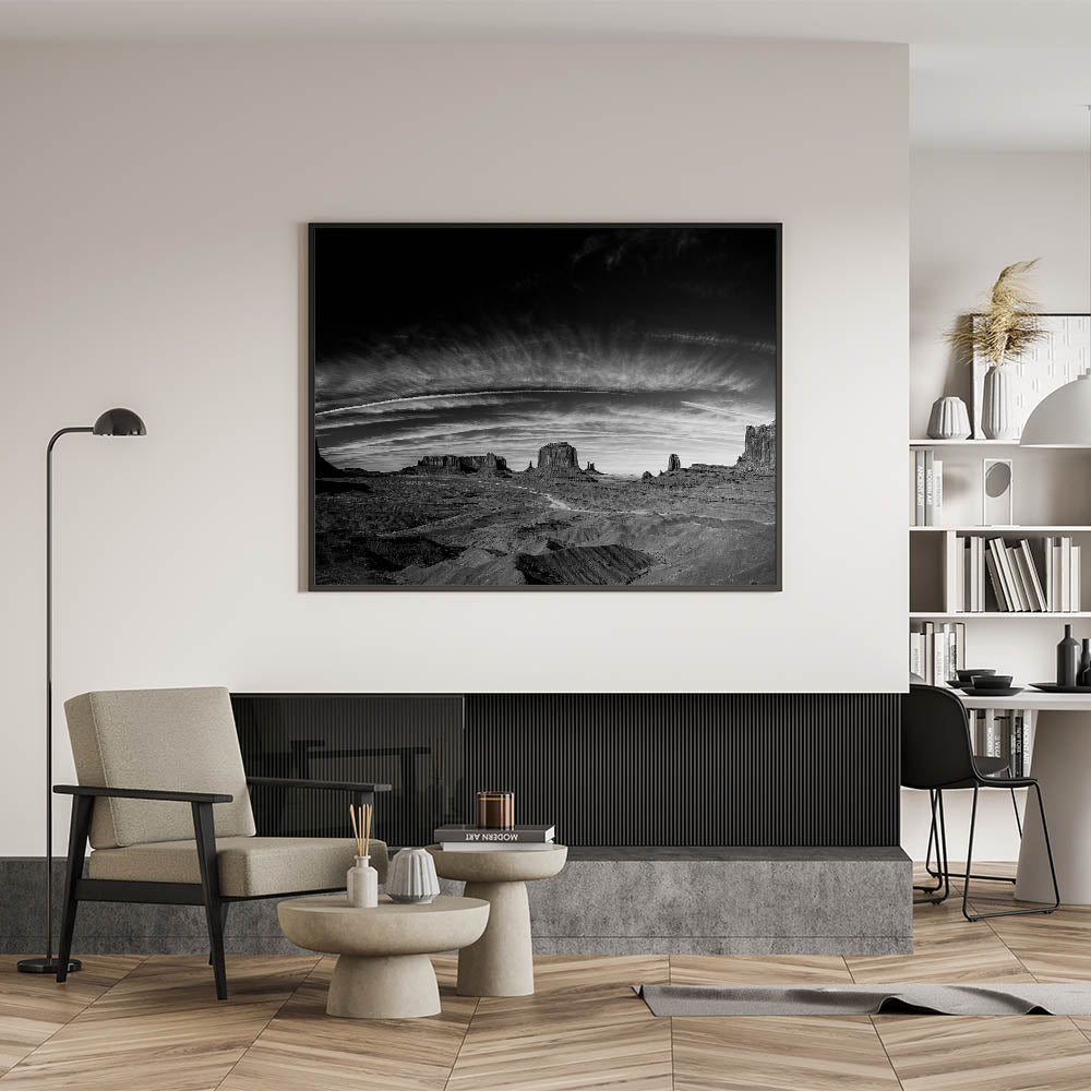 - Striking Monochrome Detail: The rich textures of the desert landscape and the dramatic sky are captured with incredible detail, creating a visually captivating piece that stands out in any room.