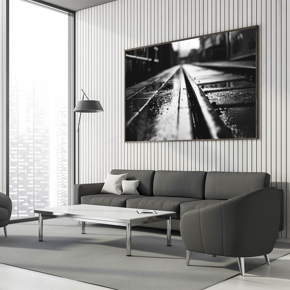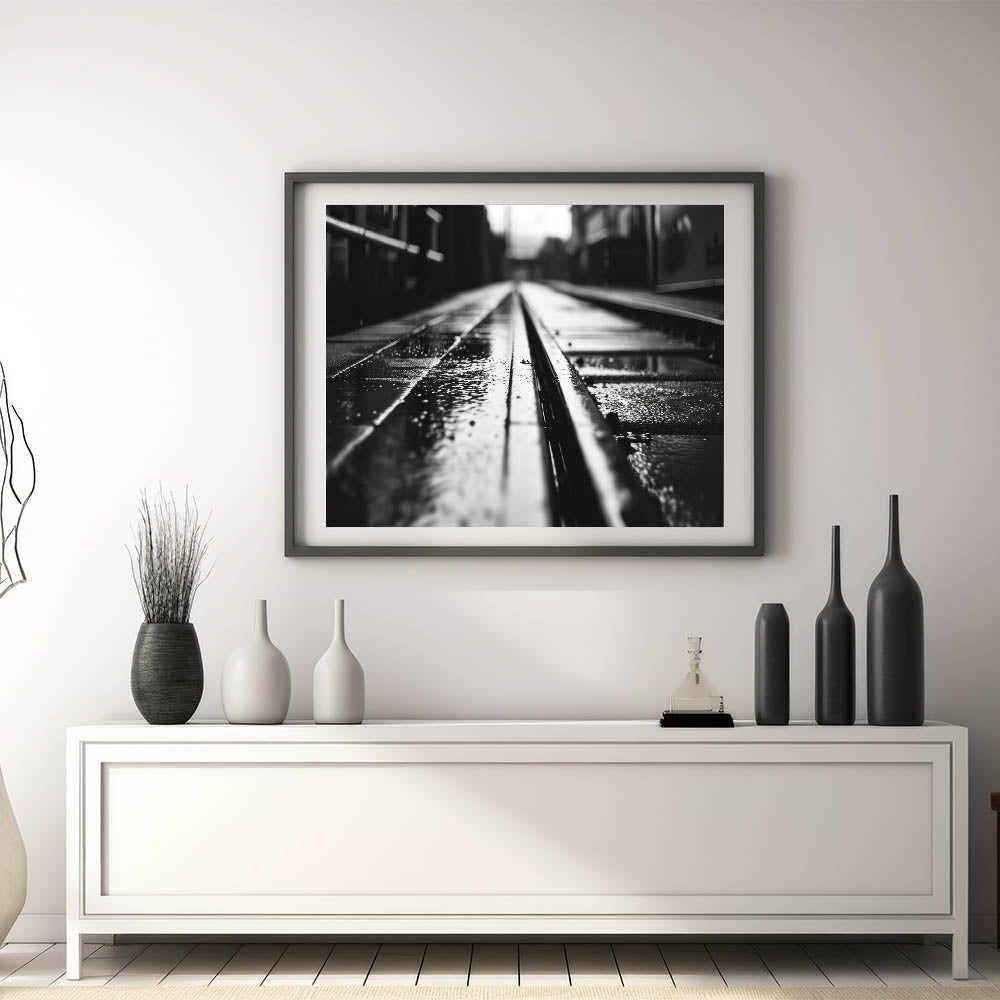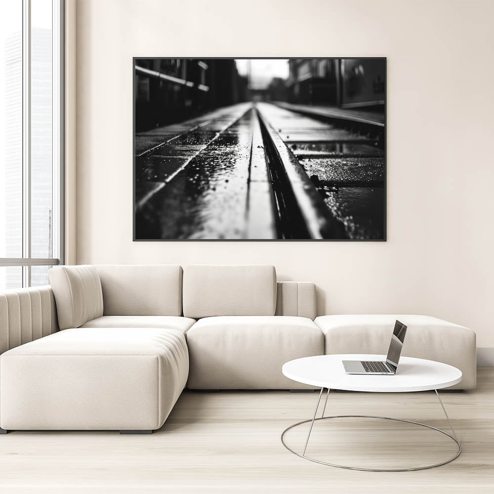 Embrace the moody elegance of this black and white railway wall art, where wet tracks glisten under a monochromatic sky. The play of light and shadow creates a striking visual that evokes feelings of solitude and introspection, making it a perfect piece for any modern space.