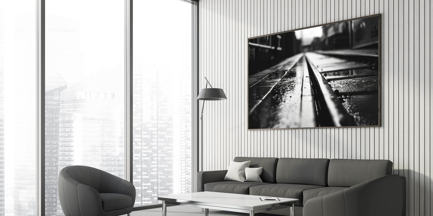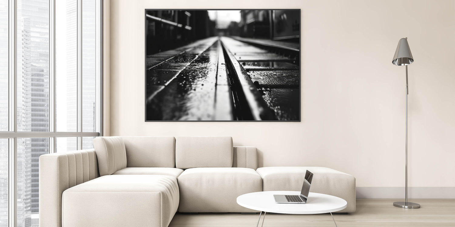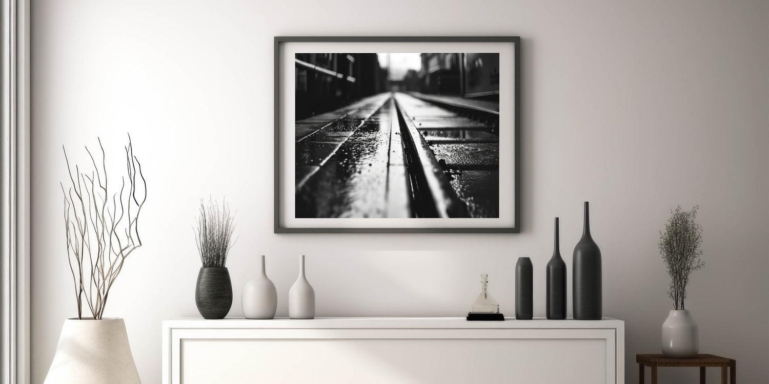 Embrace the moody elegance of this black and white railway wall art, where wet tracks glisten under a monochromatic sky. The play of light and shadow creates a striking visual that evokes feelings of solitude and introspection, making it a perfect piece for any modern space.