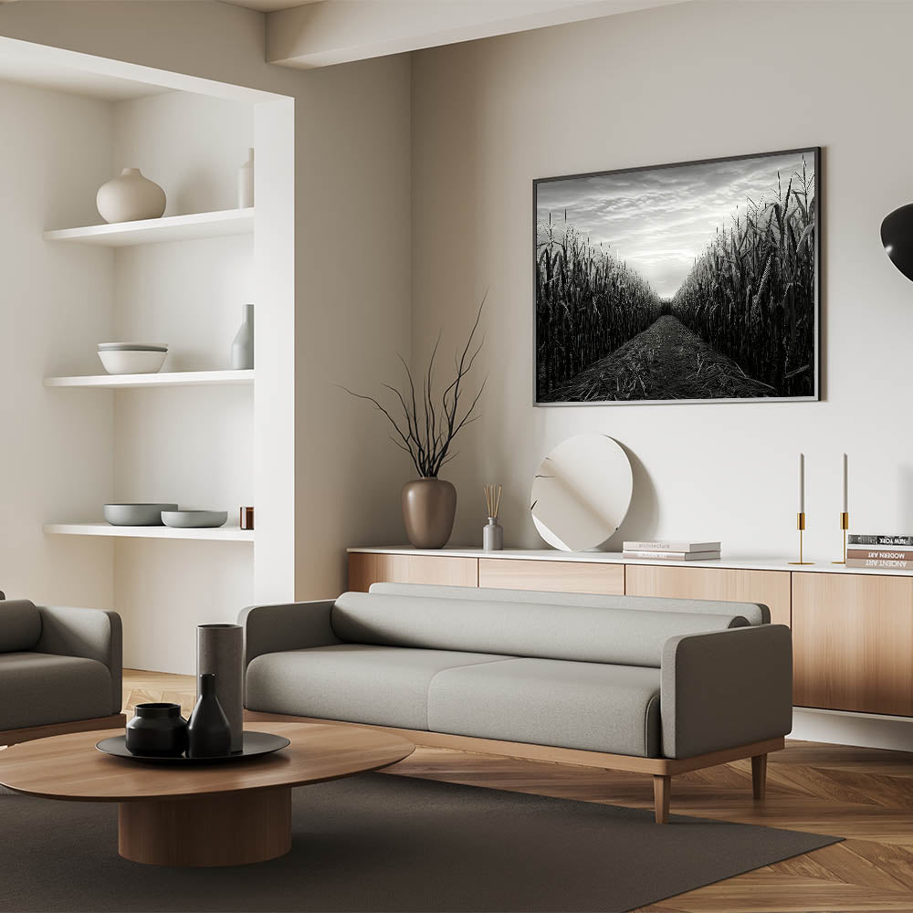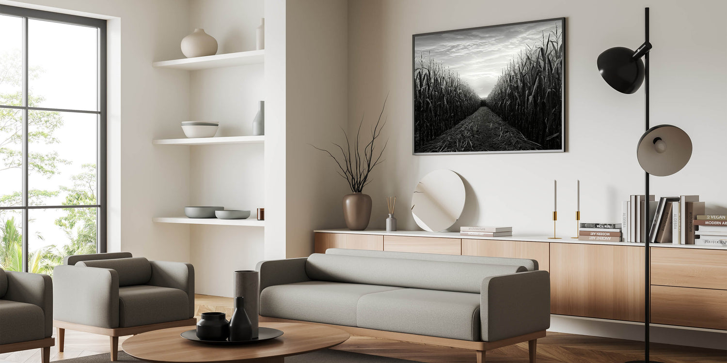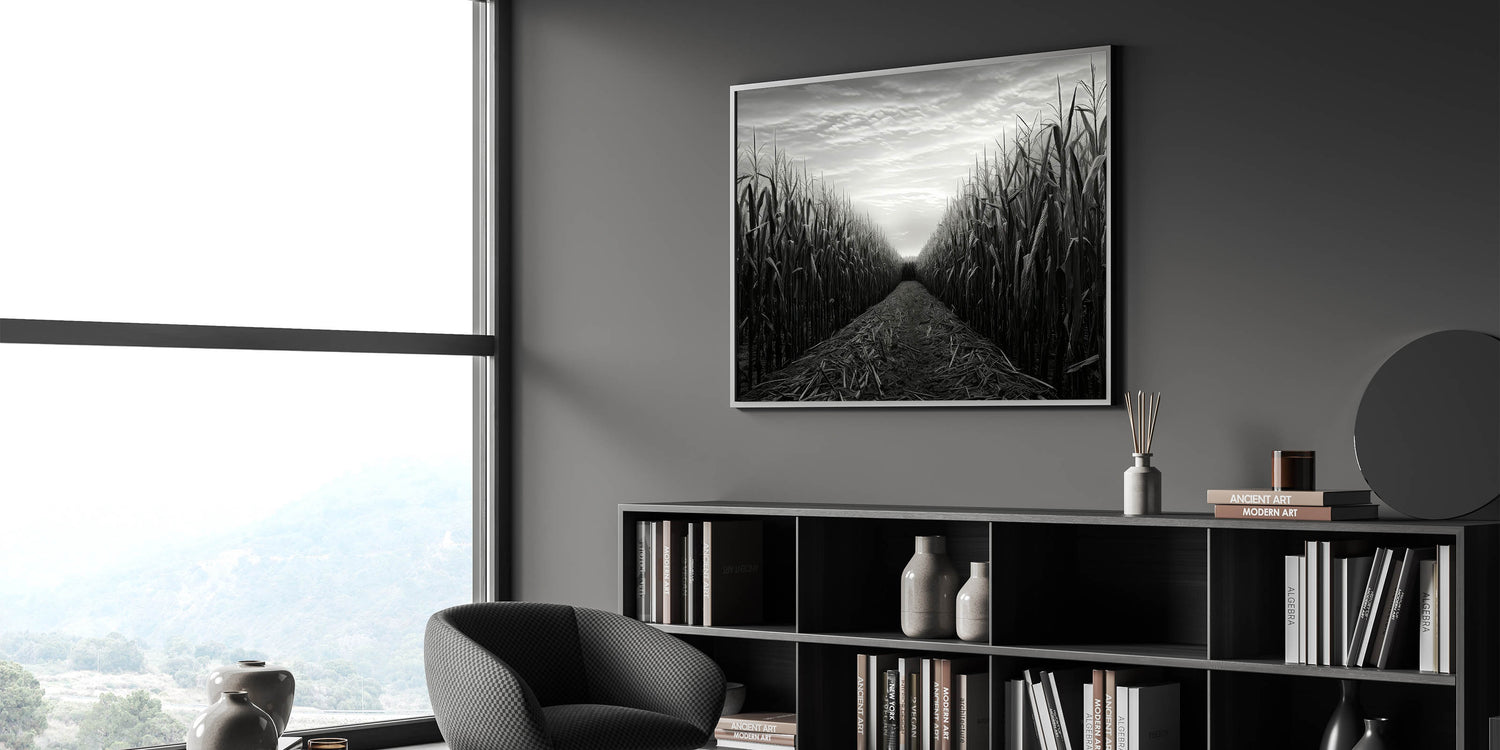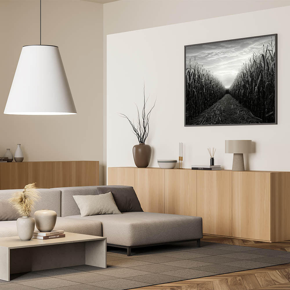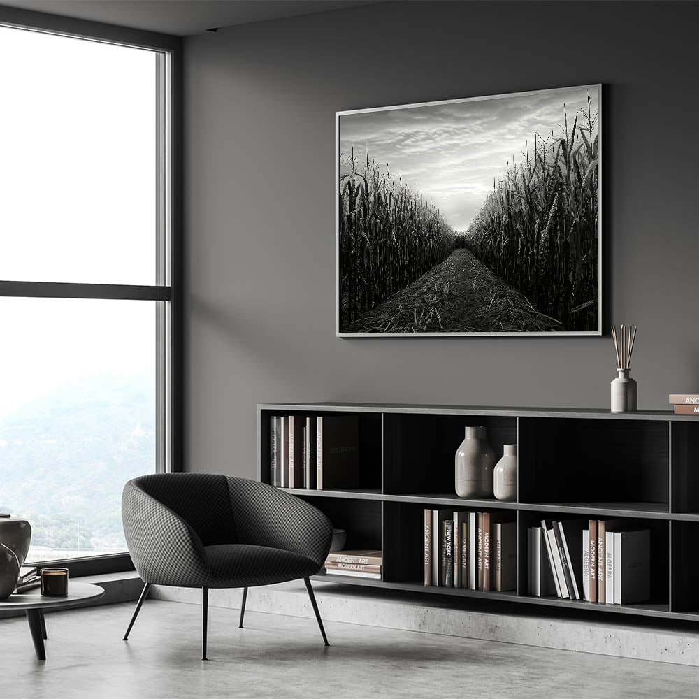 Introduce a touch of drama and intrigue to your home with this Rural Landscape Canvas featuring a moody black and white depiction of a cornfield. The artwork captures the stark beauty of tall corn stalks reaching towards an overcast sky, creating a powerful contrast between light and shadow. The path leading through the dense field invites the viewer into a world of mystery, making this piece an excellent choice for those who appreciate bold and thought-provoking decor.