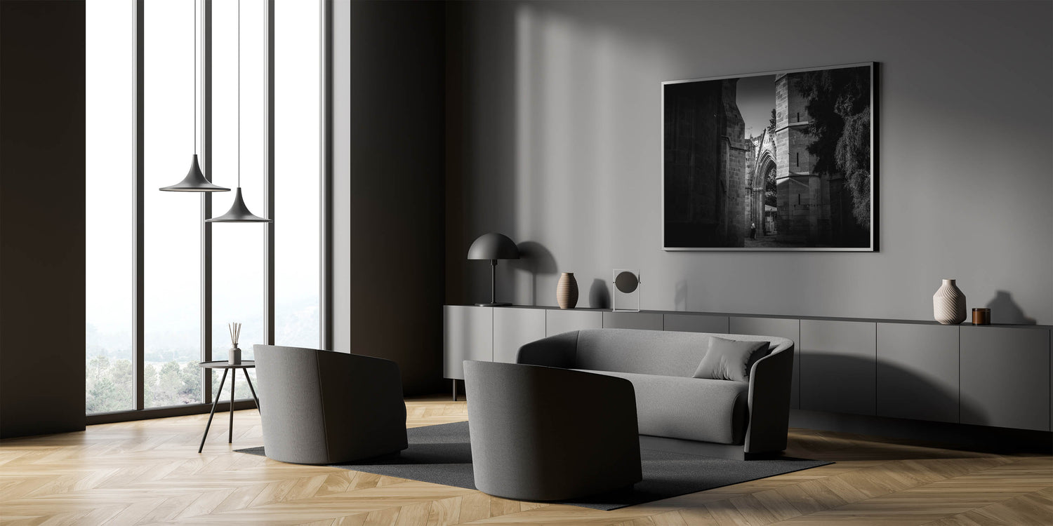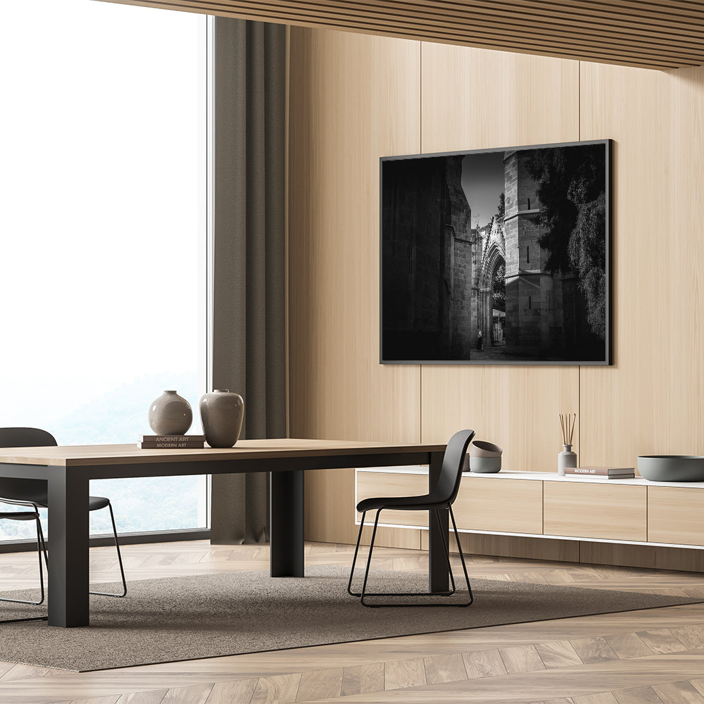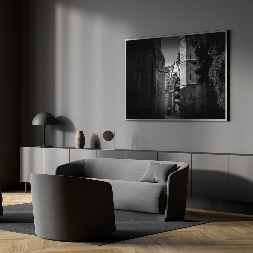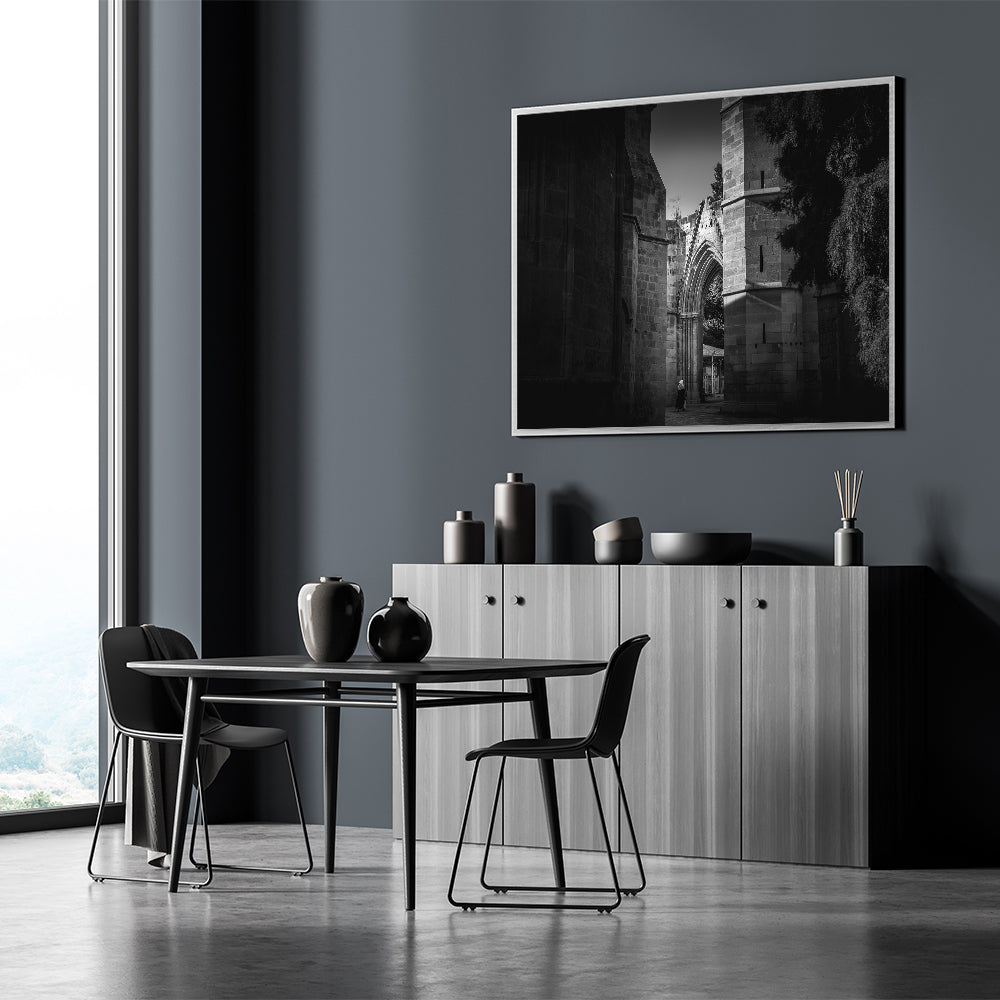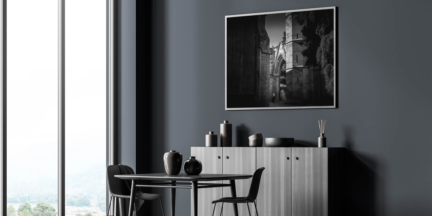 Capture the timeless beauty of Islamic architecture with this striking black and white mosque wall art. The intricate details of the mosque's arches and stone walls are highlighted in monochrome, creating a powerful visual impact. This artwork is perfect for those who appreciate mosque photography and want to bring a touch of religious wall art into their living space. Available in various formats, including stretched canvas, framed canvas, acrylic glass, and framed prints, this piece adds a sophisticated and spiritual ambiance to any room.