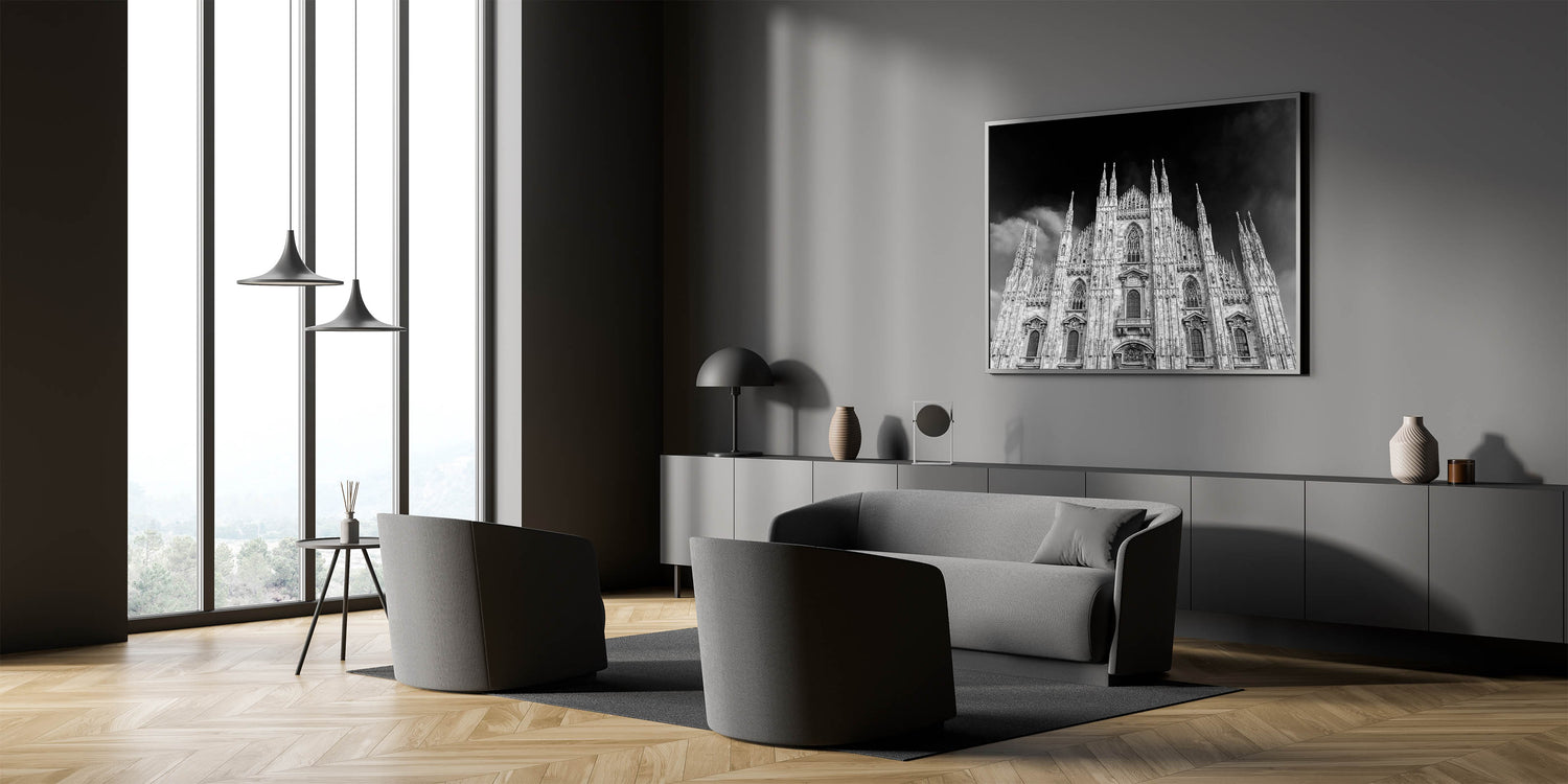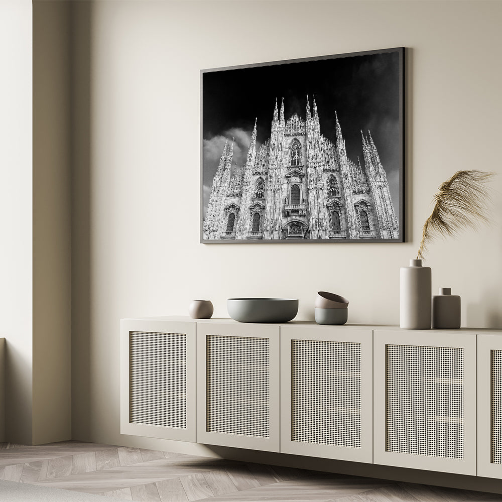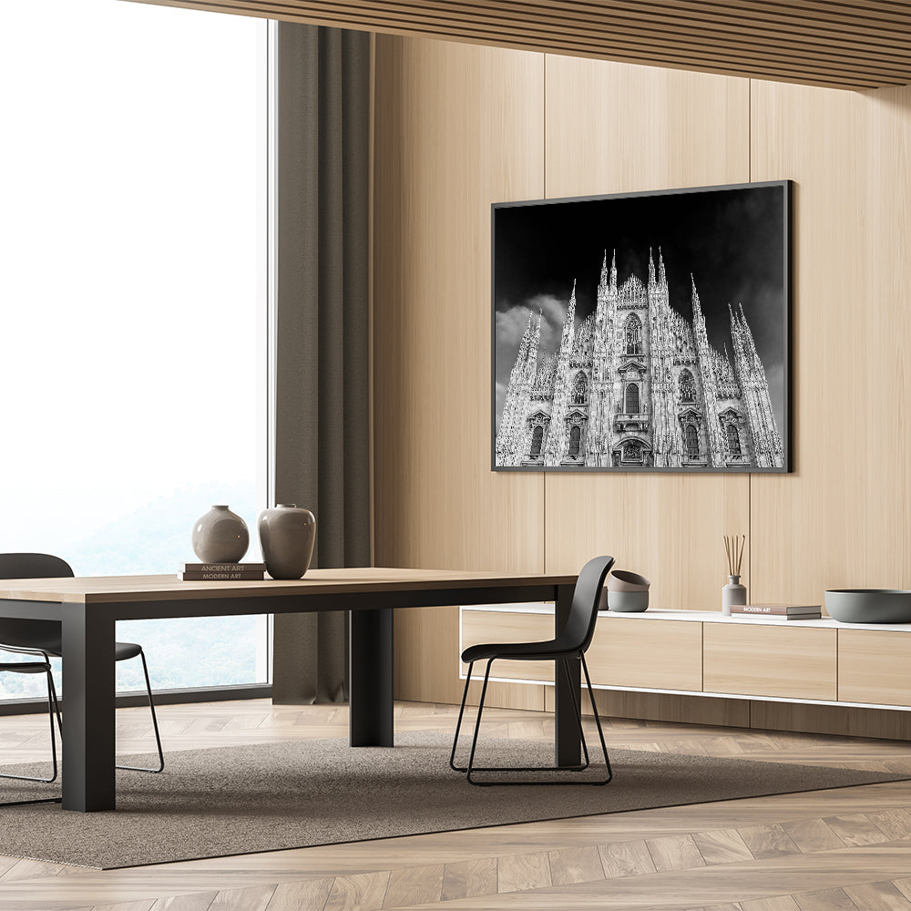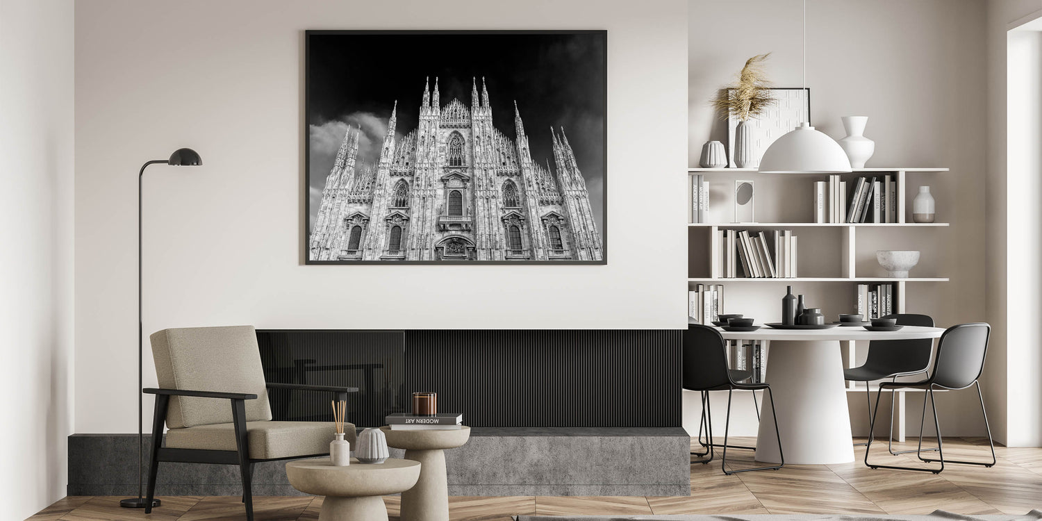 - High-quality black and white cathedral prints available in various formats, including stretched canvas, framed prints, and acrylic glass.