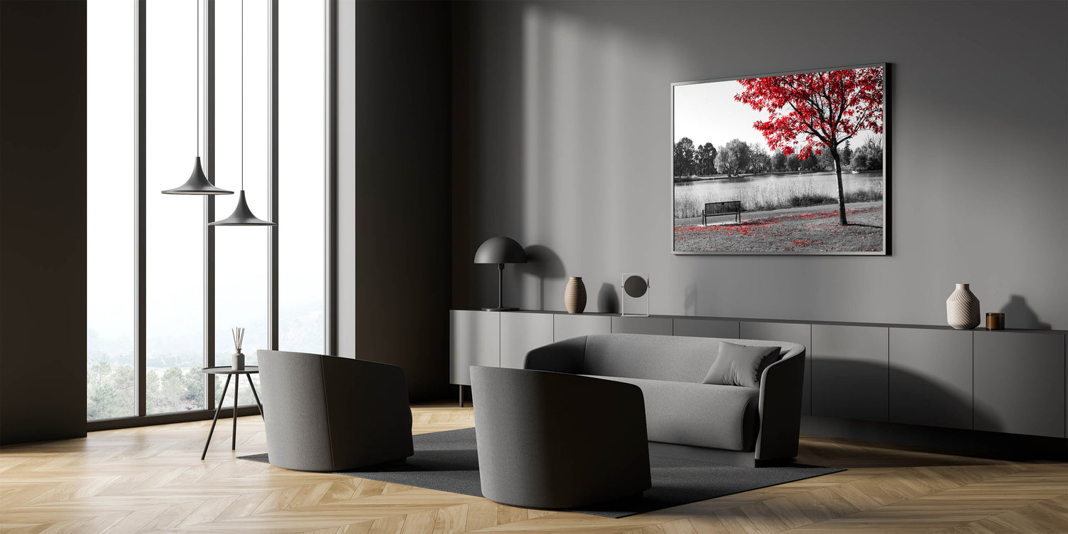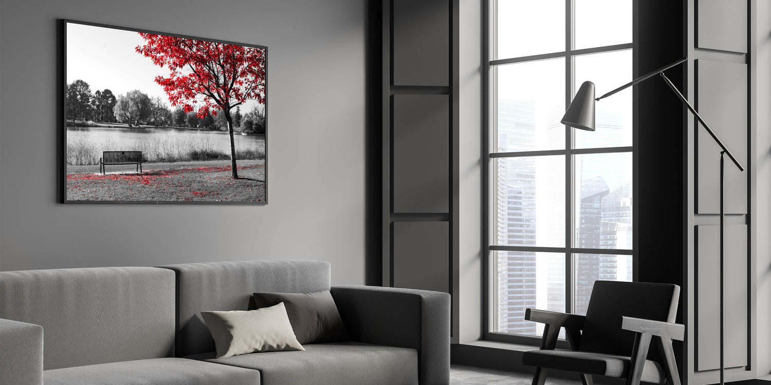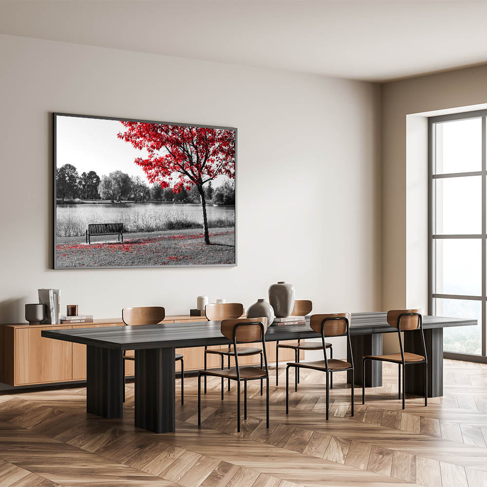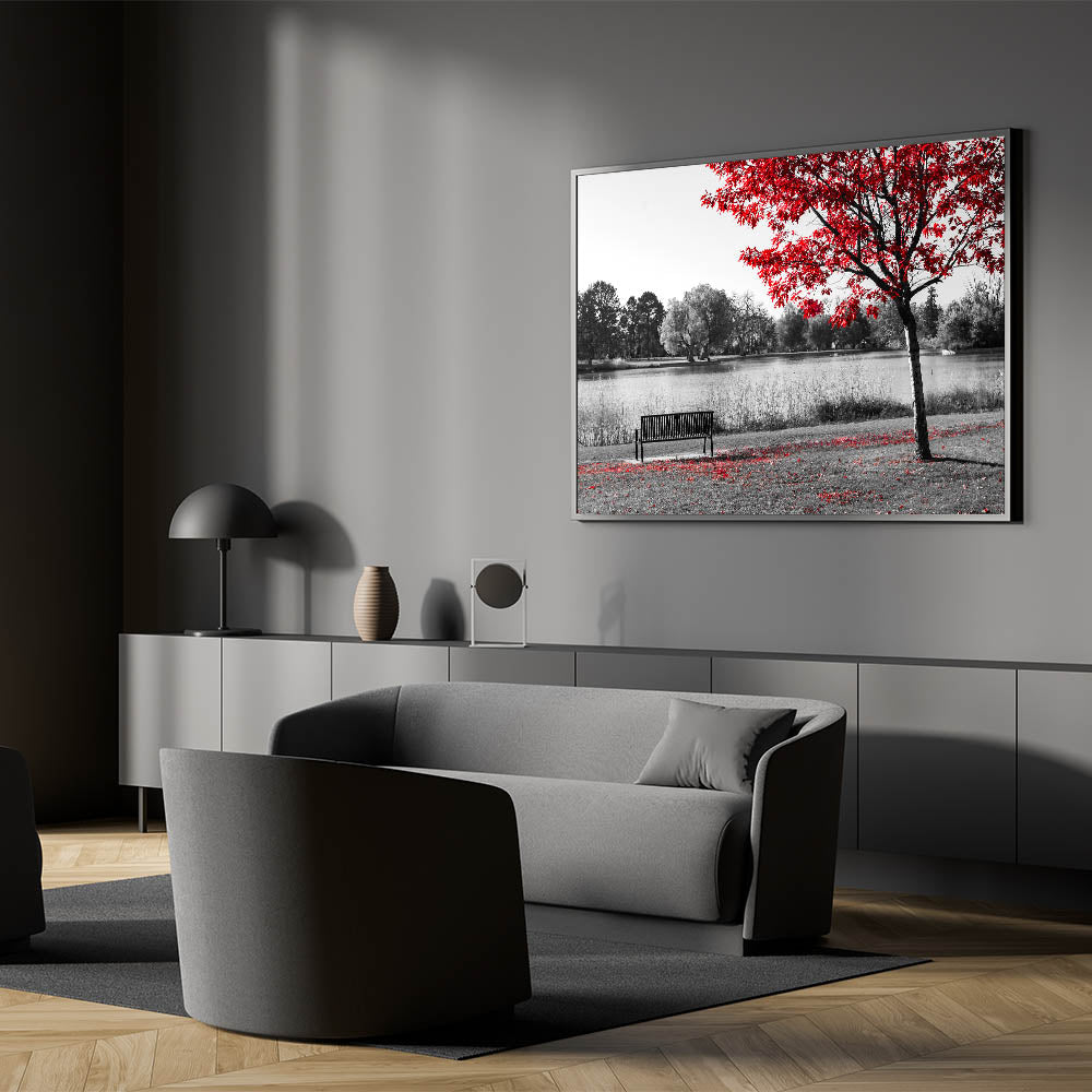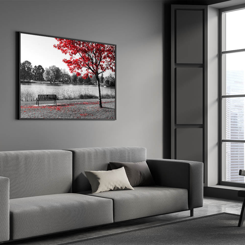 Make a bold statement in your home with this Striking Red Tree Art piece. This unique photograph captures the vibrant red leaves of a tree standing out against a serene black and white lakeside landscape. The contrast between the vivid red and the grayscale background creates a dramatic effect, making this Scenic Lake Photography a captivating focal point for any room.
