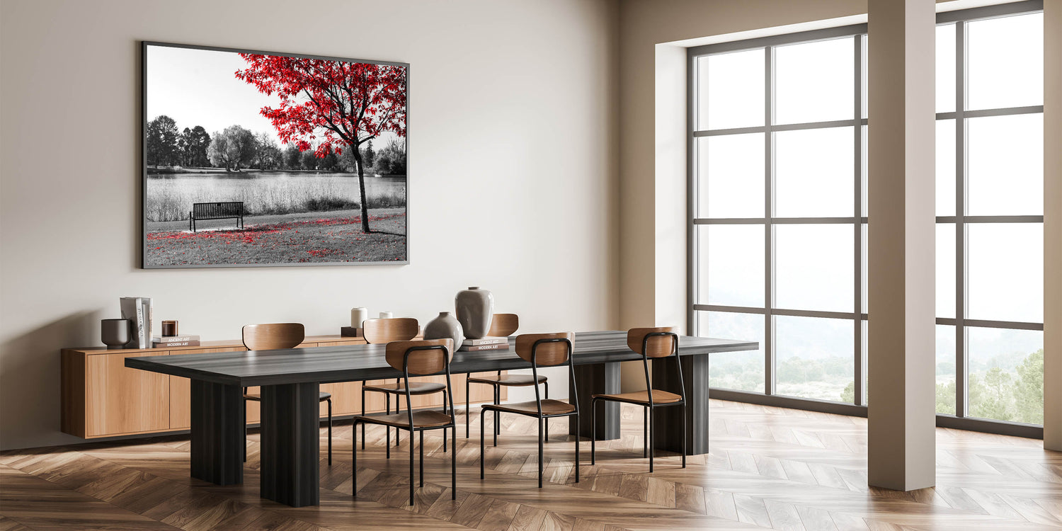 - Bold and Modern: The striking contrast of red against black and white in this Lakeside Landscape Art makes it perfect for modern, contemporary, or minimalist decor styles.