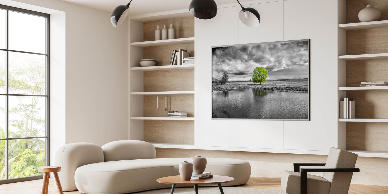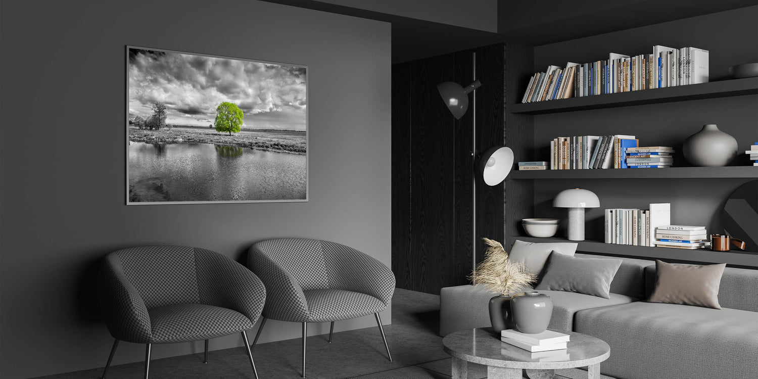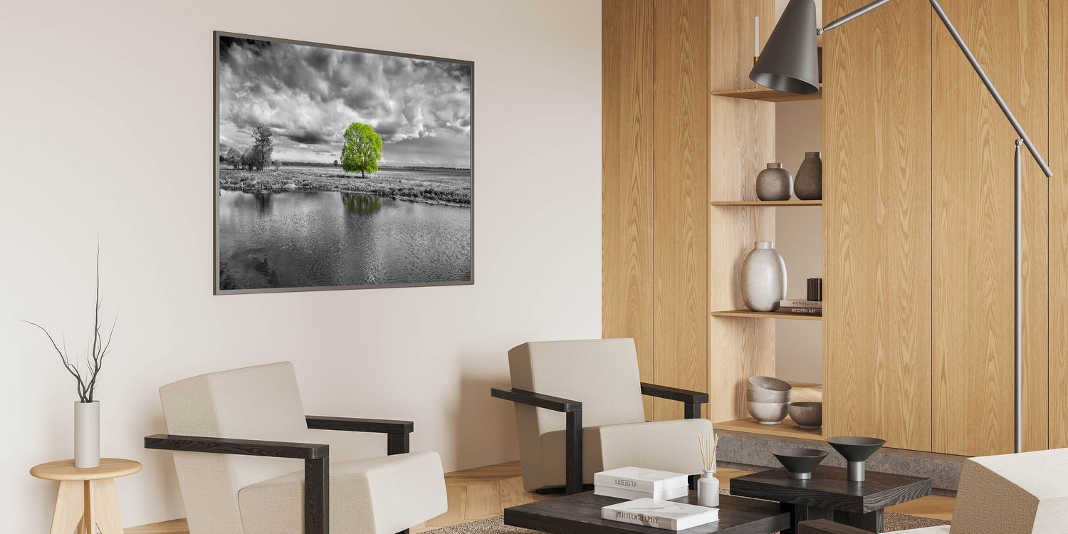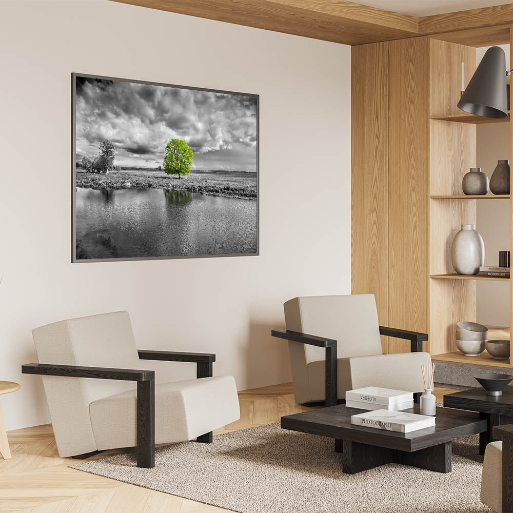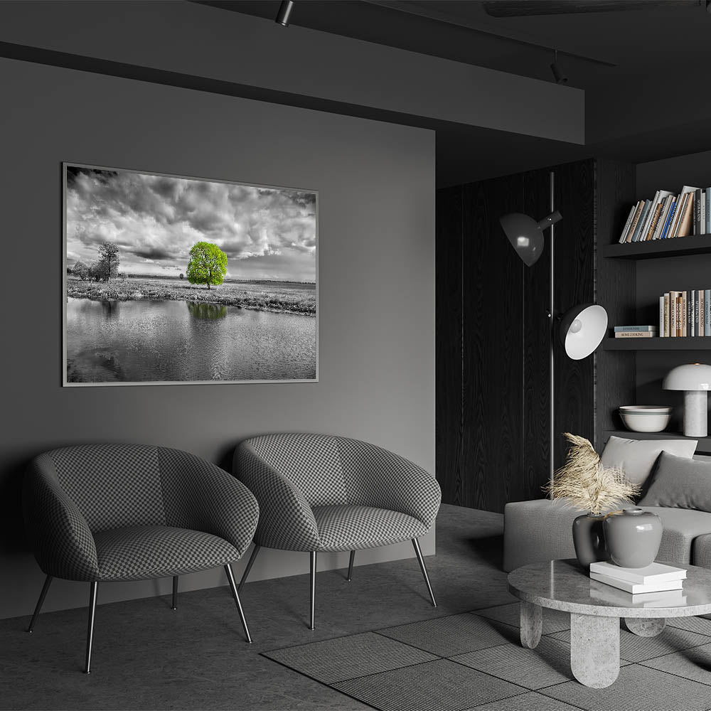 Elevate your space with this stunning marsh and swamp wall art, featuring a vibrant green tree standing out against a dramatic black and white landscape. The contrast between the vivid green foliage and the monochrome surroundings creates a powerful visual impact, making this artwork an eye-catching addition to any room.
