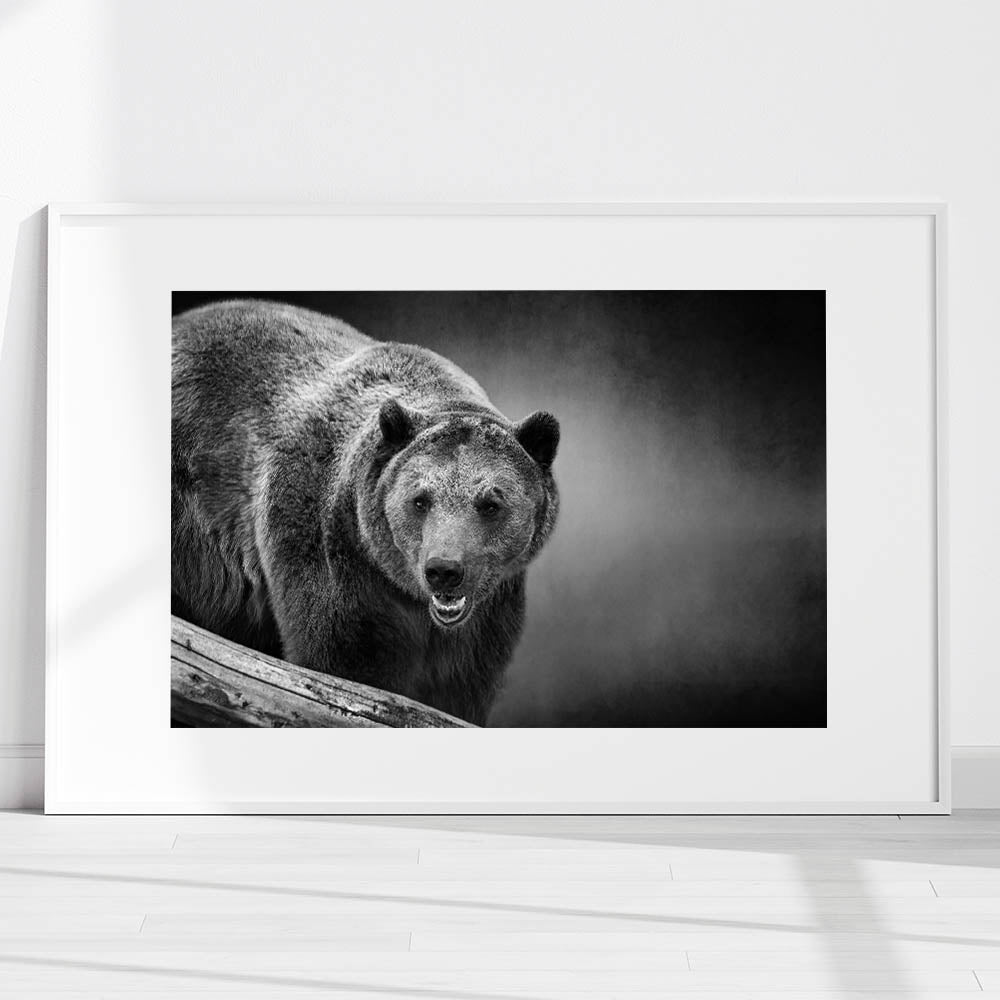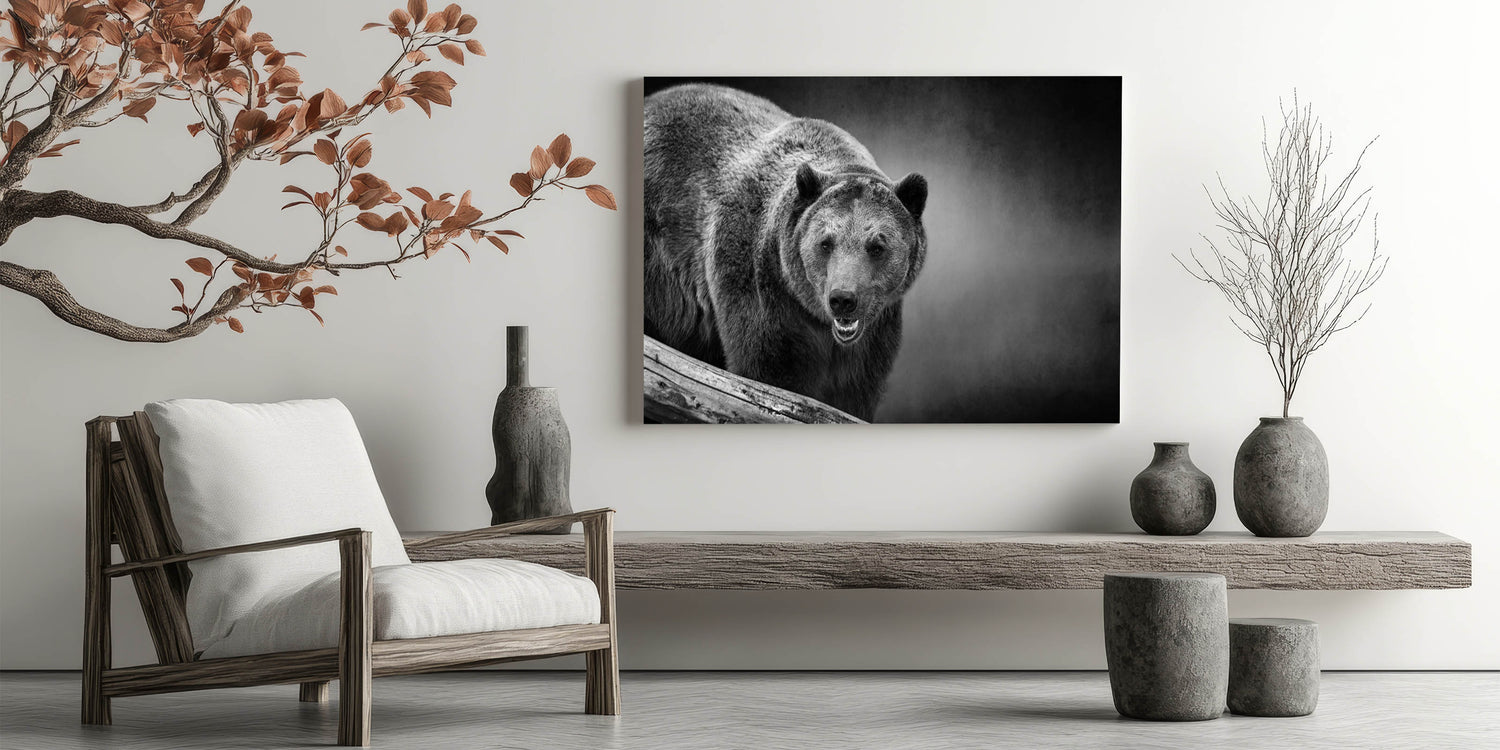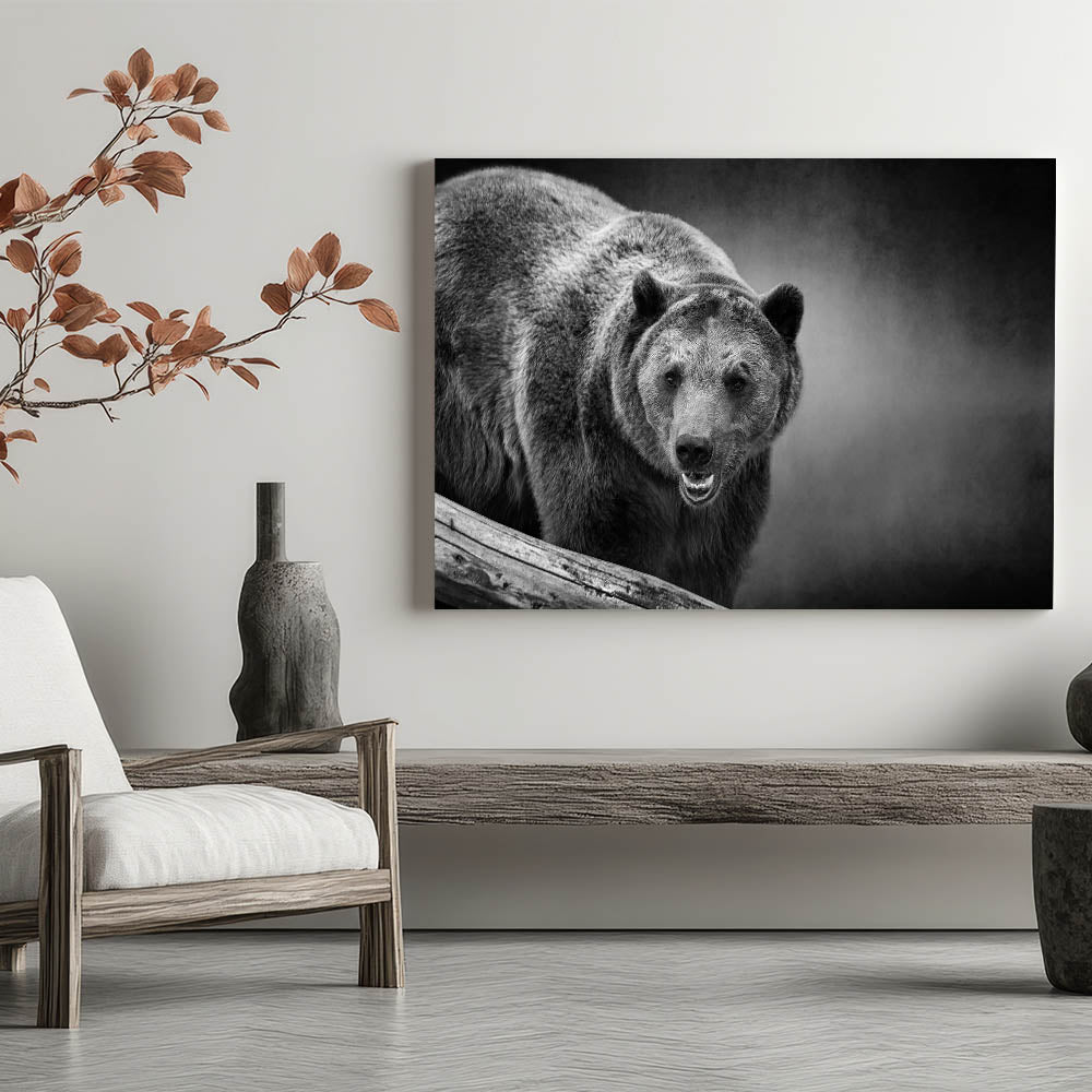 This bold wall art captures the fierce presence of a black bear on the prowl, rendered in stunning monochrome. The detailed textures of the bear’s fur and the intensity of its gaze create an image that exudes power and dominance. The dark, moody background enhances the bear's formidable appearance, making this piece a striking addition to any space. Perfect for those who appreciate the raw beauty of wildlife, this print adds a dramatic and powerful touch to your decor.