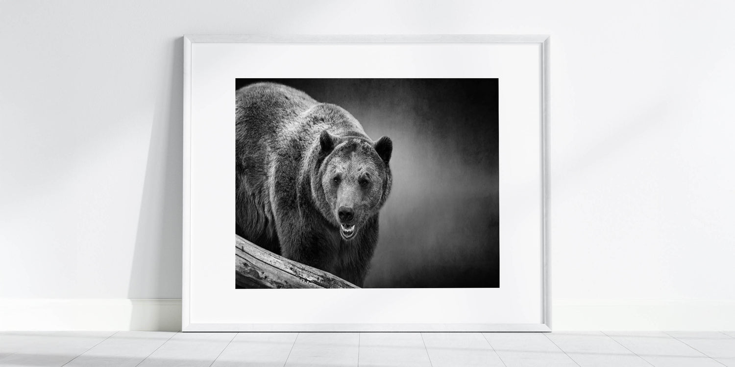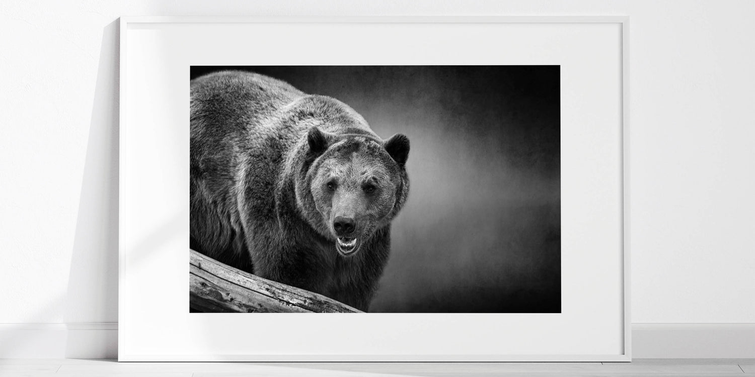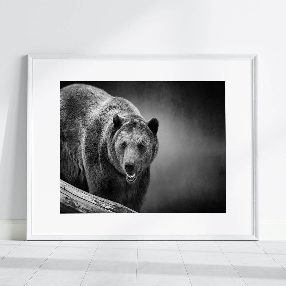 This bold wall art captures the fierce presence of a black bear on the prowl, rendered in stunning monochrome. The detailed textures of the bear’s fur and the intensity of its gaze create an image that exudes power and dominance. The dark, moody background enhances the bear's formidable appearance, making this piece a striking addition to any space. Perfect for those who appreciate the raw beauty of wildlife, this print adds a dramatic and powerful touch to your decor.