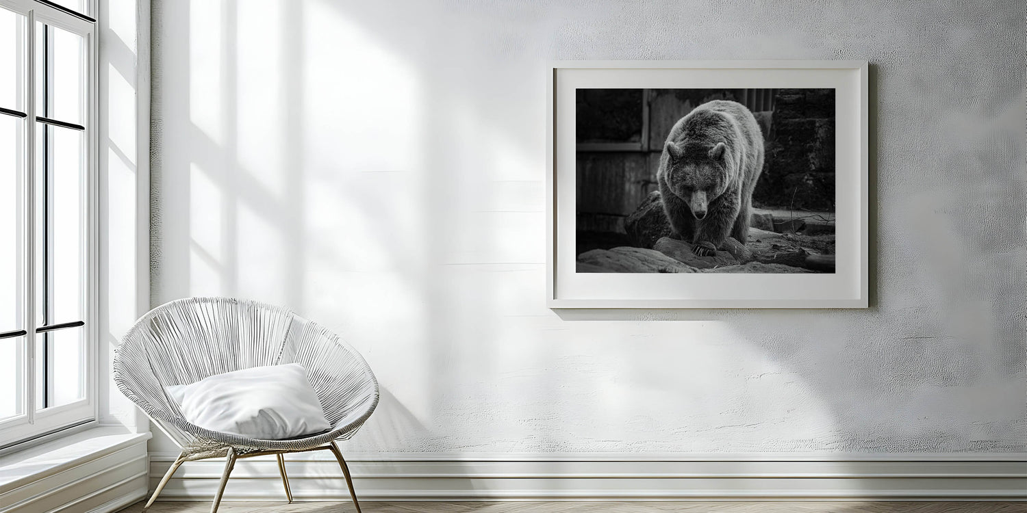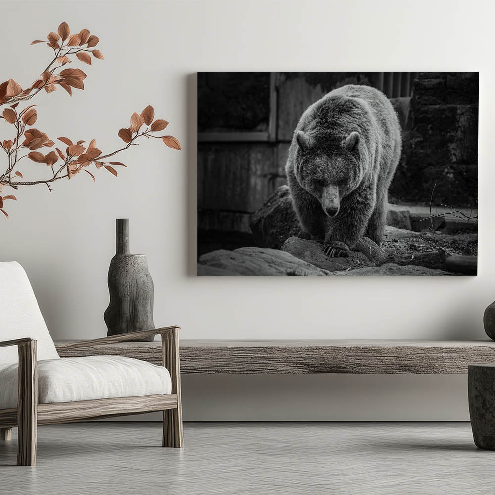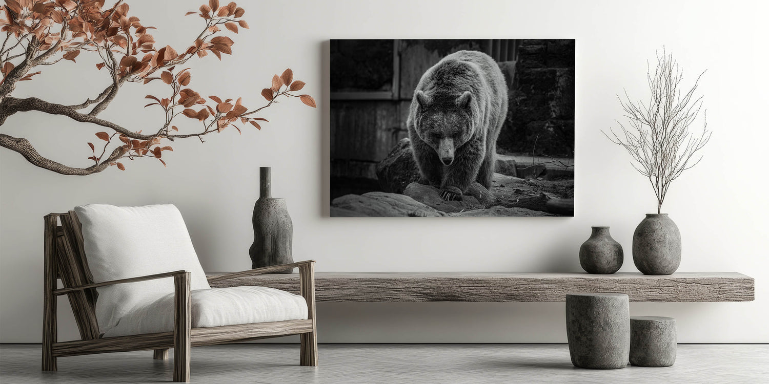 Embrace the quiet strength and majesty of nature with this elegant black and white bear wall art. This captivating photograph captures the bear in a moment of serene focus, its powerful presence emanating through every detail. Perfect for wildlife enthusiasts and those who appreciate the beauty of the wild, this high-quality bear photograph is available in various formats including stretched canvas, framed canvas, acrylic glass, and more, allowing you to select the ideal presentation for your space.