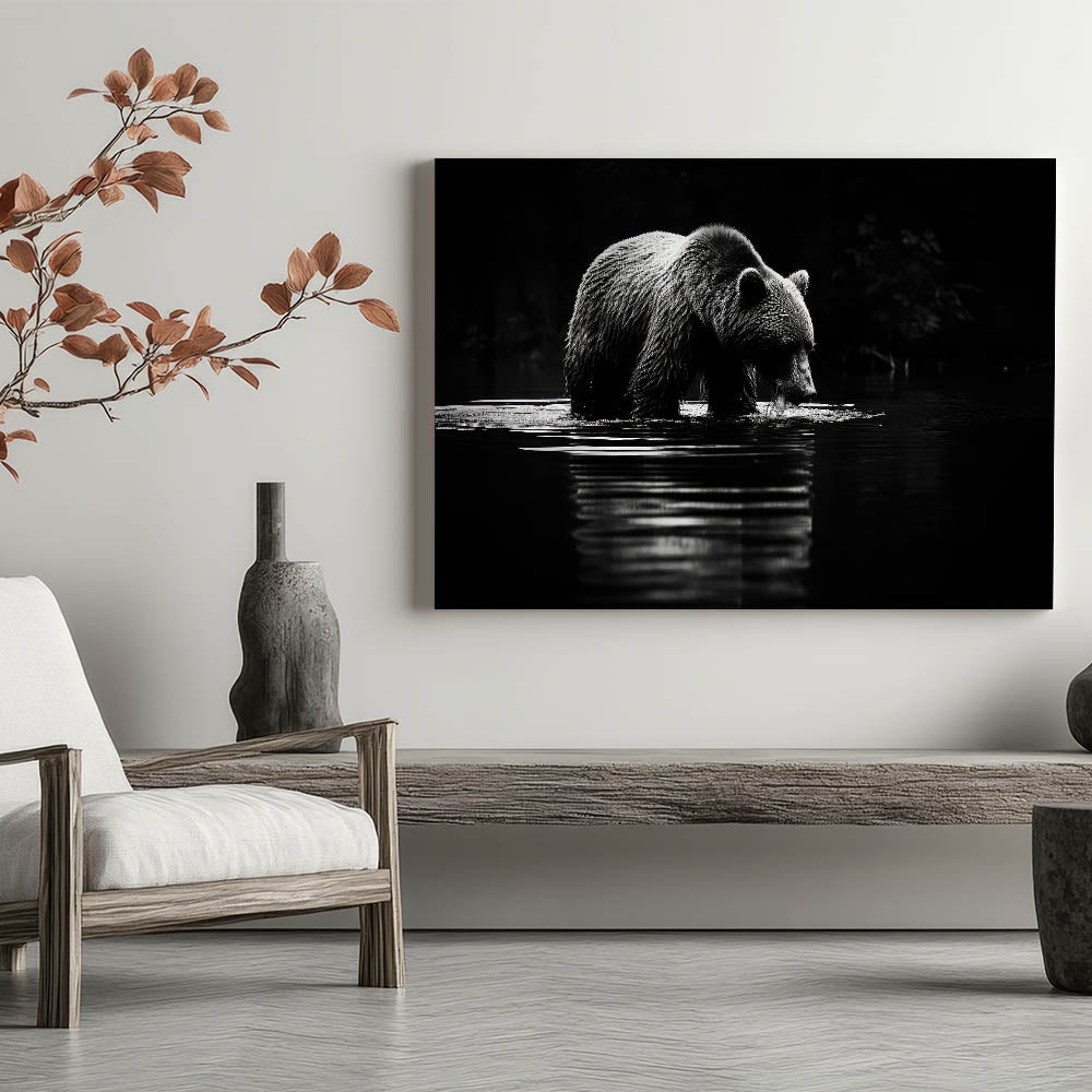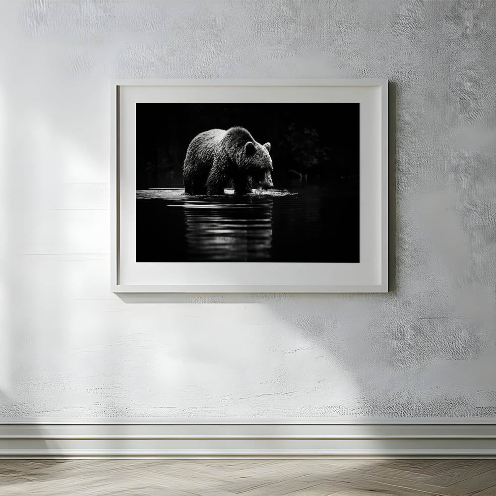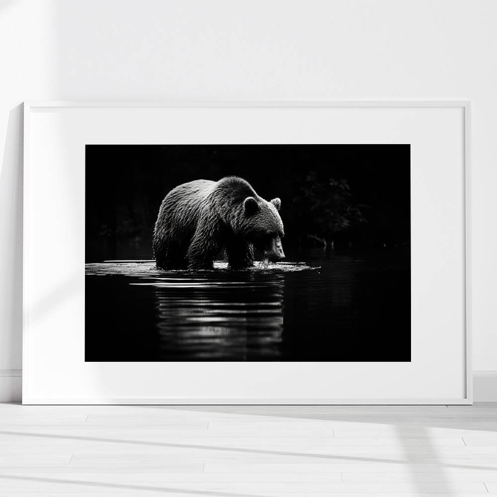 • Dramatic Contrast: The black and white tones emphasize the bear's form and the tranquil water, creating a captivating visual impact.
