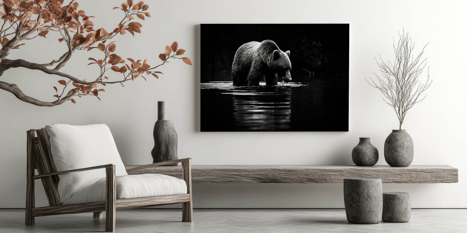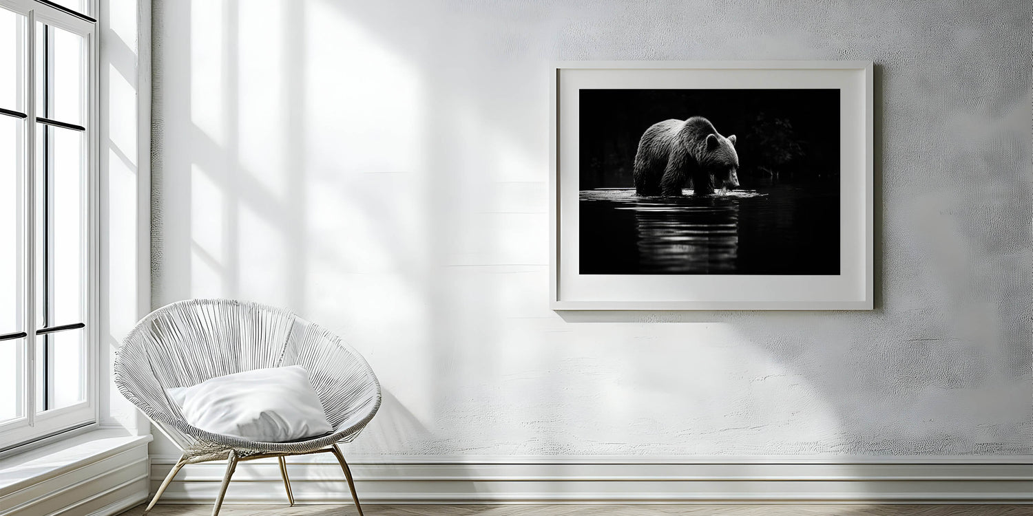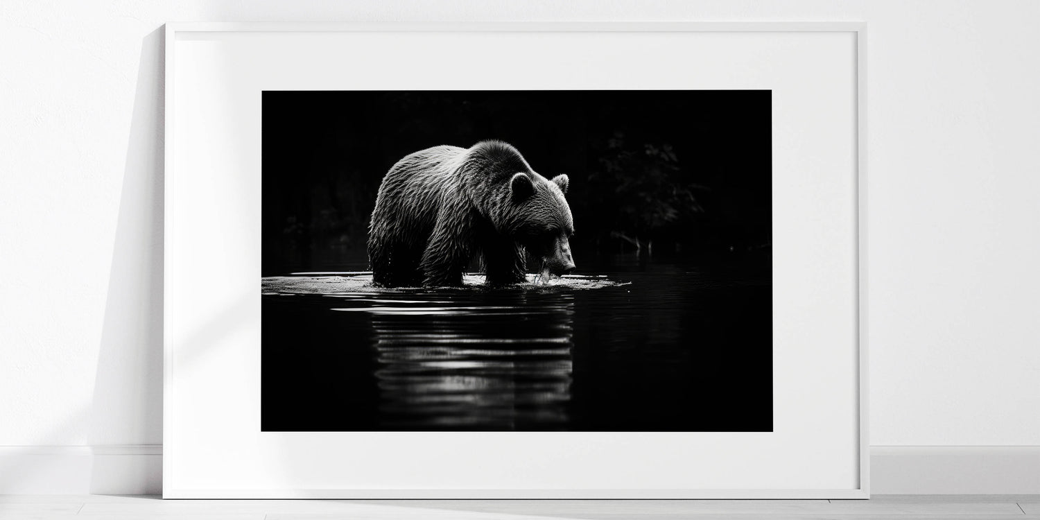• Dramatic Contrast: The black and white tones emphasize the bear's form and the tranquil water, creating a captivating visual impact.