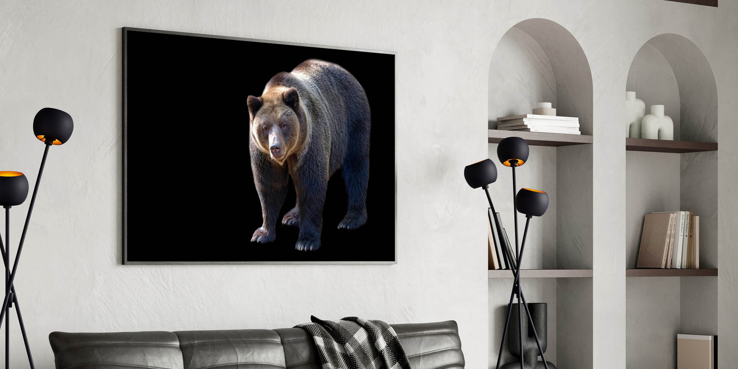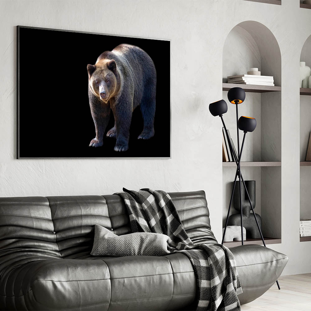 This striking wall art features a powerful brown bear set against a deep black background, highlighting its majestic presence and strength. The detailed texture of the bear’s fur and the intensity in its gaze make this piece a captivating addition to any space. The contrast between the bear’s warm, earthy tones and the dark backdrop creates a dramatic visual impact, perfect for those who appreciate the raw beauty of wildlife.