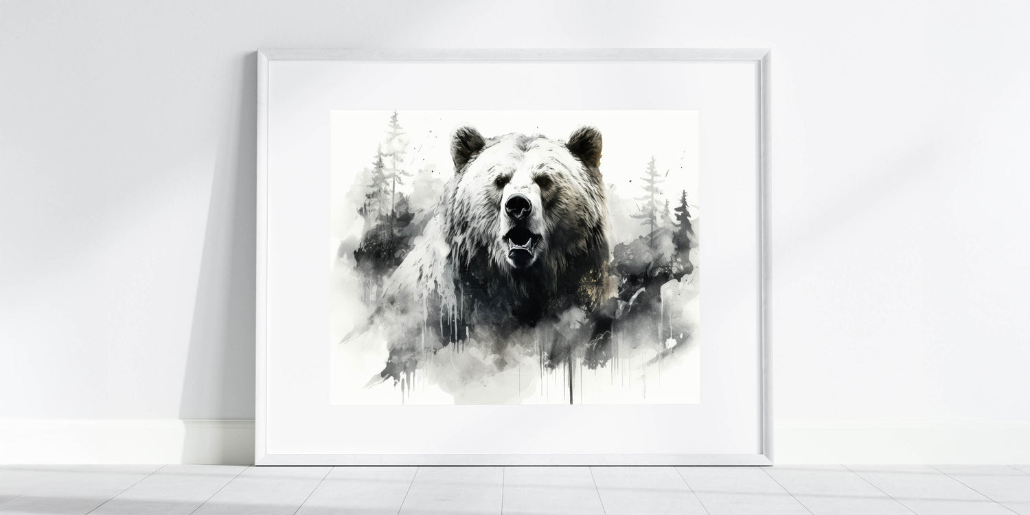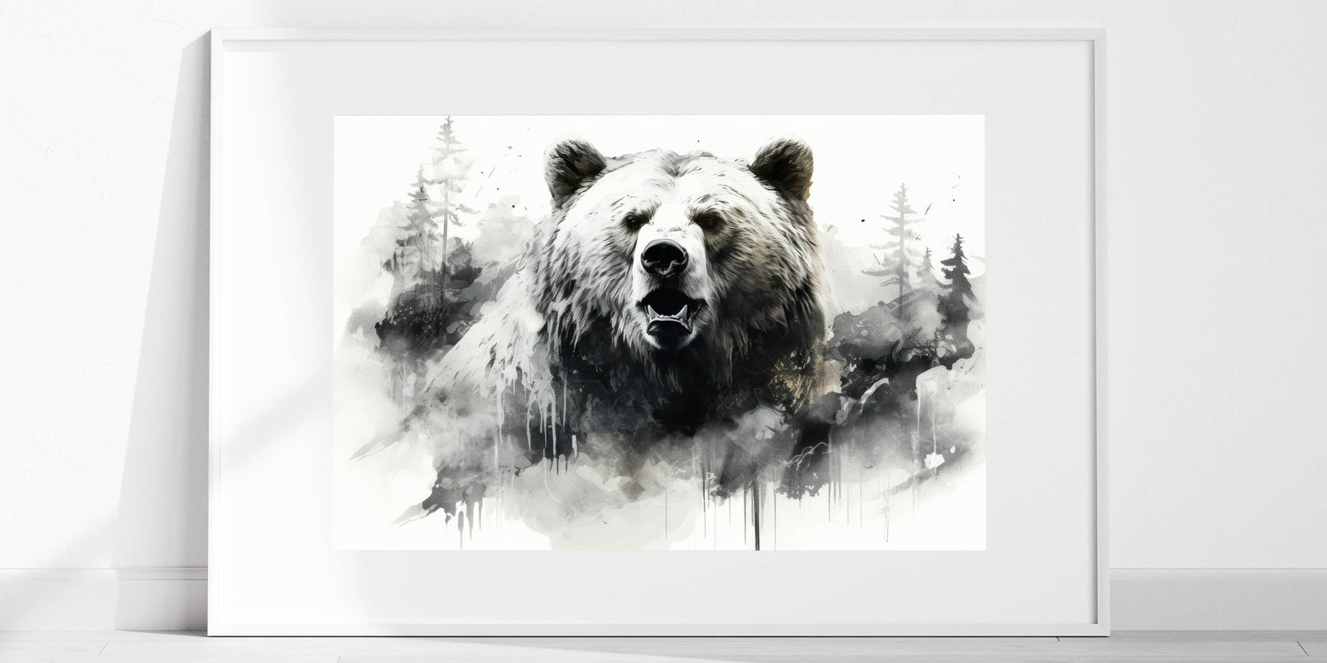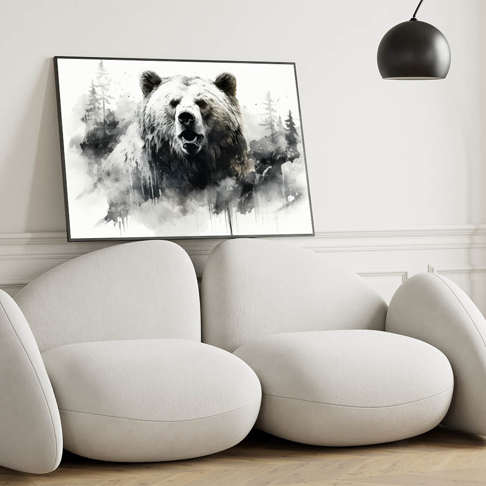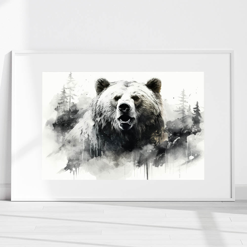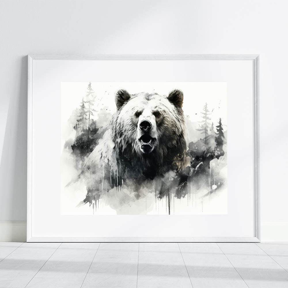Step into the wild with this powerful monochrome grizzly bear wall art. The dramatic black and white tones emphasize the bear's fierce presence, creating an image that is both intense and captivating. The subtle, watercolor-inspired background adds depth and motion to the piece, blending the natural world with artistic expression. This artwork is perfect for those who admire the raw power of nature and want to bring a bold statement into their home.