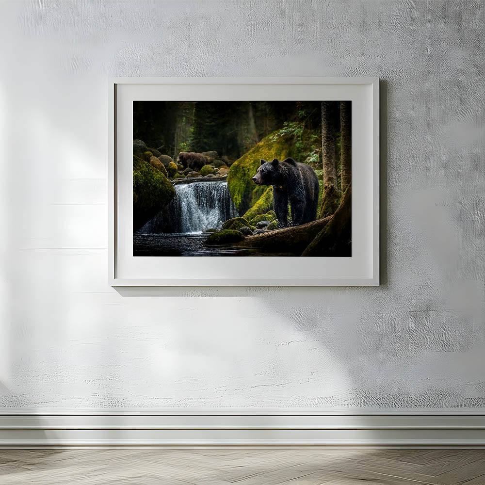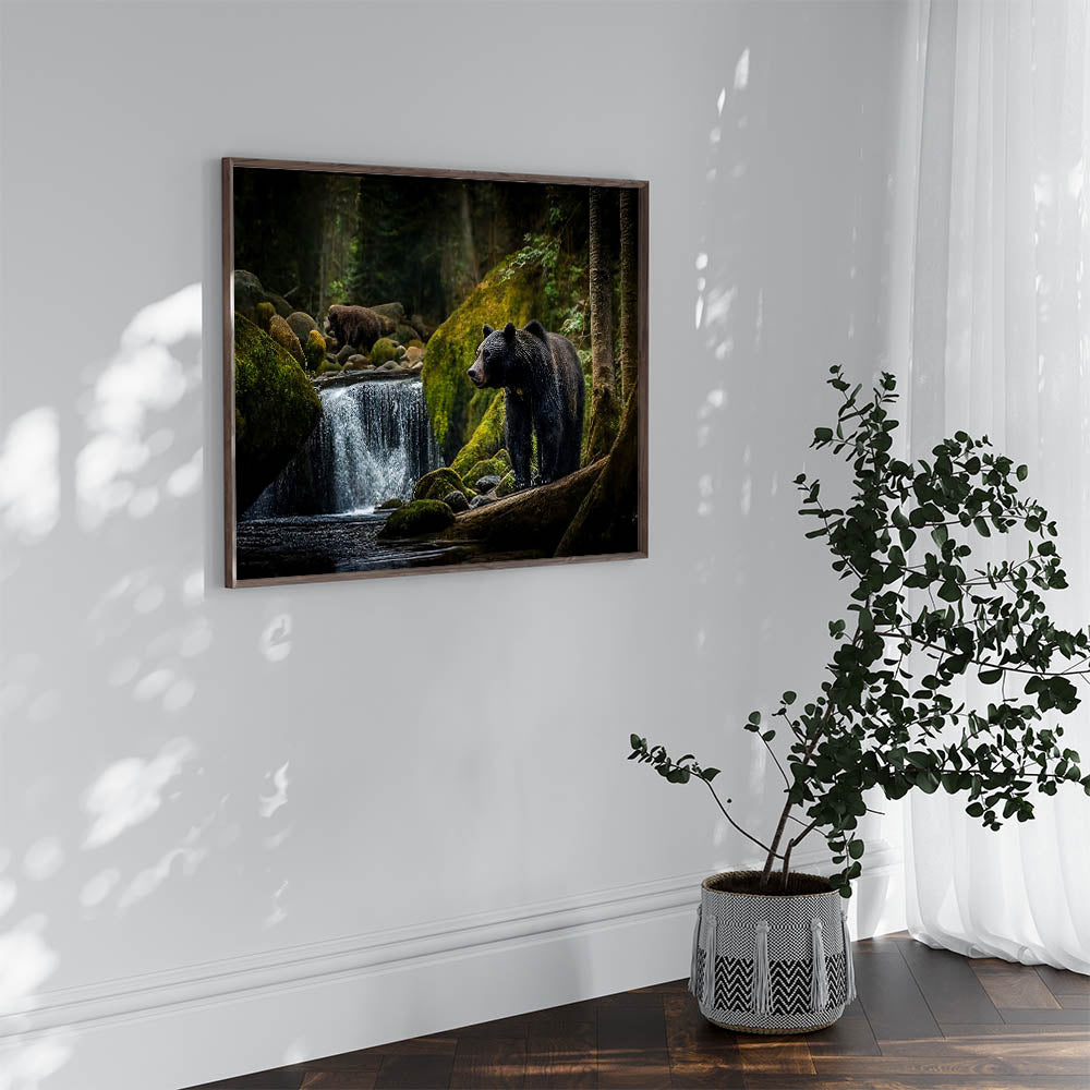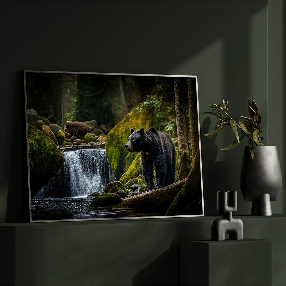 Explore the peaceful yet powerful world of nature with this stunning bear forest wall art. This captivating photograph captures two majestic bears in their natural habitat, surrounded by the lush greenery of the forest and the serene flow of a waterfall. The contrast between the dark, shadowy trees and the vibrant moss-covered rocks brings depth and richness to the scene, making it an ideal choice for those who appreciate the beauty of the wild. This high-quality bear photograph is available in various formats, including stretched canvas, framed canvas, acrylic glass, and more, allowing you to bring this tranquil yet powerful image into your home.