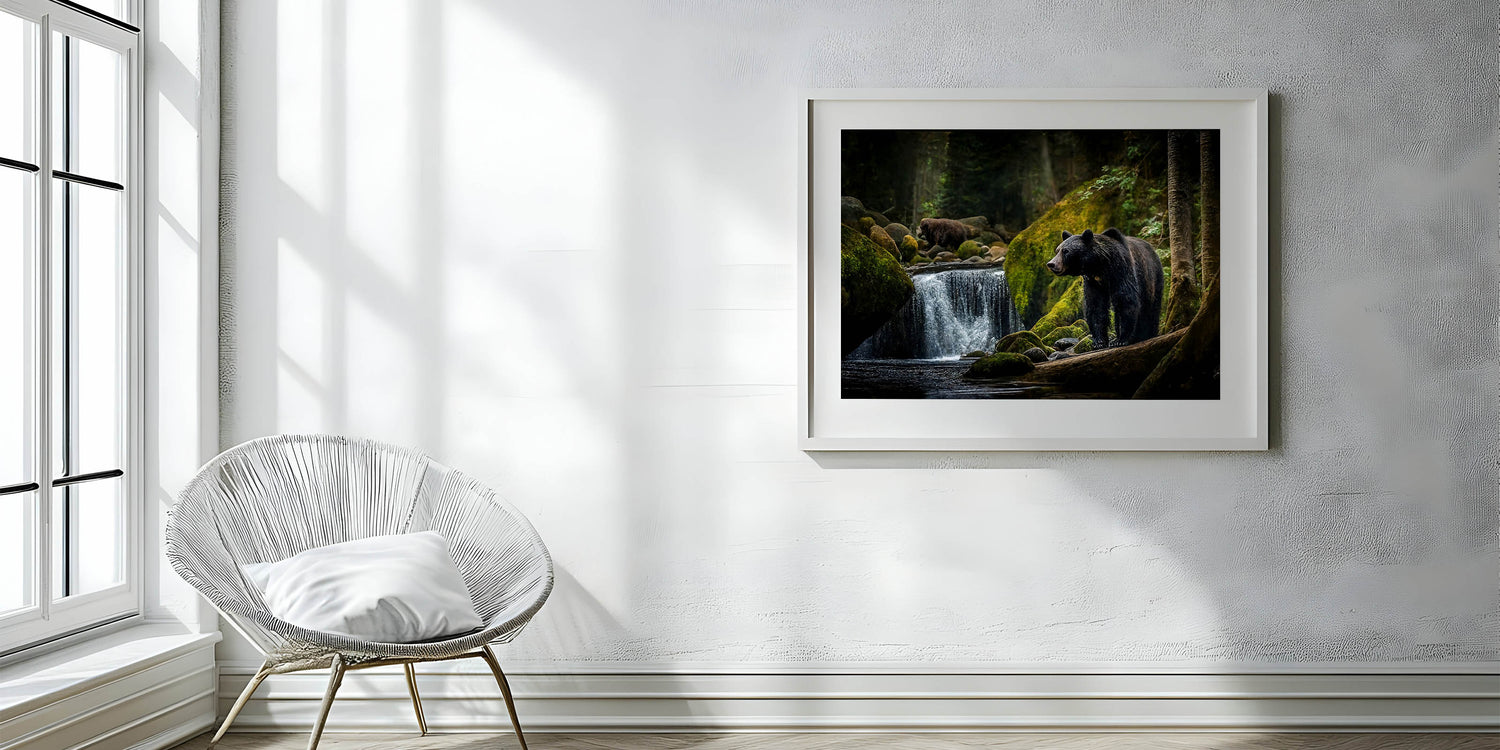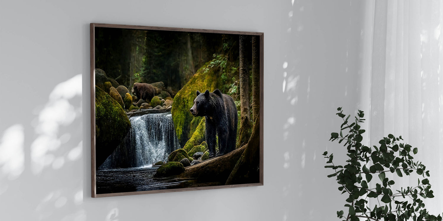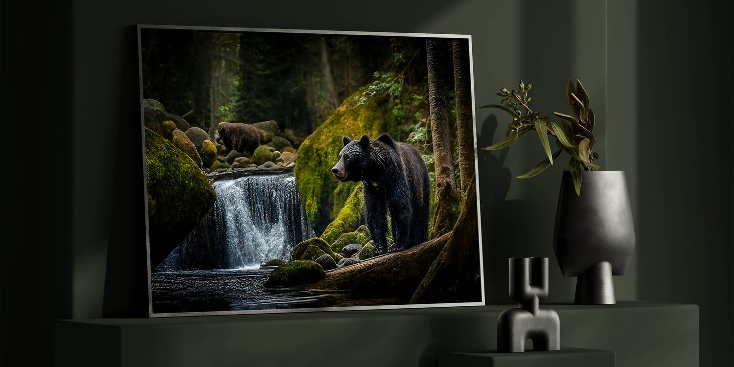 Explore the peaceful yet powerful world of nature with this stunning bear forest wall art. This captivating photograph captures two majestic bears in their natural habitat, surrounded by the lush greenery of the forest and the serene flow of a waterfall. The contrast between the dark, shadowy trees and the vibrant moss-covered rocks brings depth and richness to the scene, making it an ideal choice for those who appreciate the beauty of the wild. This high-quality bear photograph is available in various formats, including stretched canvas, framed canvas, acrylic glass, and more, allowing you to bring this tranquil yet powerful image into your home.
