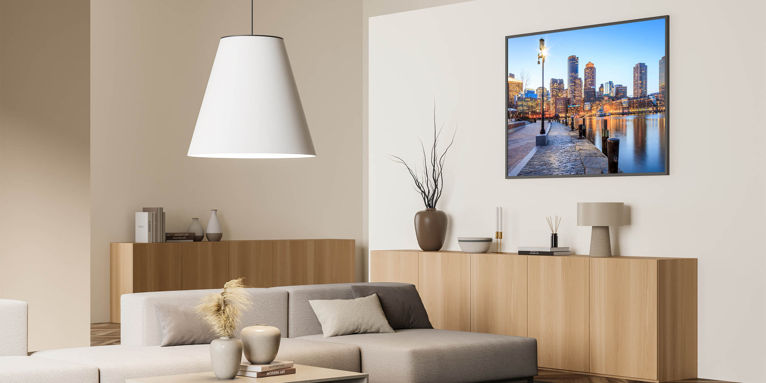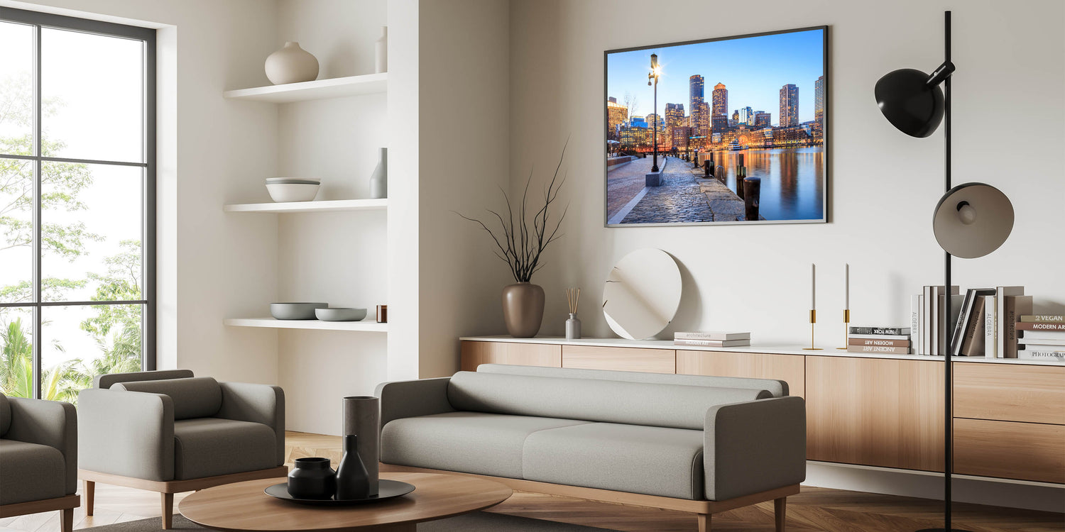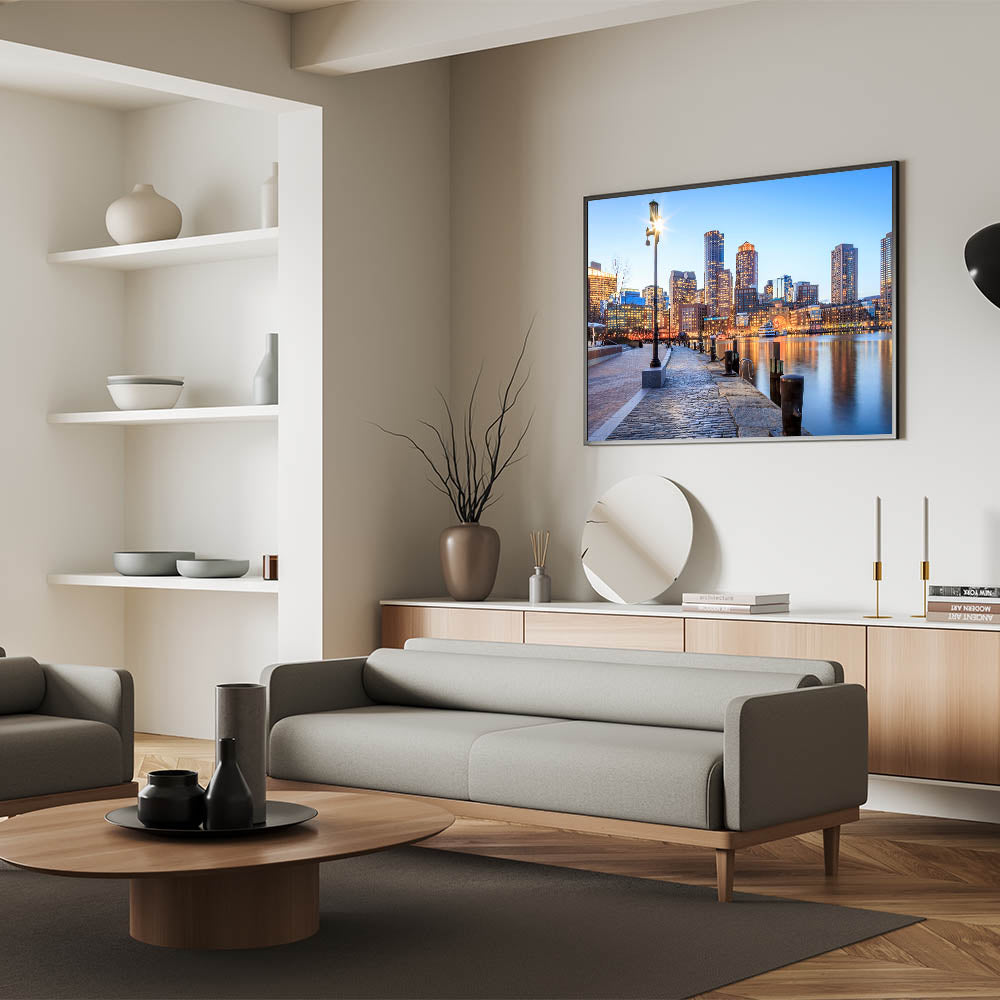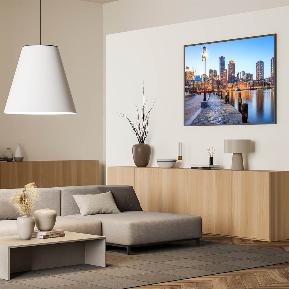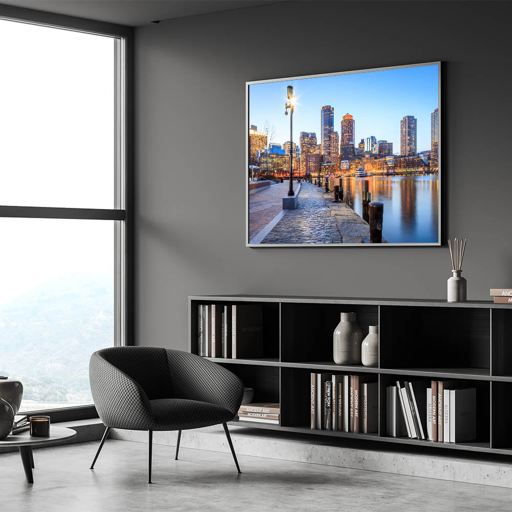 Enhance your space with the serene beauty of this Boston skyline wall art, capturing the city’s waterfront at twilight. This artwork showcases the city’s iconic buildings glowing with evening lights, reflected in the calm waters of the harbor. The cobblestone walkway and street lamp in the foreground add a touch of charm, making this piece perfect for those who appreciate urban landscapes with a peaceful, inviting atmosphere.