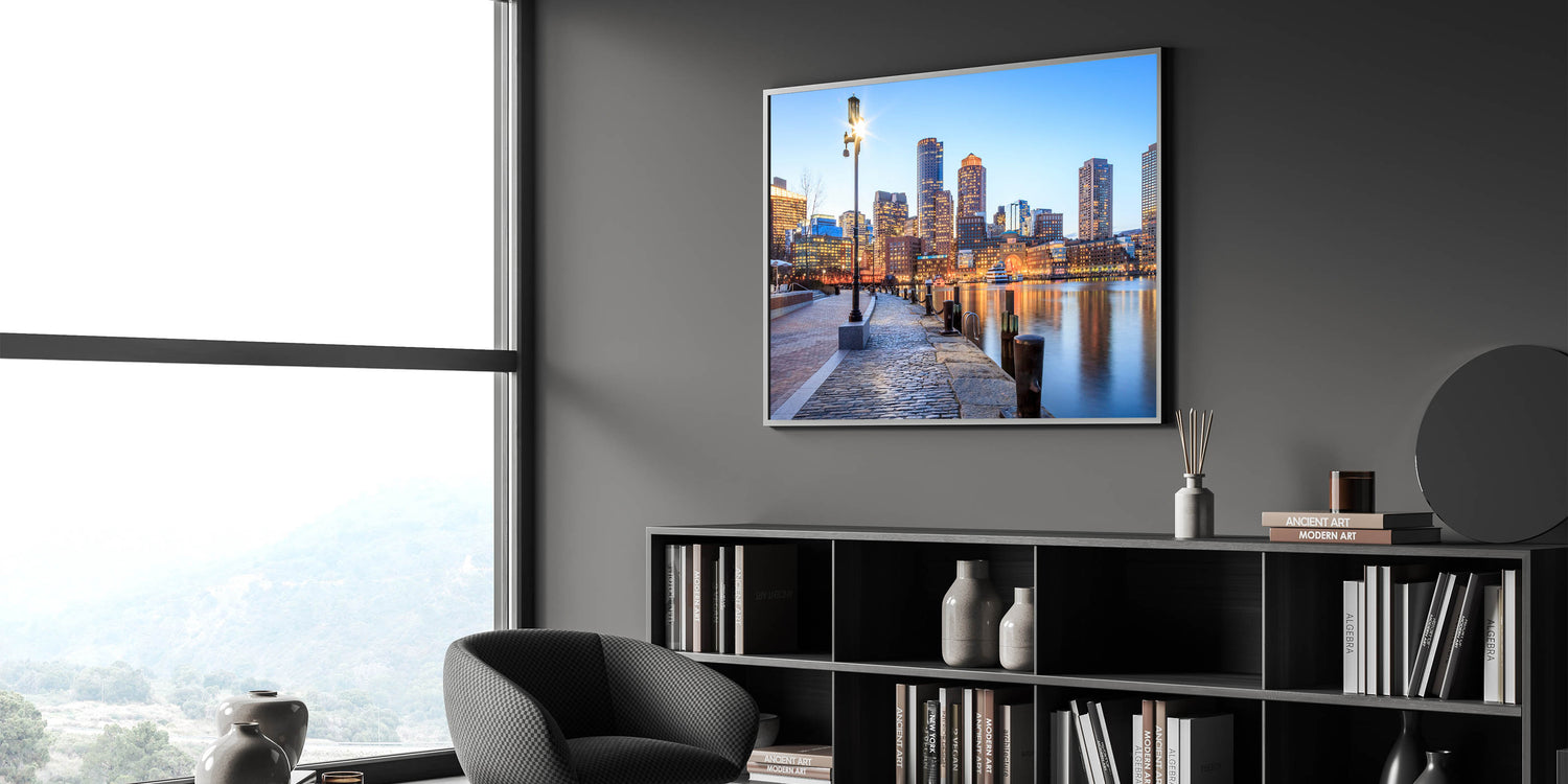 - High-Resolution Print: The vibrant colors and crisp details in this Boston harbor art highlight the city’s beauty at dusk.