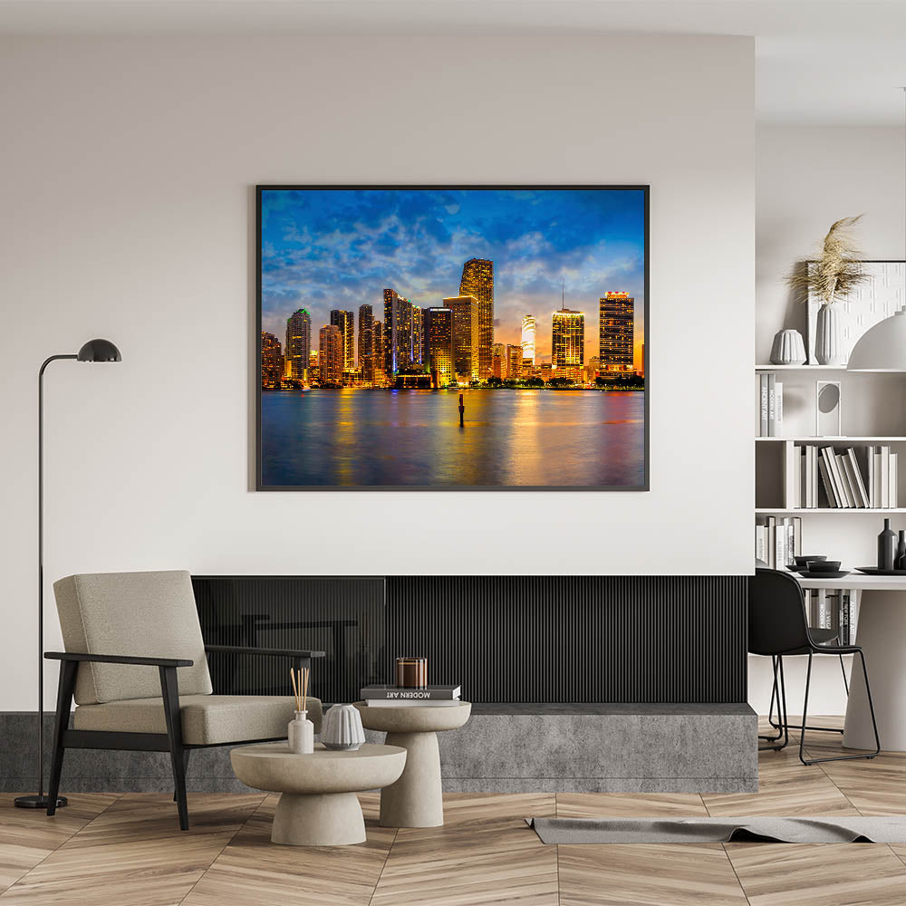 Illuminate your space with this stunning Boston skyline wall art, capturing the city’s dazzling lights reflected in the calm waters of the harbor. This artwork showcases Boston’s iconic buildings glowing vibrantly against the night sky, with hues of blue, orange, and yellow creating a mesmerizing scene. Perfect for those who love urban landscapes and the energy of city life, this piece brings a lively and modern touch to any room.