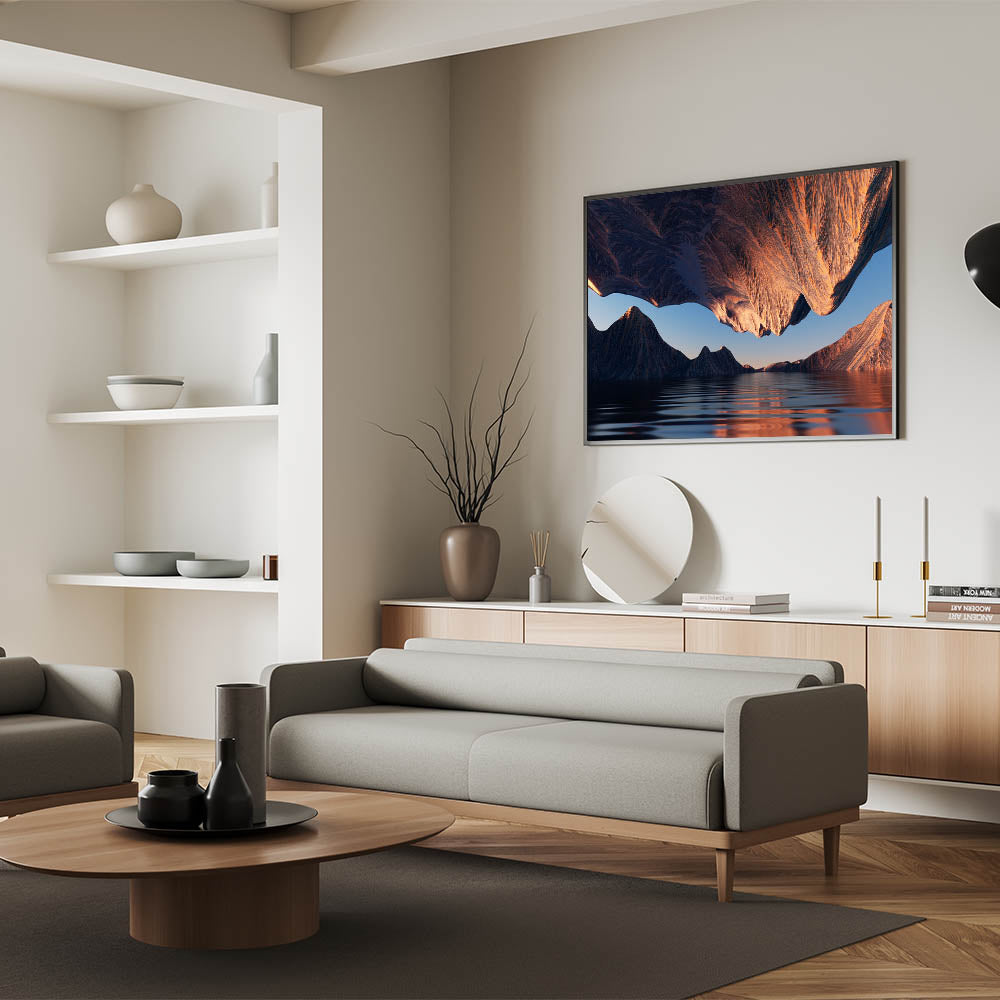 Bring a touch of surreal beauty to your home with this abstract canyon reflection wall art. This mesmerizing piece captures a canyon landscape in a unique and imaginative way, with the canyon walls seemingly hovering above a serene body of water. The rich, warm tones of the canyon contrast beautifully with the cool blues of the sky and water, creating a stunning visual effect that draws the eye and ignites the imagination.