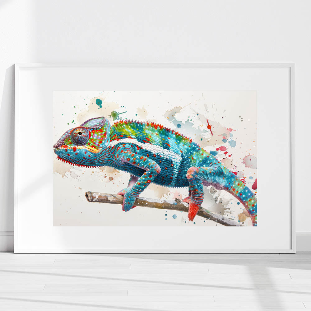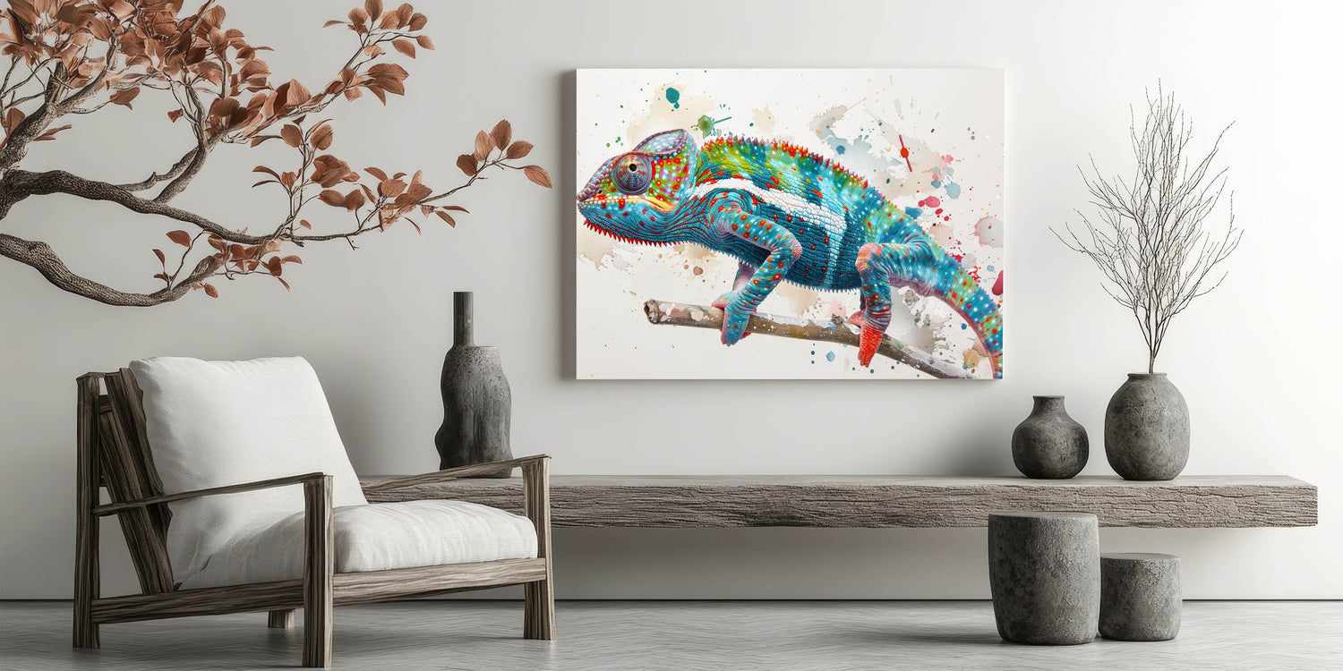 Elevate your home decor with this abstract chameleon wall art that bursts with color and energy. This piece captures the beauty of a chameleon in vivid detail, set against an expressive, paint-splattered background that adds a modern, artistic touch to any room. Perfect for those who appreciate bold, colorful designs and unique reptile-themed decor, this artwork will surely become a conversation starter.
