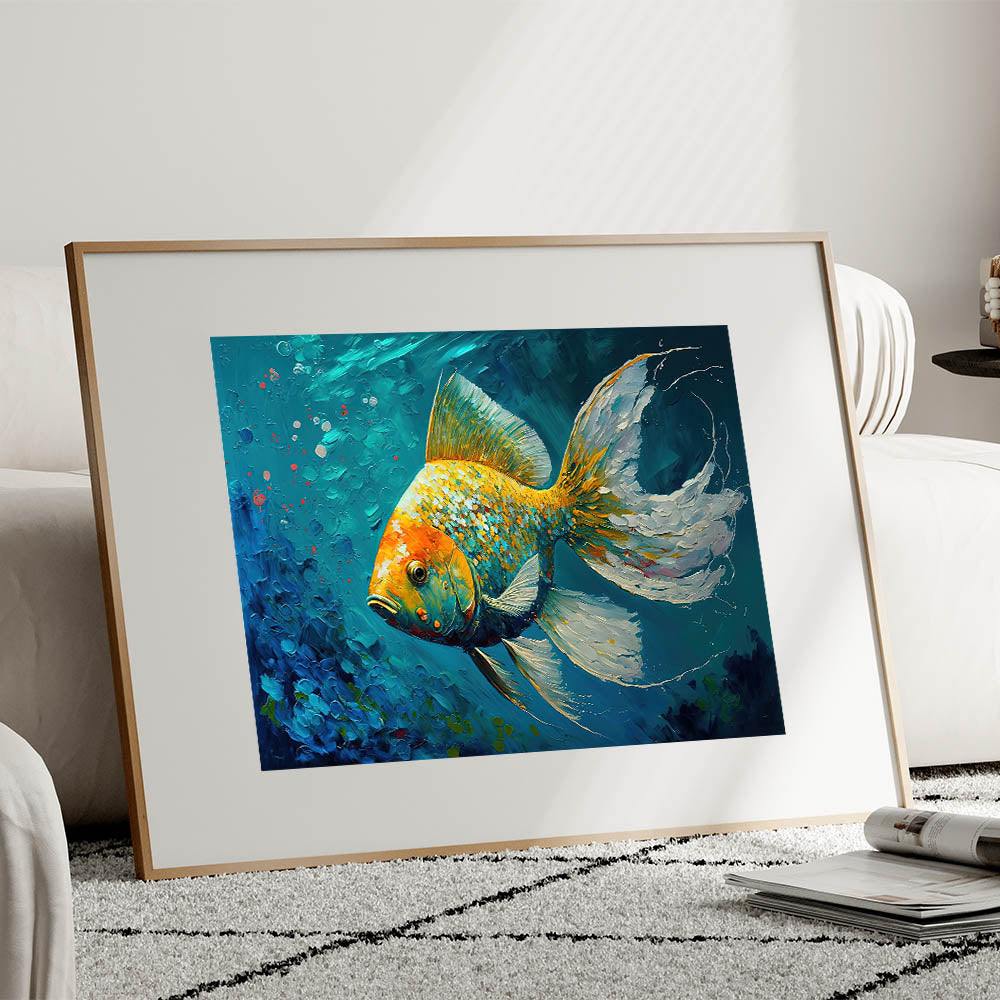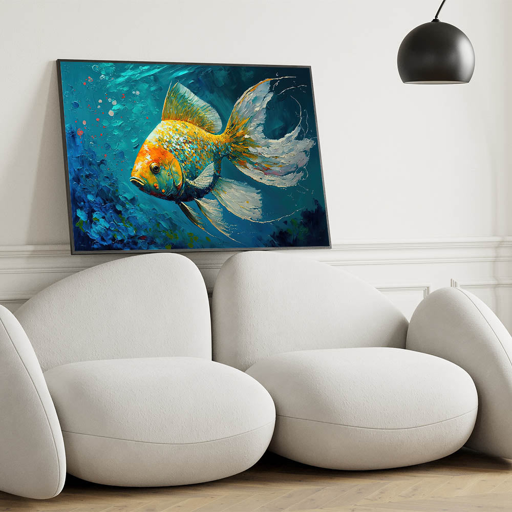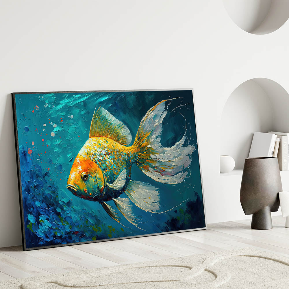 - Marine Life Art: The goldfish is depicted in vibrant shades of yellow, orange, and blue, set against a deep oceanic backdrop, adding depth and movement to the artwork.