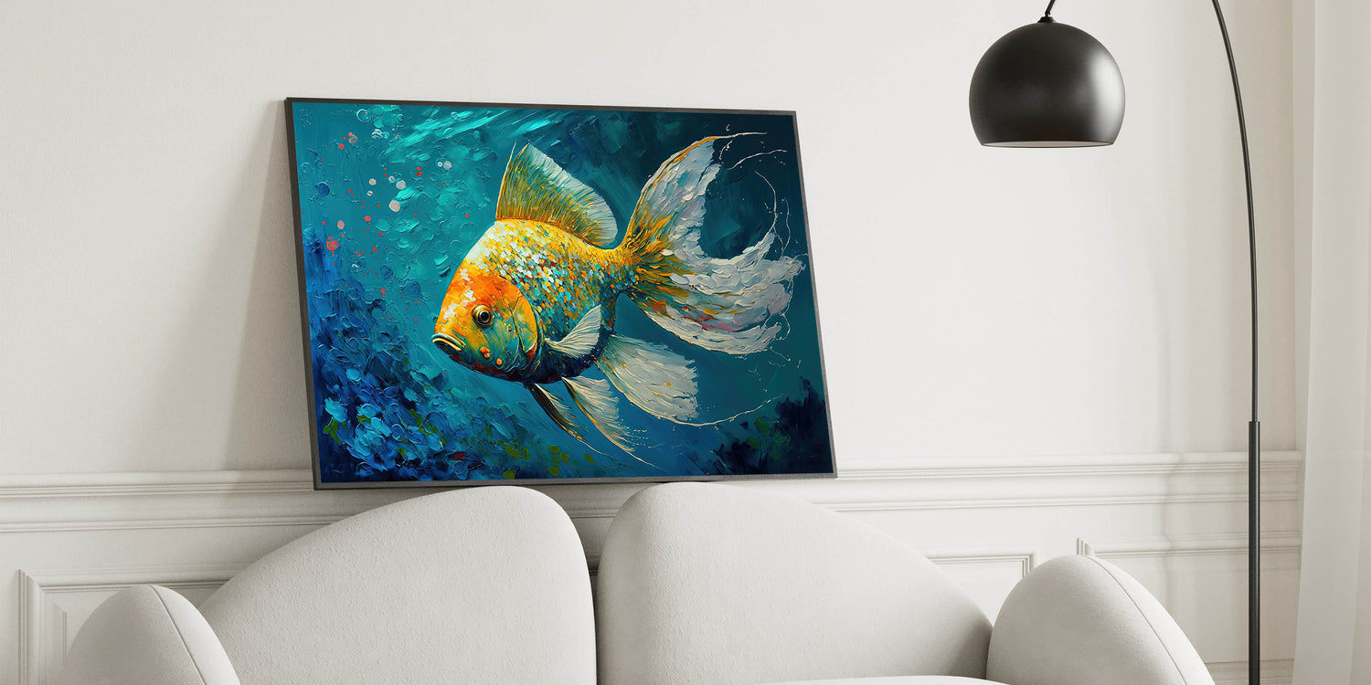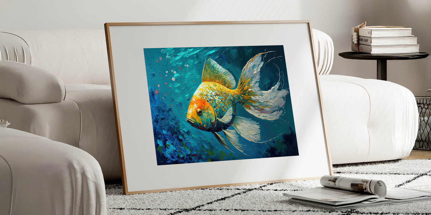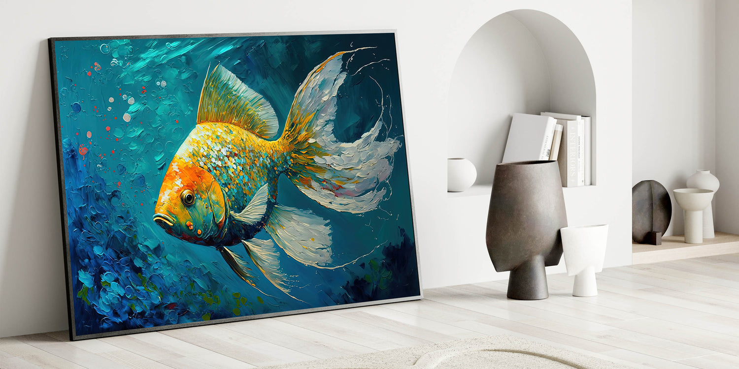 - Marine Life Art: The goldfish is depicted in vibrant shades of yellow, orange, and blue, set against a deep oceanic backdrop, adding depth and movement to the artwork.