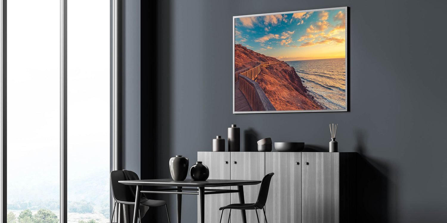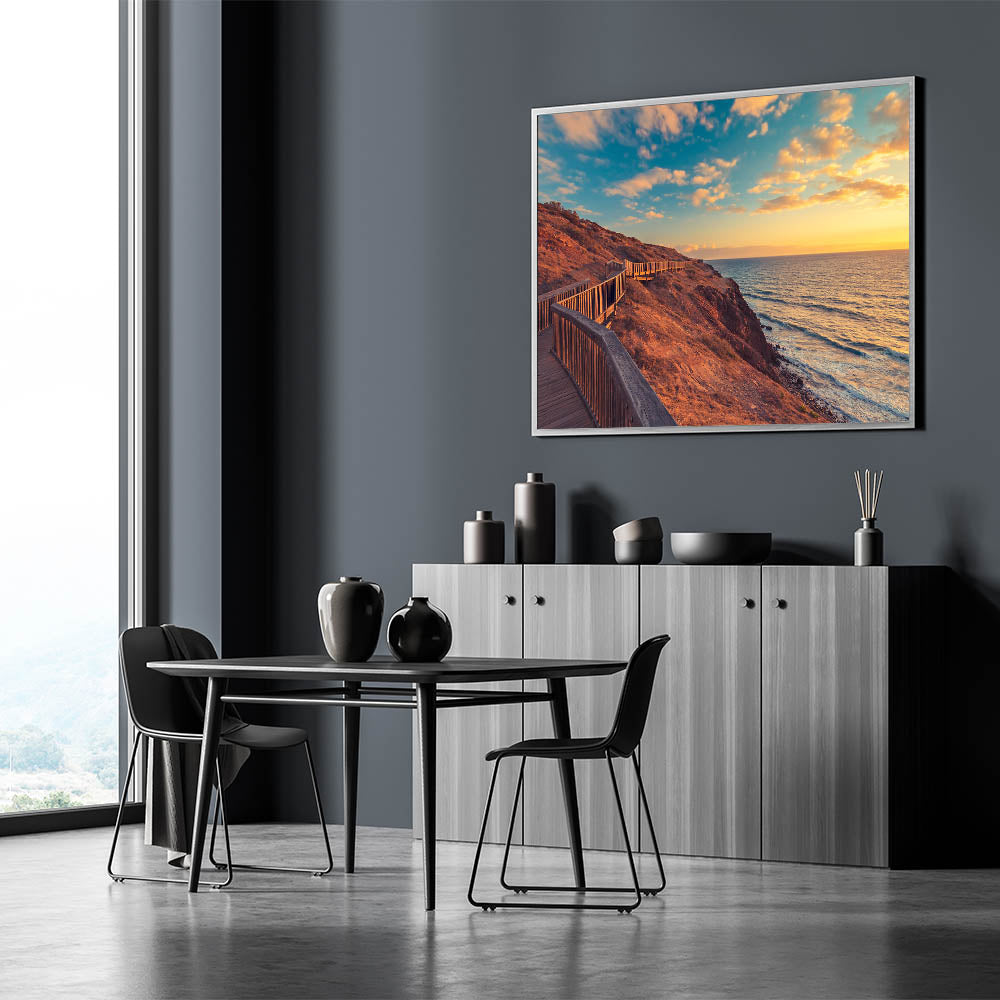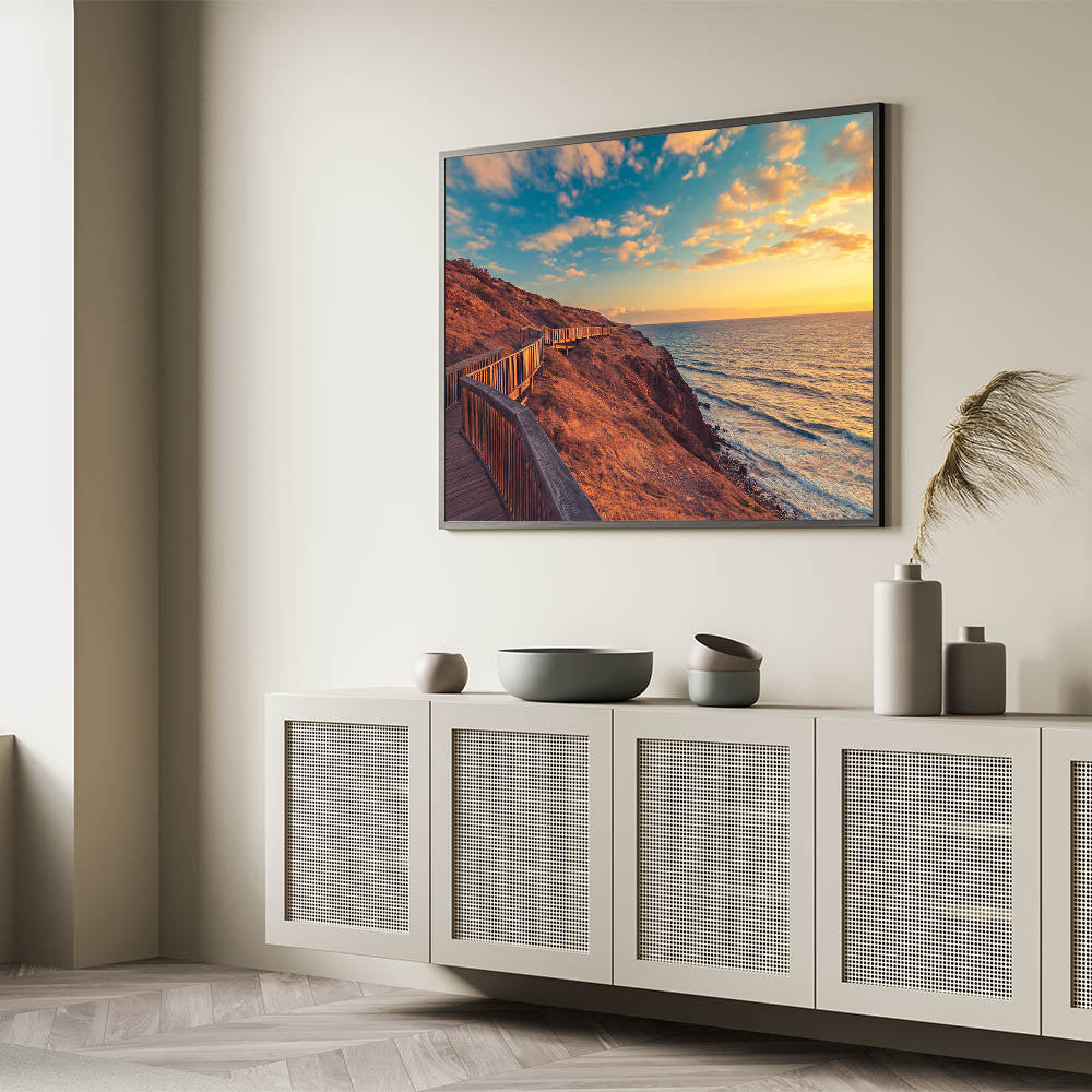 Add a touch of South Australia's breathtaking coastline to your home with this stunning Adelaide wall art. Featuring a serene boardwalk stretching along the rugged coastline at sunset, this art print captures the beauty of the golden hour over the ocean. The warm hues of the sunset combined with the natural textures of the cliffs create a calming and inviting scene, perfect for any space.