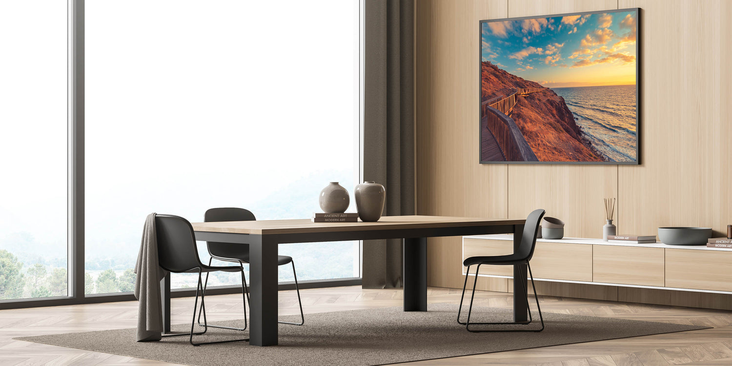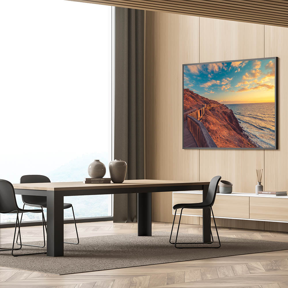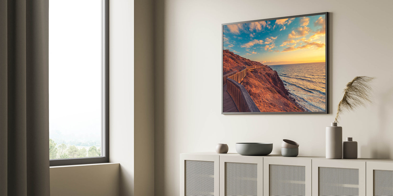 Add a touch of South Australia's breathtaking coastline to your home with this stunning Adelaide wall art. Featuring a serene boardwalk stretching along the rugged coastline at sunset, this art print captures the beauty of the golden hour over the ocean. The warm hues of the sunset combined with the natural textures of the cliffs create a calming and inviting scene, perfect for any space.