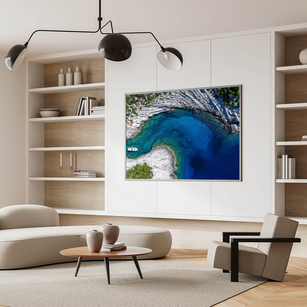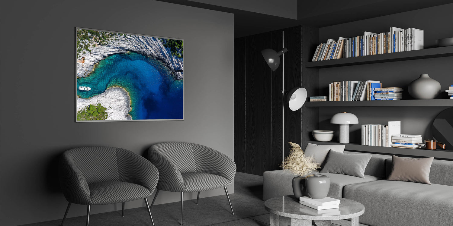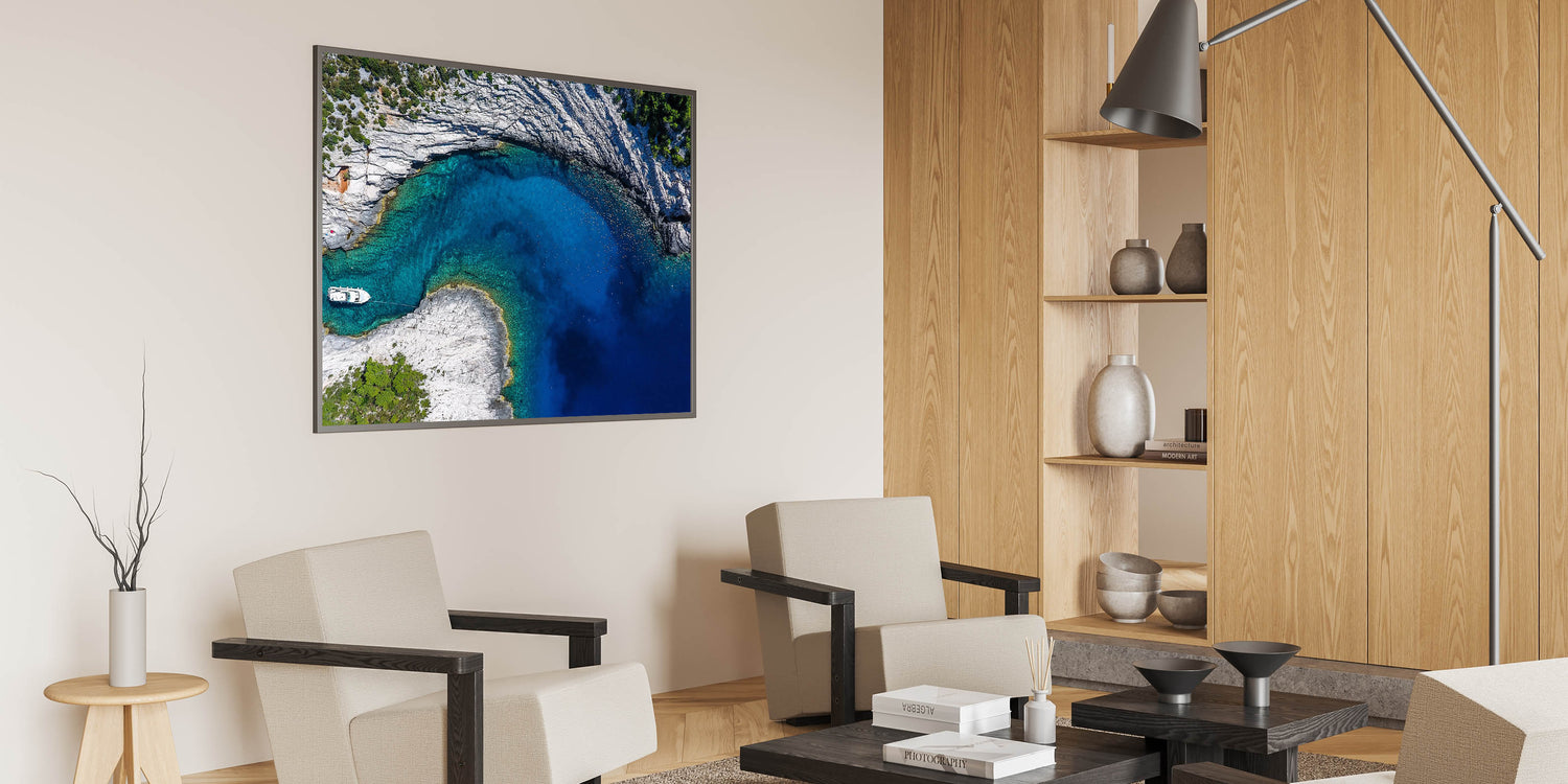 Elevate your decor with our "Aerial View of Croatian Cove Print" from the Croatia Scenery By Region Collection. This striking piece captures the untouched beauty of a secluded Croatian cove, where azure waters meet rugged limestone cliffs, creating a breathtaking panorama that’s both vibrant and serene.