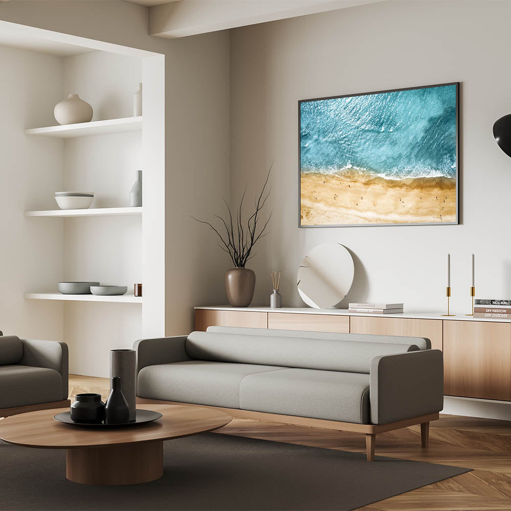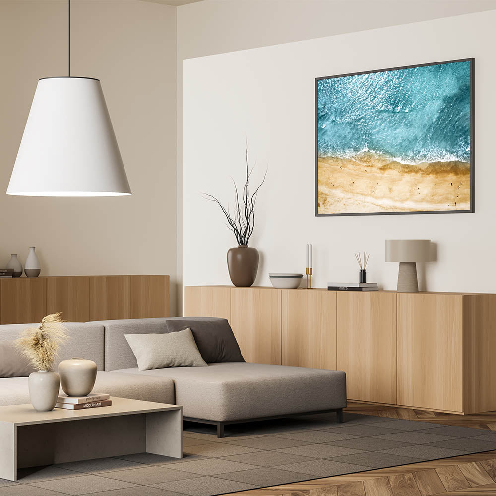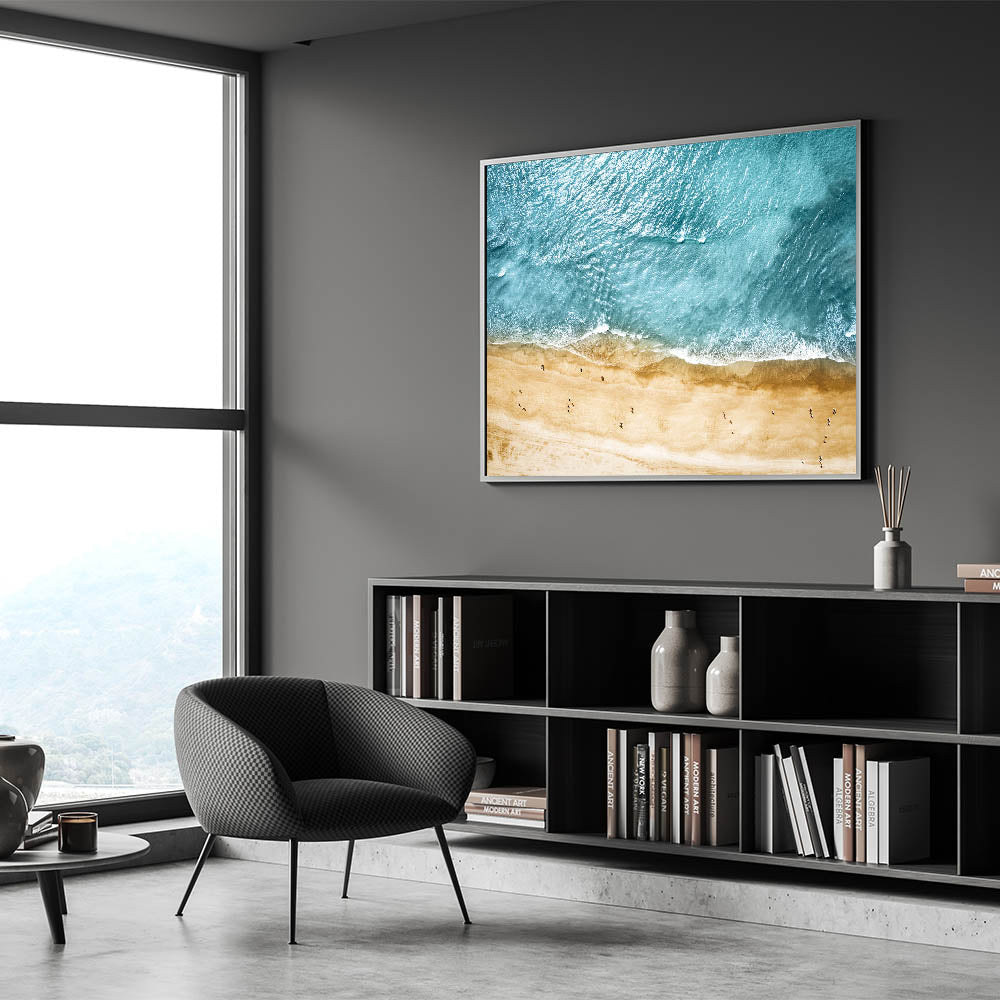 Transform your space with the tranquil beauty of this aerial beach shoreline scene. Perfect for those who love the ocean and want to create a peaceful retreat in their living space.