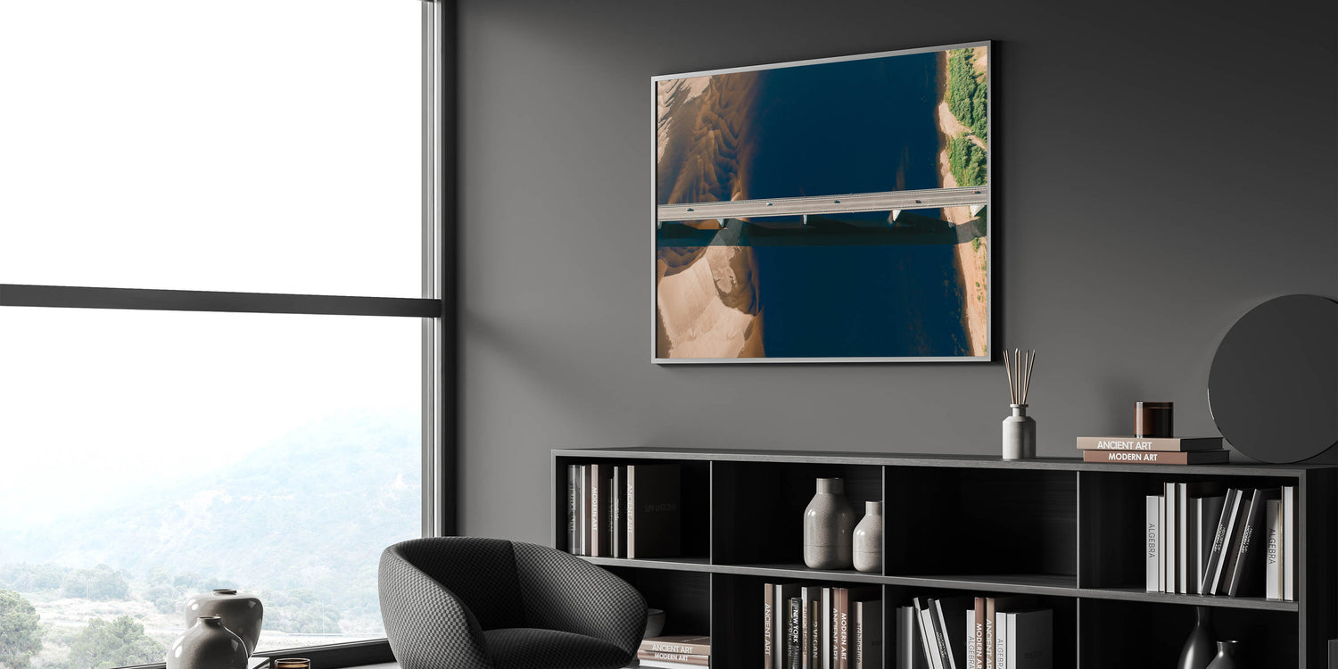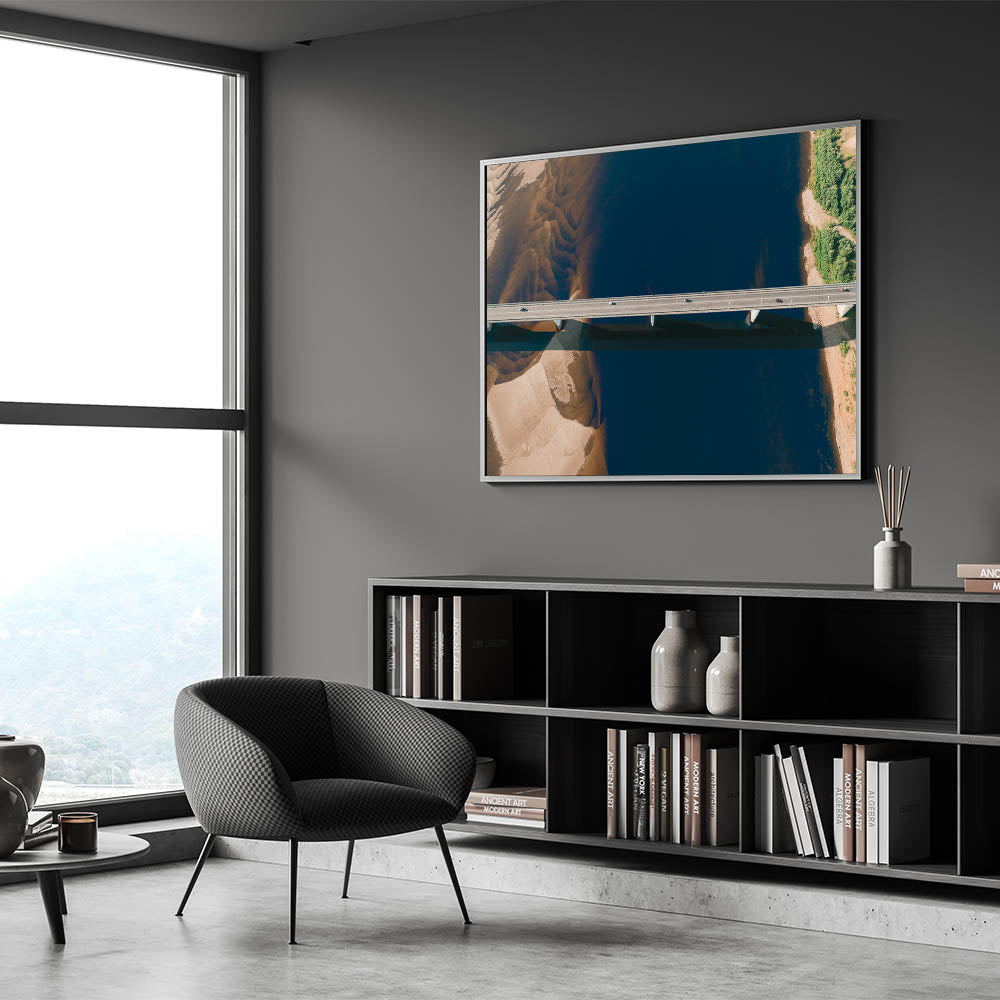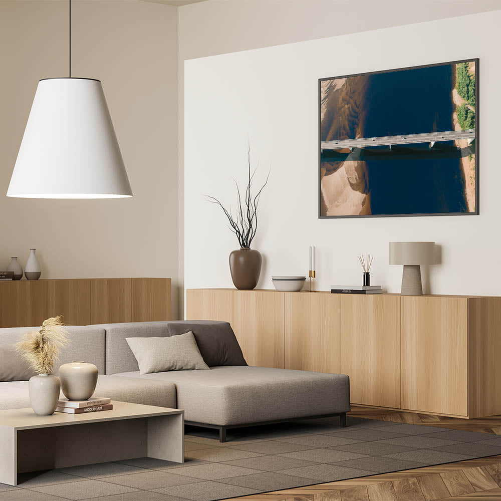 Add a touch of modern elegance to your space with this stunning aerial wall art featuring a bridge spanning a calm, serene river. The minimalist composition of this artwork highlights the stark contrast between the geometric lines of the bridge and the natural beauty of the water and surrounding landscape. The unique aerial perspective provides a fresh and contemporary view, making this piece perfect for any modern home or office.