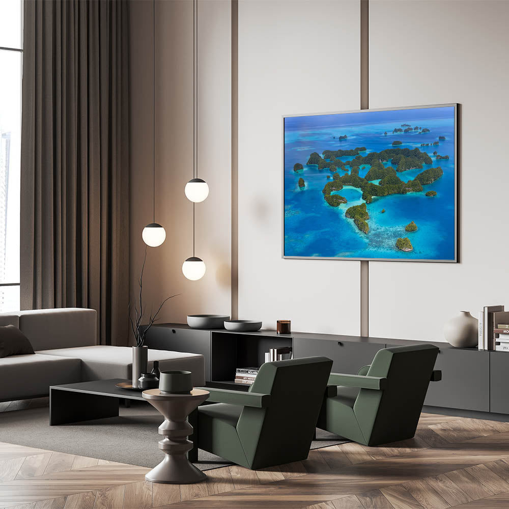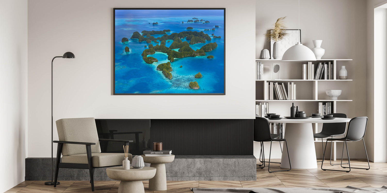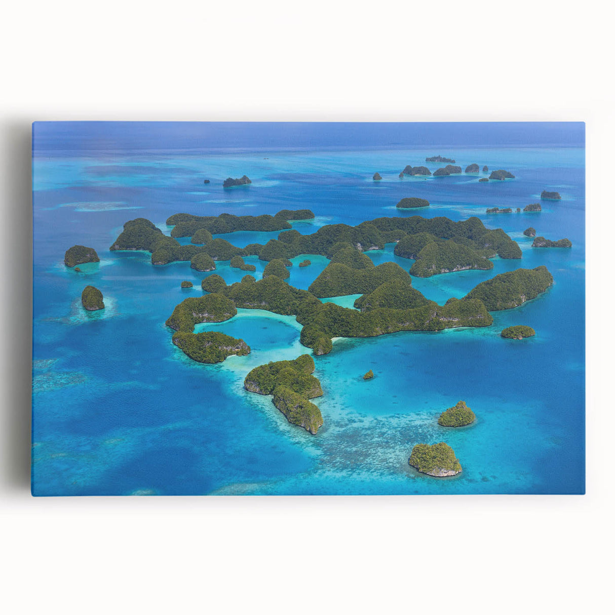 Explore the breathtaking aerial view of Micronesia with our "Aerial View of Micronesia" print, part of our Pacific Ocean Art collection. This magnificent artwork captures the stunning blue waters and lush green islands, offering a bird's-eye view of paradise.