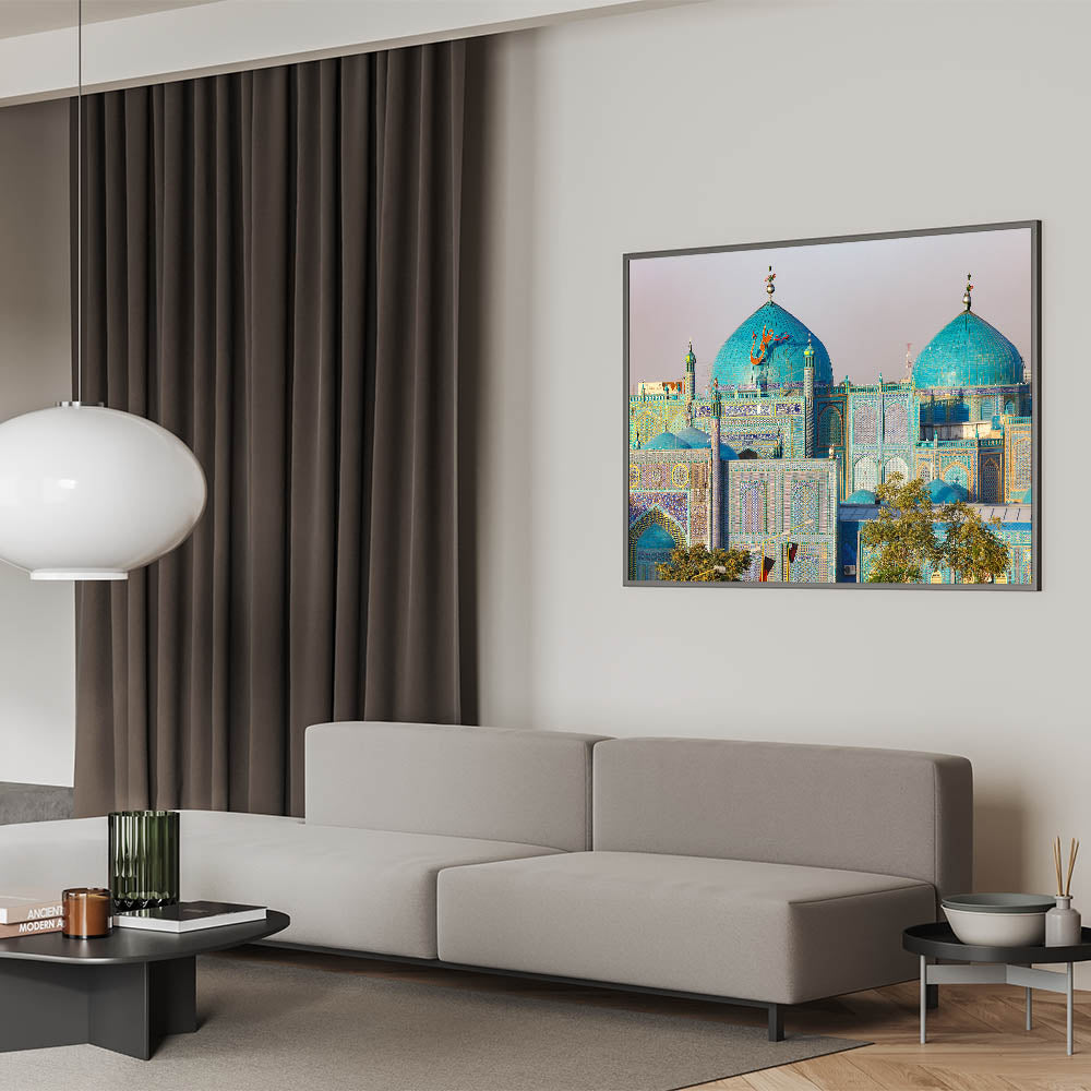 This stunning piece of Afghan wall art captures the vibrant and intricate beauty of a traditional Afghan mosque. The turquoise domes and detailed tile work make this image a true representation of Afghanistan's architectural heritage. The unique color palette and design of this canvas print make it an ideal piece for anyone looking to add a cultural and historic touch to their home decor.
