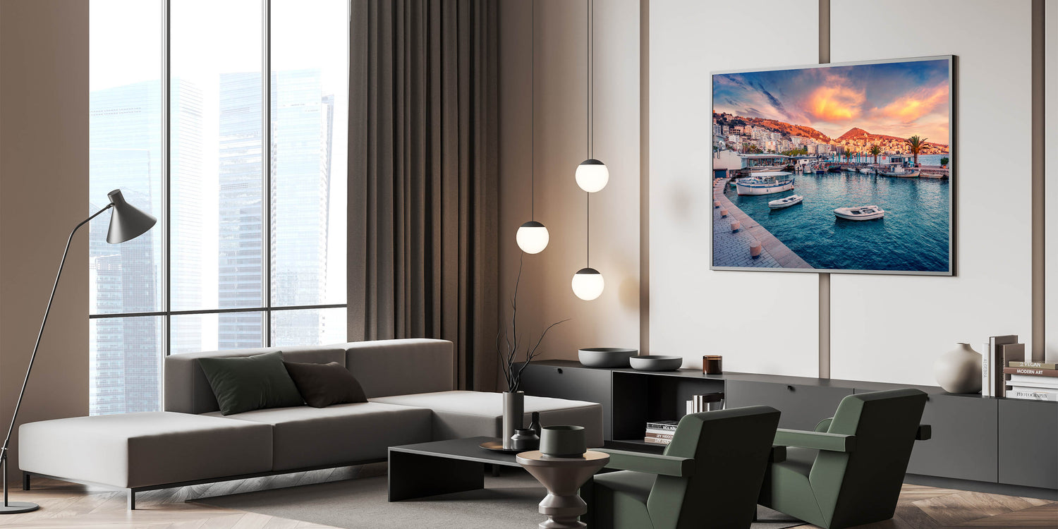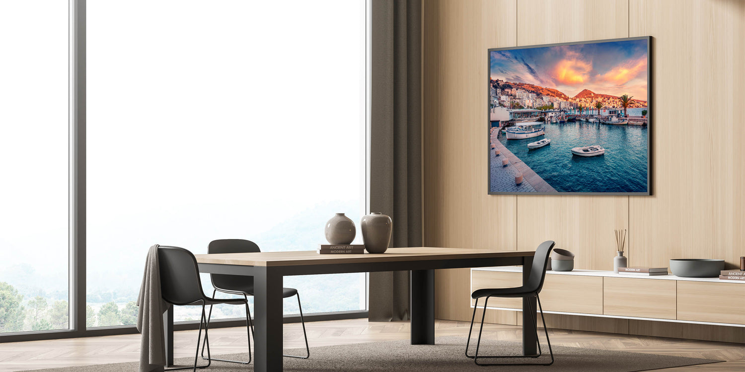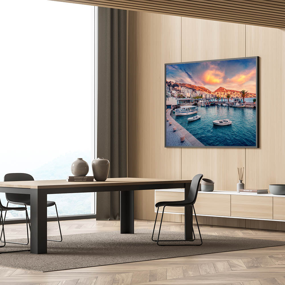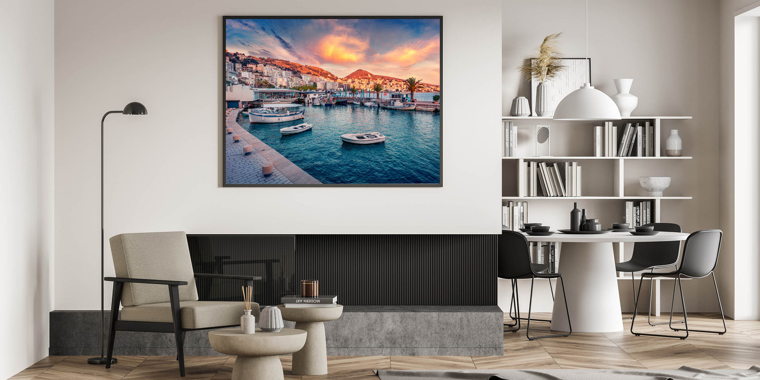 - Albanian Travel Poster: Showcasing the sunset-lit harbor of Saranda, this piece is ideal for beach or coastal-themed interiors.