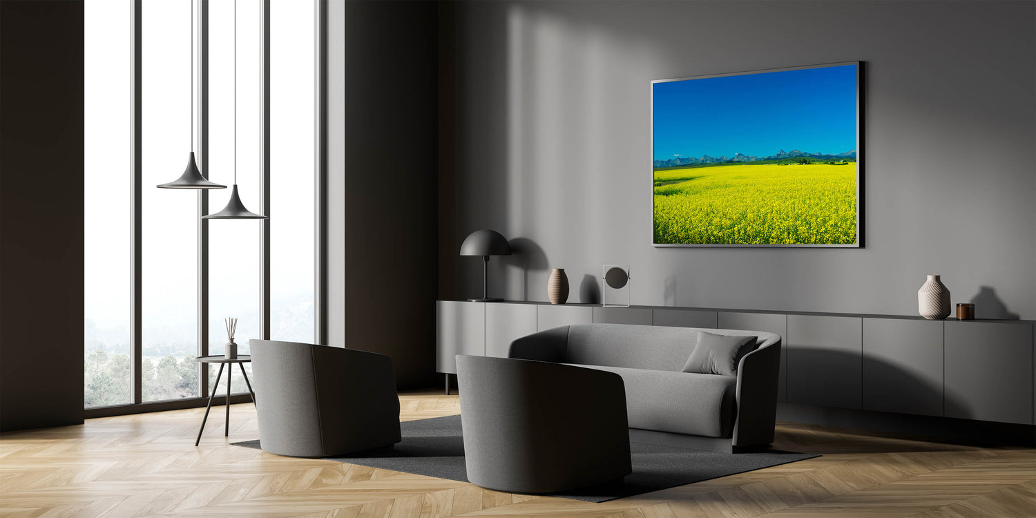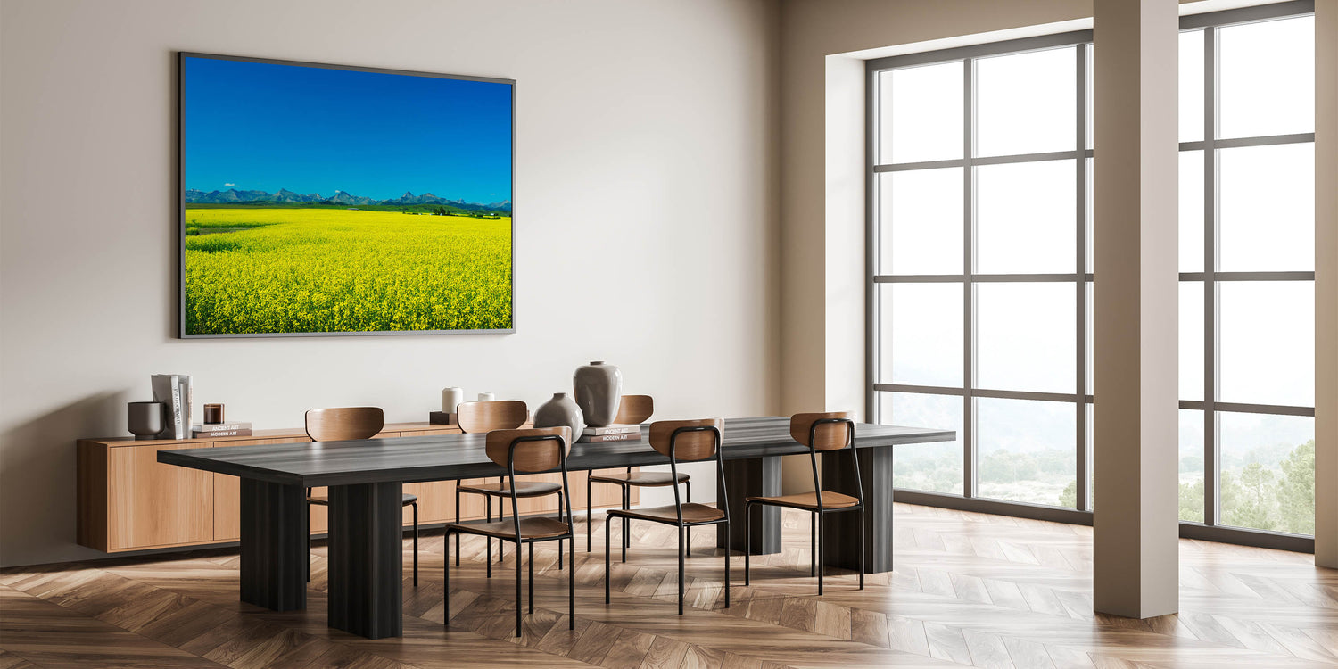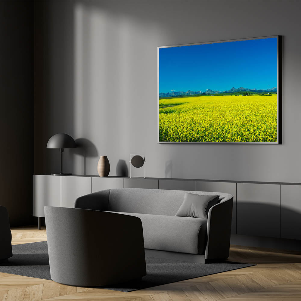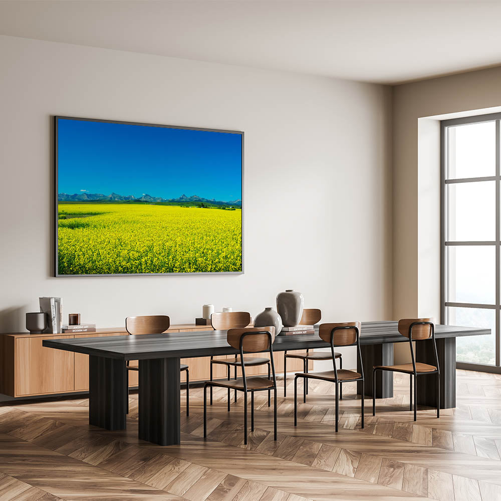 Experience the vibrant beauty of Alberta’s agricultural landscape with this stunning wall art, featuring a bright yellow canola field set against the backdrop of the Rocky Mountains. This Alberta Landscape Art captures the expansive canola fields in full bloom, their vivid yellow flowers contrasting beautifully with the deep blue sky and the rugged mountain range in the distance. The crisp, clear colors and the wide-open space create a sense of freedom and tranquility, making this piece a perfect addition to any home.