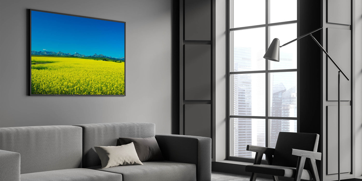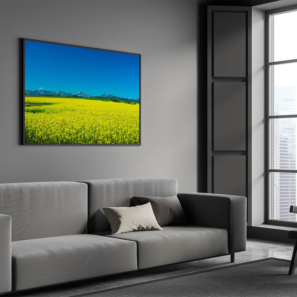 Alberta Bright Canola Art - Landscape Bright Canola Field with Rocky Mountain Backdrop