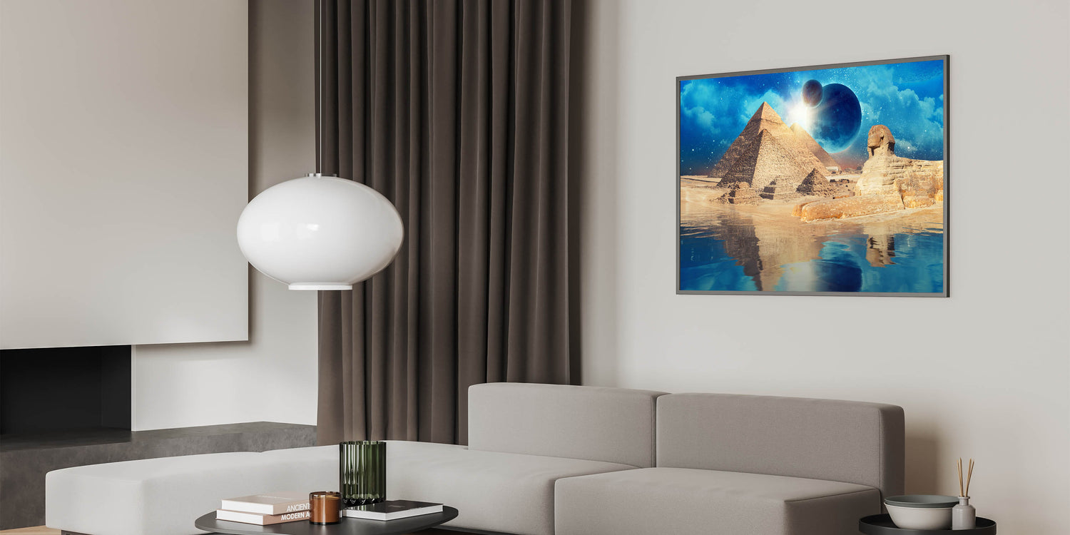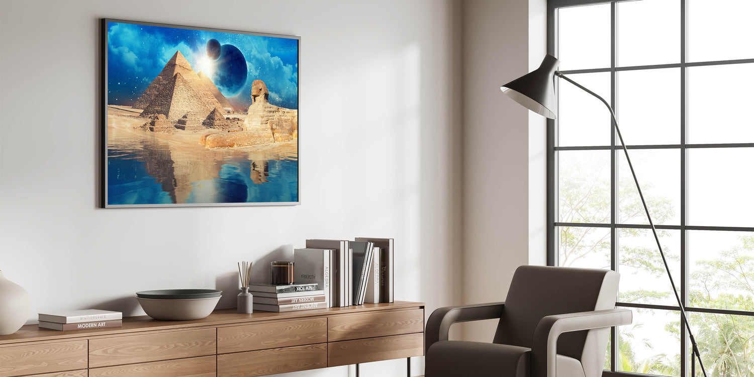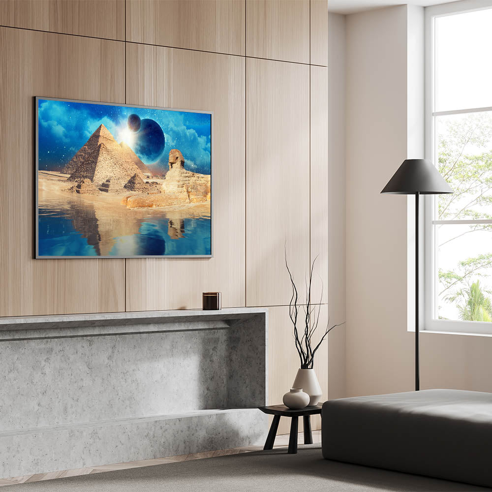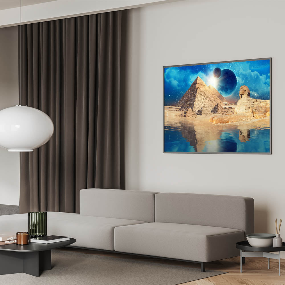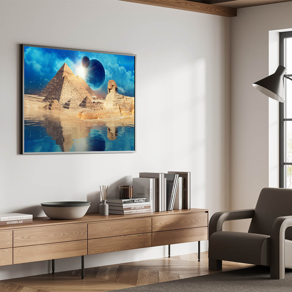 - Vivid Details: The artwork showcases intricate details of the Egyptian pyramids, the Sphinx, and a breathtaking cosmic sky, enhancing the depth and beauty of the scene.