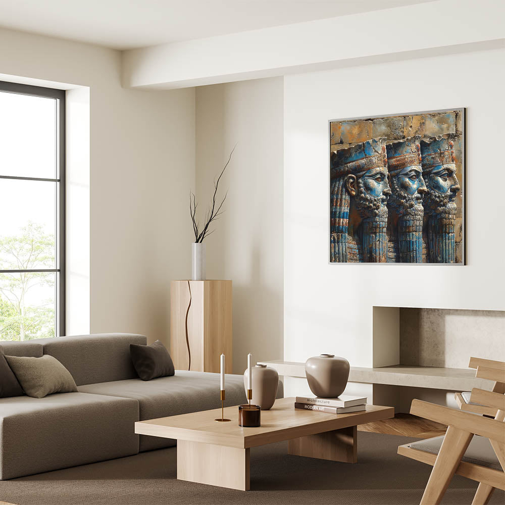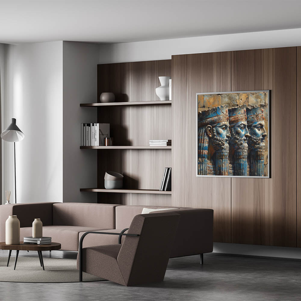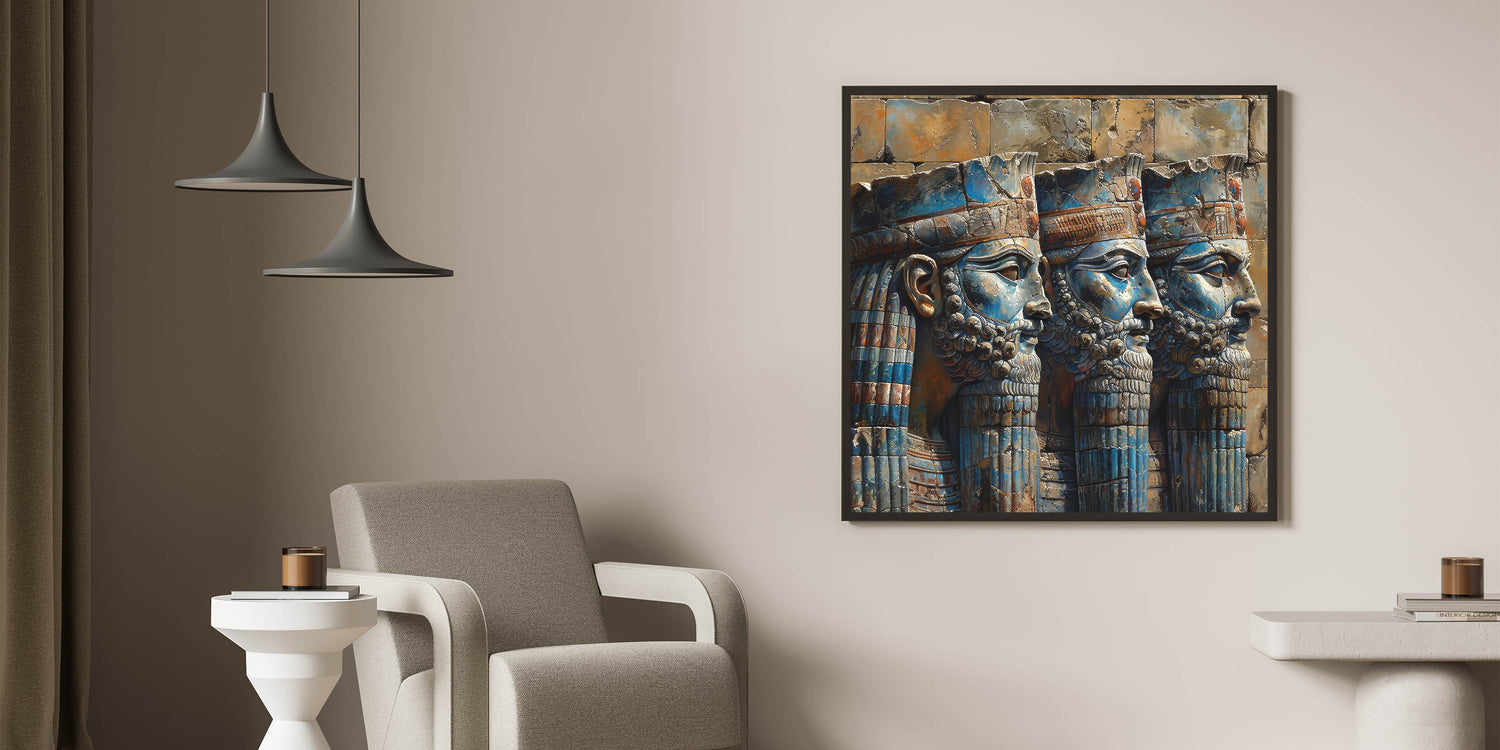Step back into the grandeur of ancient Mesopotamia with this breathtaking Ancient Kings of Mesopotamia wall art. The detailed relief features three regal figures, each carved with intricate patterns and rich textures, embodying the power and majesty of Mesopotamian royalty. The cool blue hues combined with earthy tones add a weathered yet timeless look, giving the impression of a historical artifact brought to life. The artistry in this piece celebrates the cultural heritage and legacy of one of the world’s oldest civilizations.